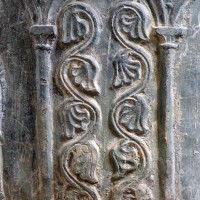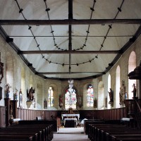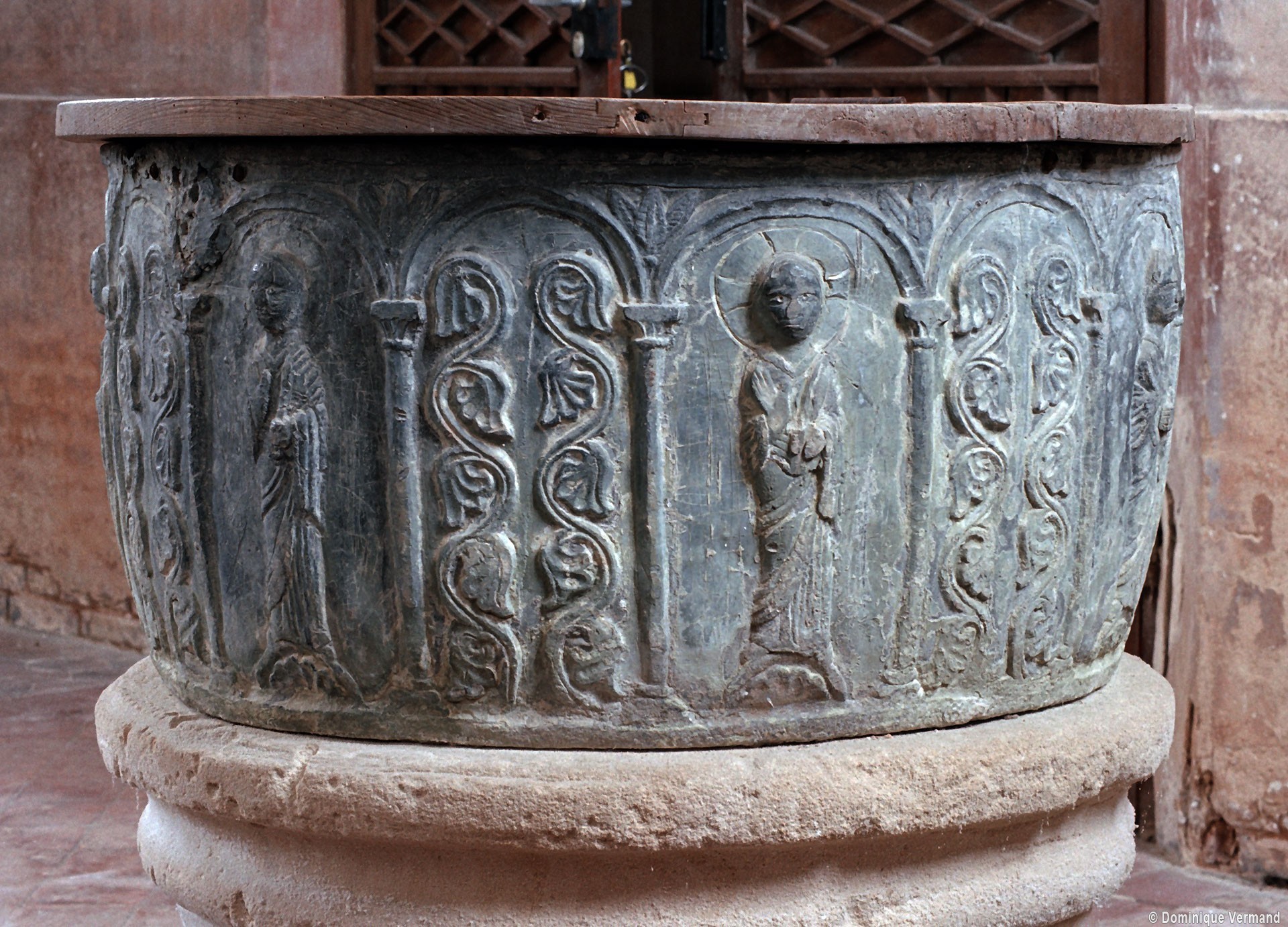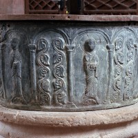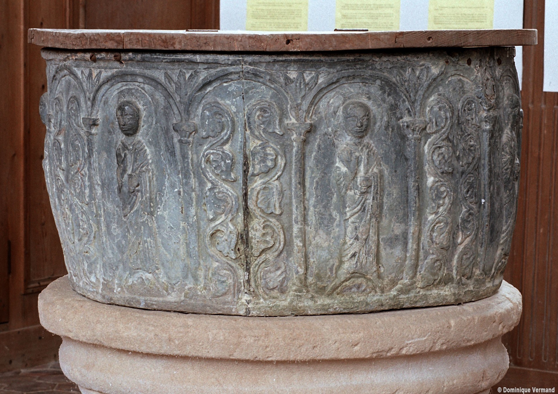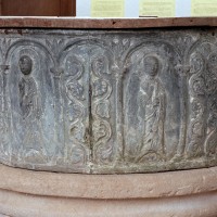 Saint-Martin possède par ailleurs un véritable trésor avec sa cuve baptismale en plomb, du 12ème siècle. Les sept plaques qui la composent sont décorées d’arcatures romanes qui abritent en alternance un décor végétal et des personnages parmi lesquels on reconnaît le Christ bénissant ou encore saint Pierre, avec sa clef. Dans l’abside, deux fenêtres ont conservé des vitraux du 16ème siècle remontés maladroitement (2006).
