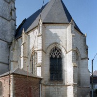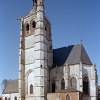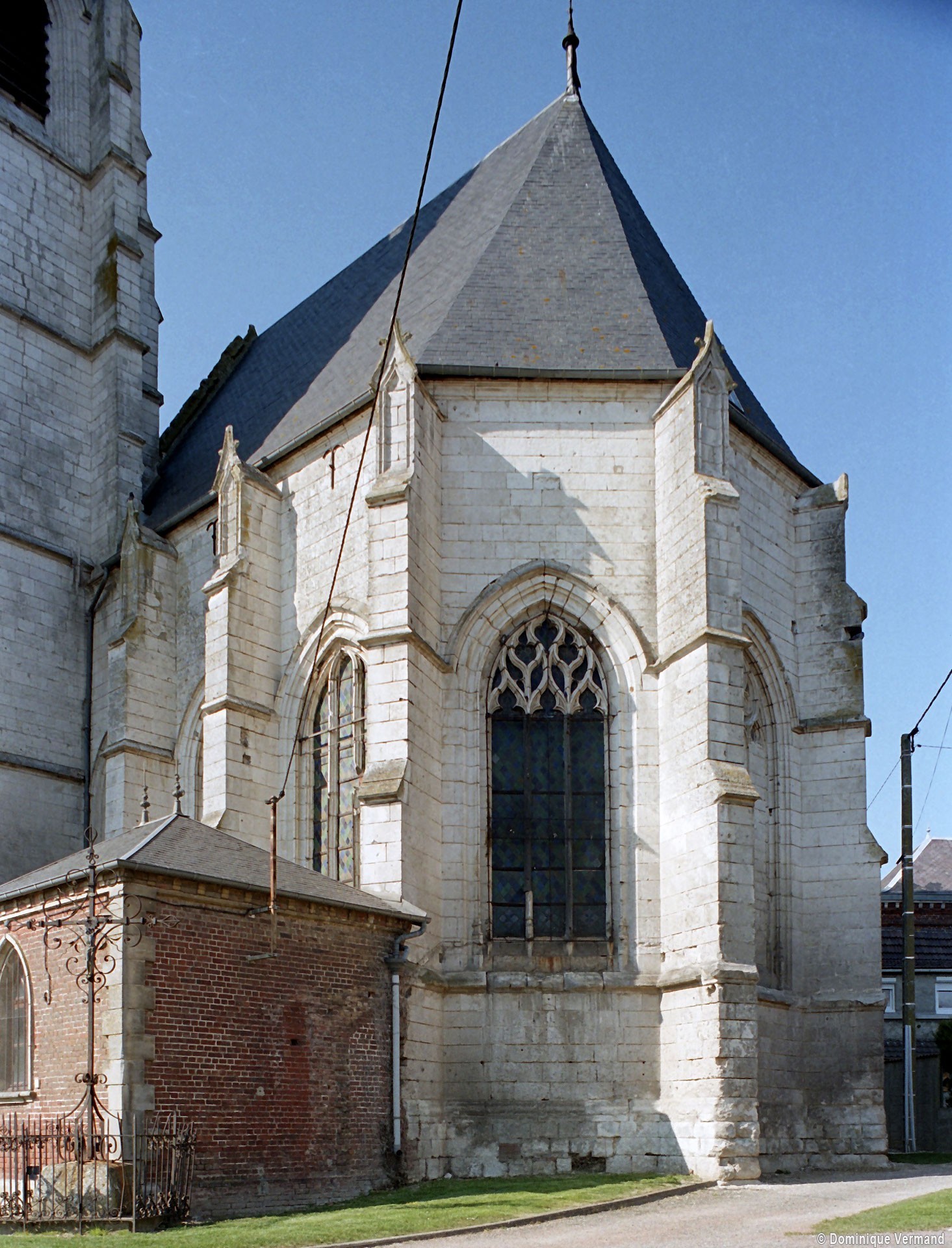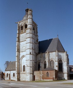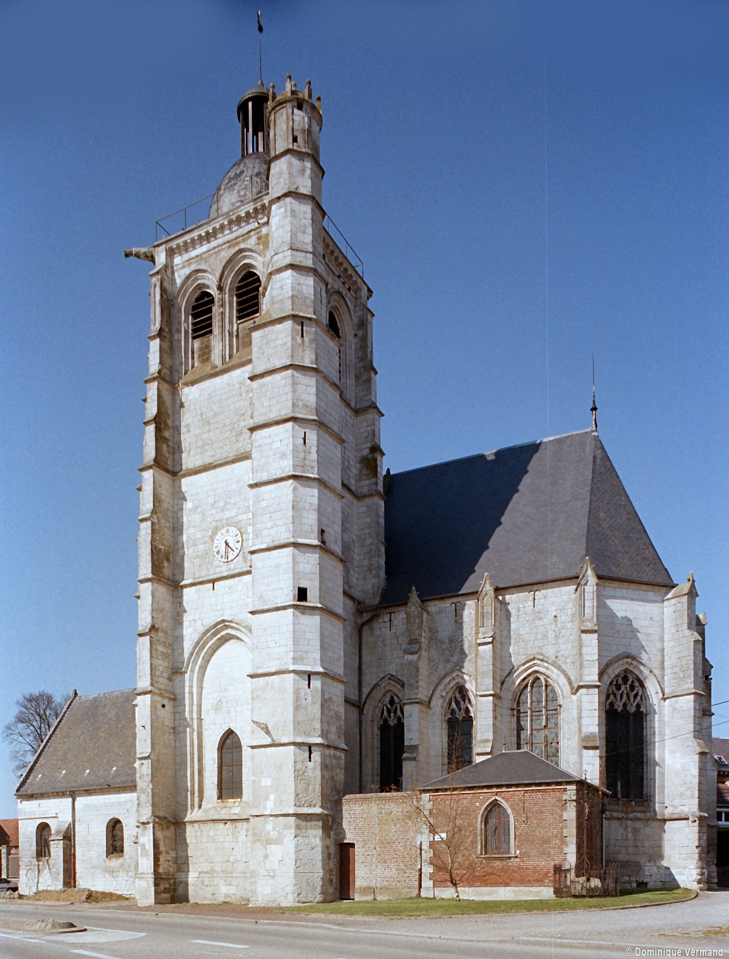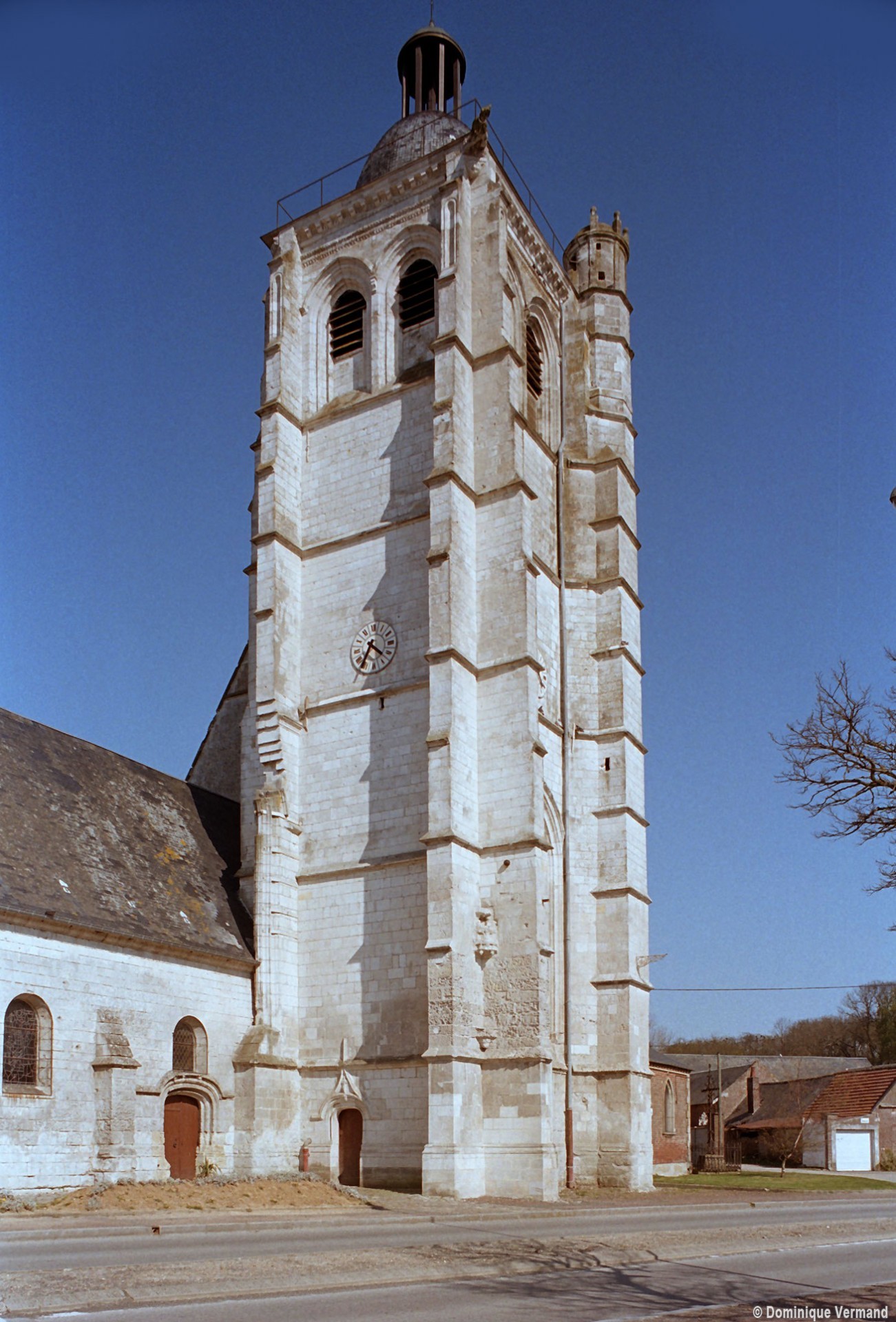 Contemporain du chœur, le clocher est une tour élevée, puissante et à l’aspect quelque peu austère dû à l’absence d’ouverture sur les trois-quarts de son élévation après que la grande fenêtre qui s’ouvrait au rez-de-chaussée ait été bouchée. Une tourelle d’escalier en marque l’angle sud-est. Des larmiers rythment à intervalles réguliers les contreforts et la tourelle. Le beffroi est ajouré par deux baies géminées (jumelles) sur chaque face. Si leur forme et leur mouluration sont encore pleinement gothiques, il n’en est pas de même de la corniche, de la partie supérieure de la tourelle et du dôme avec lanternon qui appartiennent pleinement au style de la Renaissance. Au milieu du 16ème siècle un tel mélange des styles est assez courant en Picardie.