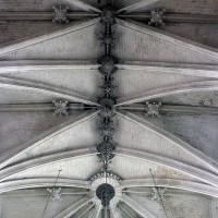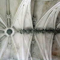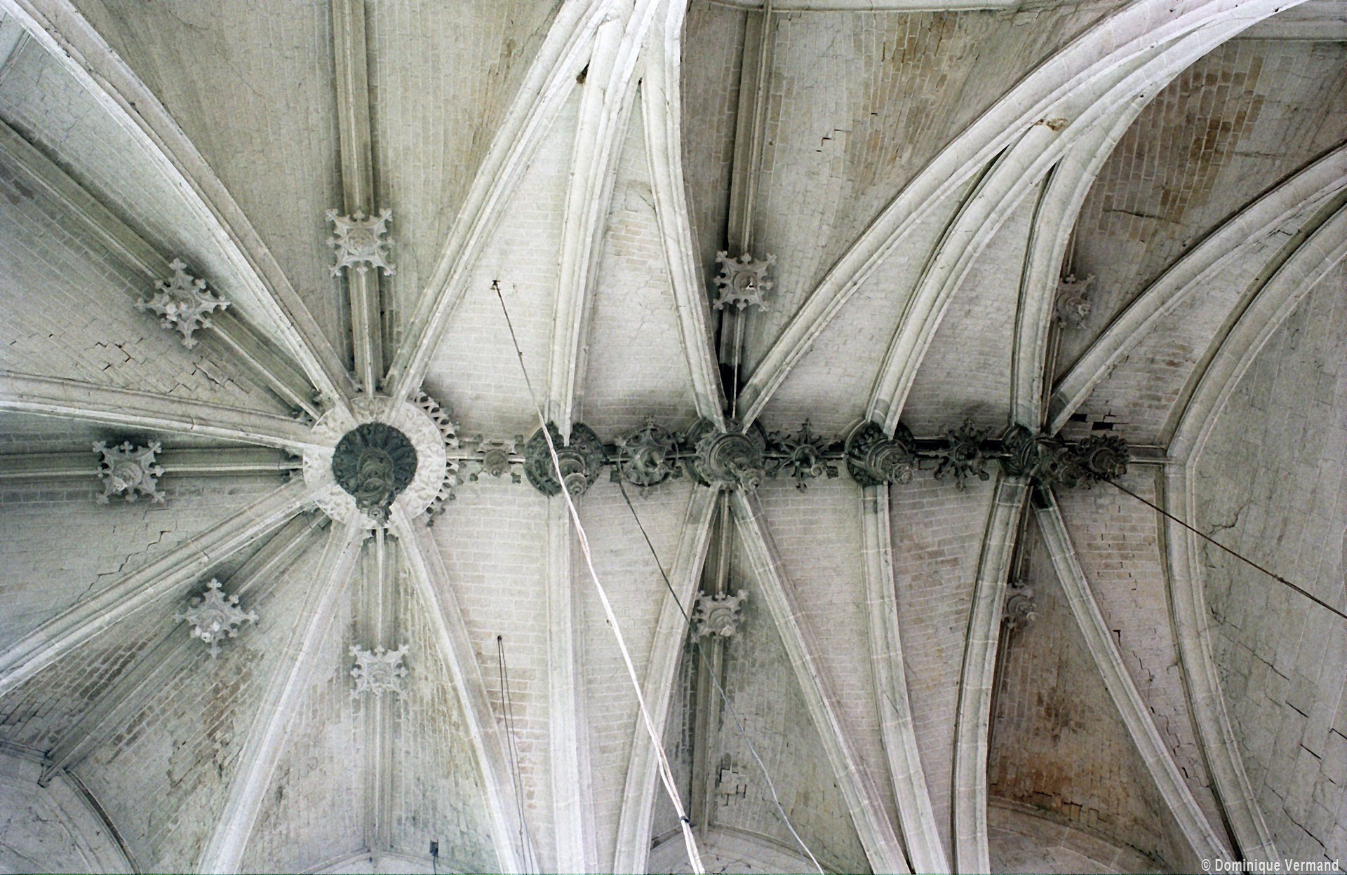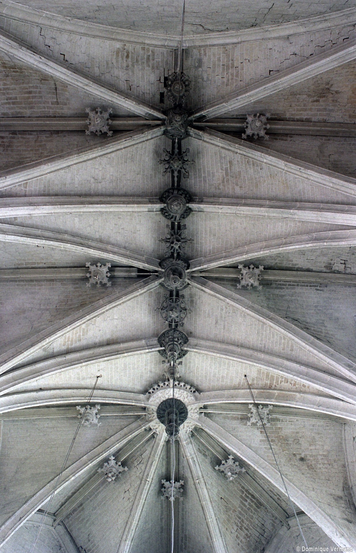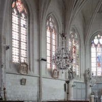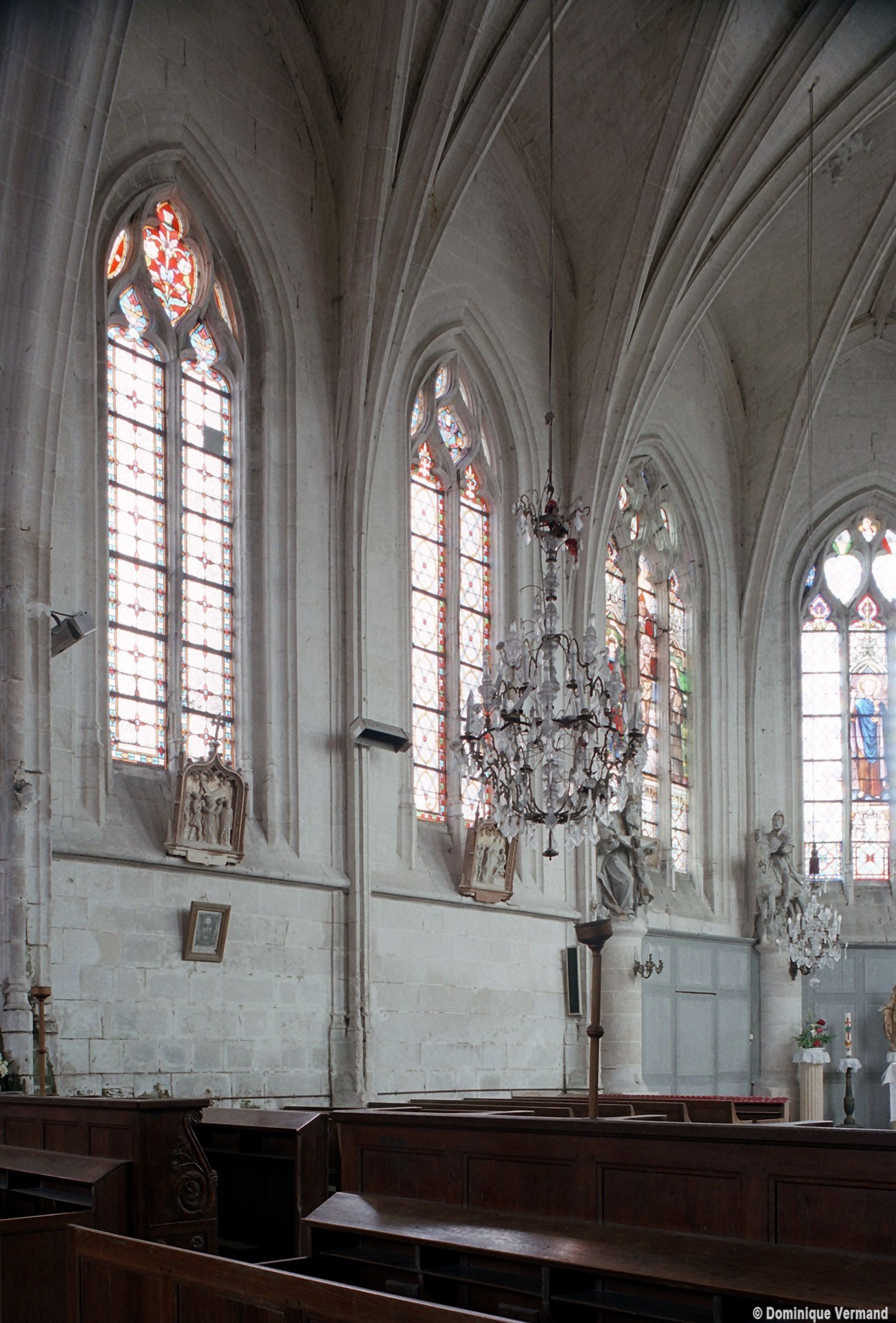 A l’intérieur, l’ensemble produit une grande impression d’unité. Les neuf fenêtres, toutes de même hauteur, prennent appui sur un soubassement nu terminé en larmier qu’interrompt à intervalles réguliers la retombée des voûtes. Les fenêtres sont divisées en trois lancettes dans l’abside et deux dans les travées droites et montrent en partie supérieure un beau réseau flamboyant qui comporte de légères variantes. Au sud, une fenêtre est plus simple. Comme c’est parfois le cas à cette époque, ces fenêtres n’atteignent pas la lunette de la voûte et une portion de mur nu subsiste au-dessus.