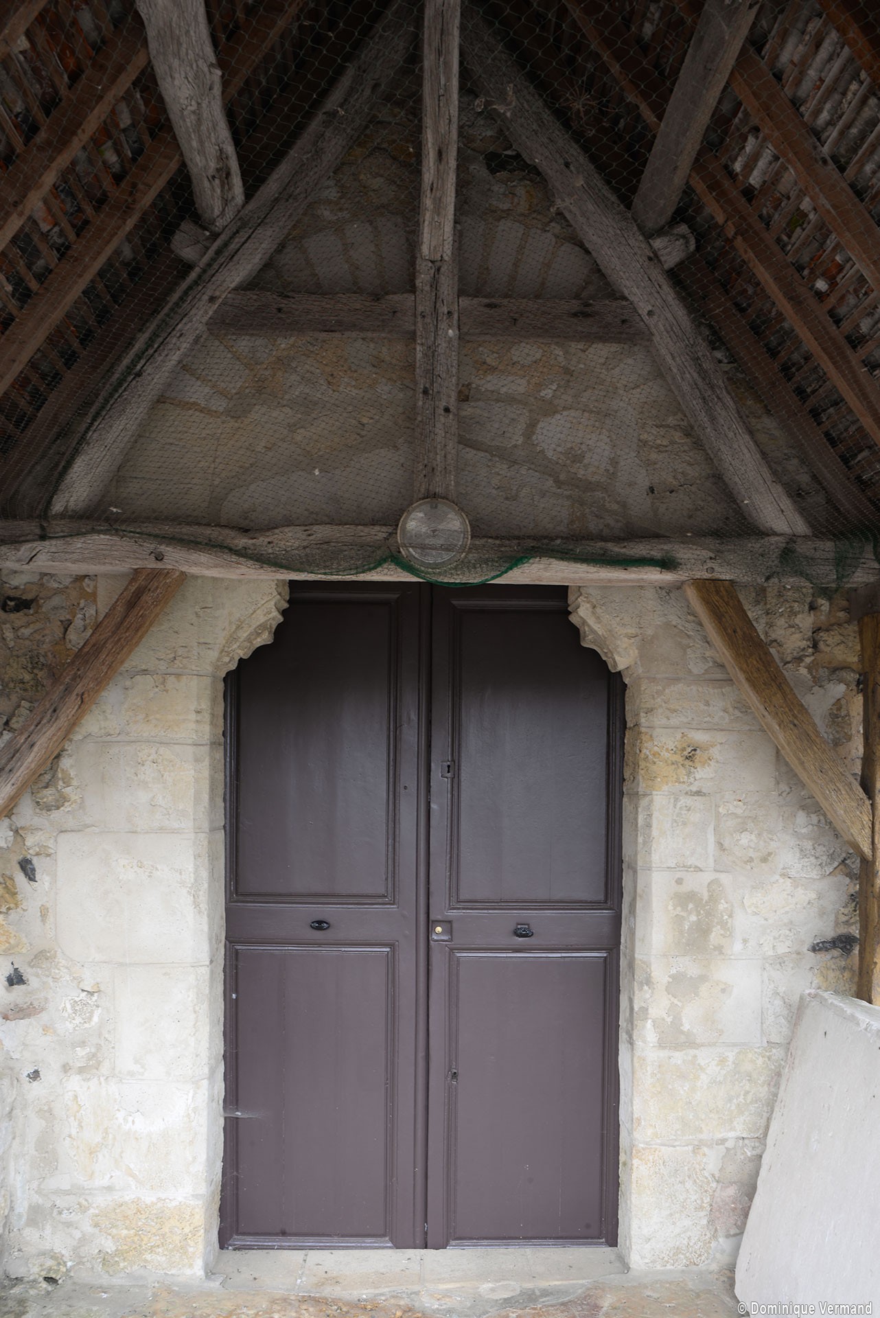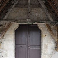 Celle-ci a par ailleurs conservé deux portes d’origine qui témoignent des techniques de construction en usage à l’époque. La première est percée à l’ouest et constituait l’entrée principale de l’église. Un petit porche tardif la dissimule en partie mais elle reste néanmoins lisible. Deux corbeaux saillants décorés de deux cartouches rectangulaires emboités surmontent les piédroits et reçoivent un linteau en bâtière. L’ensemble est circonscrit par un arc en plein cintre constitué de nombreux claveaux étroits. Au niveau du linteau, à gauche, ces claveaux sont simplement gravés dans un gros bloc de pierre. Il en était de même à droite mais des réparations l’ont fait disparaître.