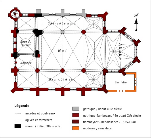 Après la Guerre de Cent ans, sans doute fatale à la nef, l’église subit une nouvelle fois de profondes transformations. Au sud, un bas-côté vient faire pendant à celui du nord et une nouvelle façade réunit dans une composition harmonieuse et raffinée, expression parfaite du gothique flamboyant, des parties jusque-là disparates.