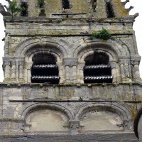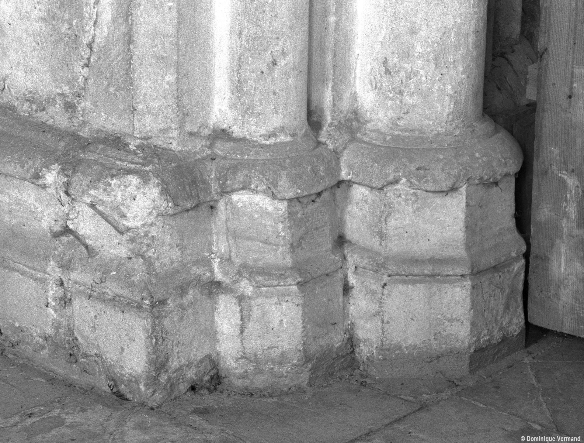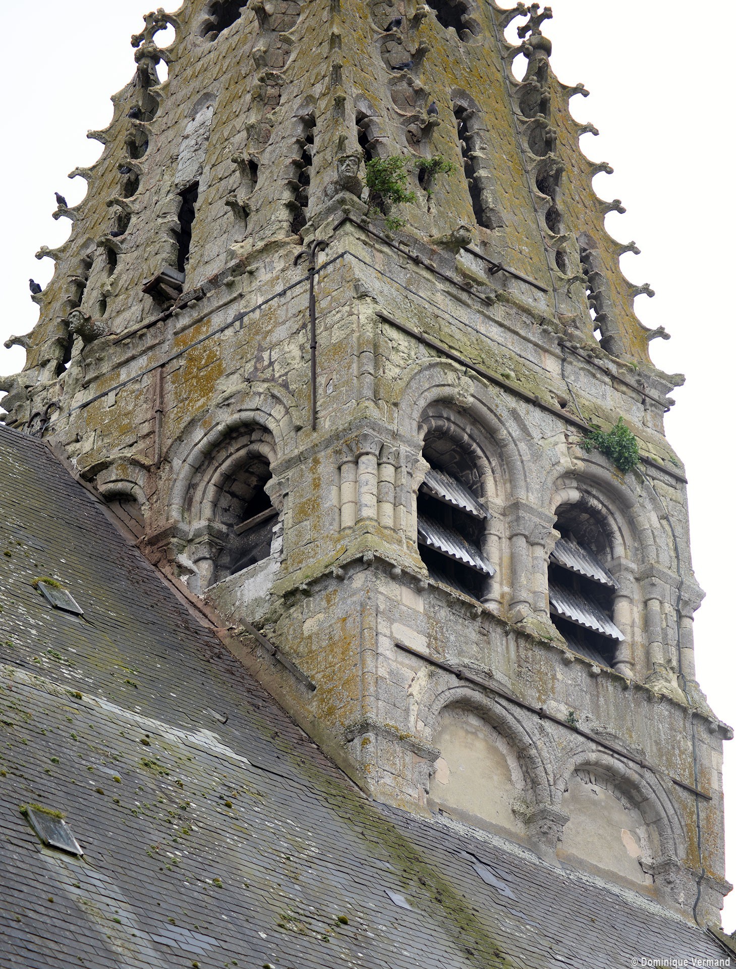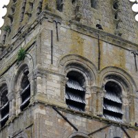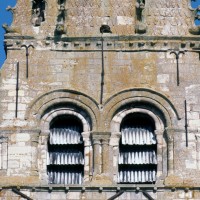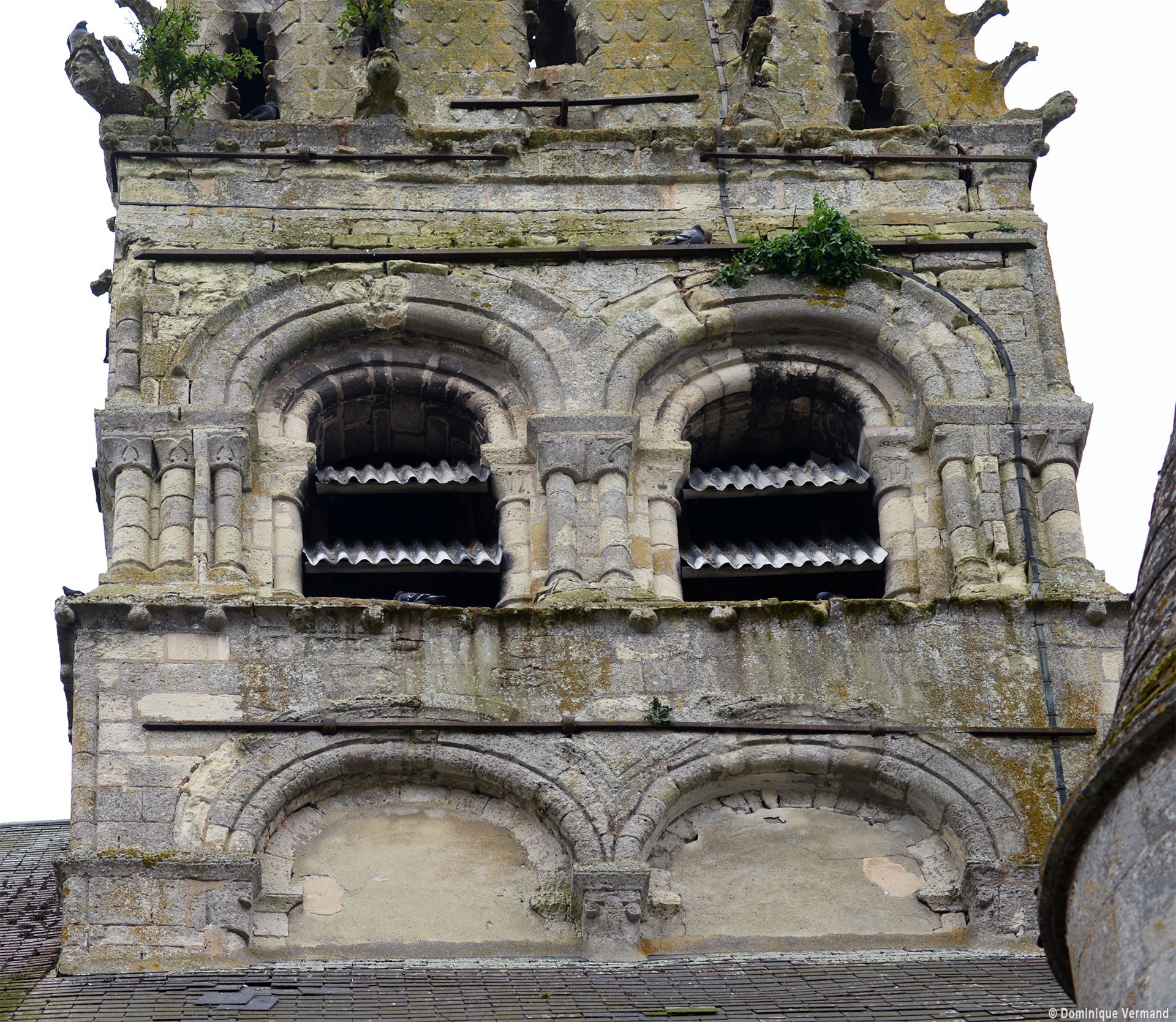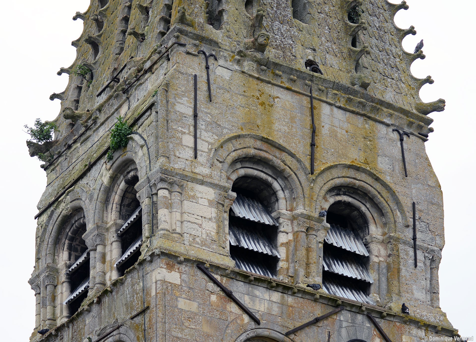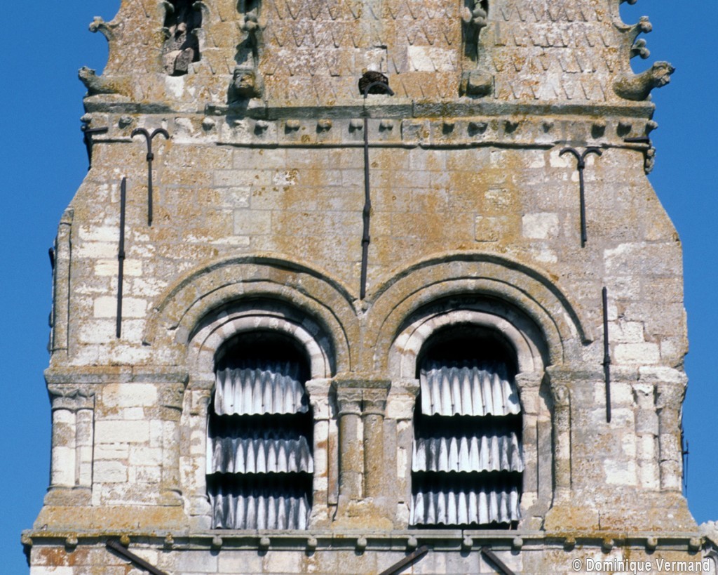 La partie la plus ancienne est le clocher, qui comportait initialement deux étages de baies géminées en plein cintre garnies de colonnettes. Seul le second étage est totalement visible aujourd’hui et le style de ses chapiteaux indique le milieu du 12ème siècle. A la base, quelques éléments d’arcades et des tailloirs montrent que ce clocher était à l’origine une tour de croisée et non un clocher porche comme on l’a parfois écrit : sa position actuelle en façade résulte en fait de la disparition de la nef qui, jusqu’au 15ème siècle, s’étendait à l’ouest. Rien n’est connu sur cette nef ni sur le chœur qui accompagnaient alors ce clocher.