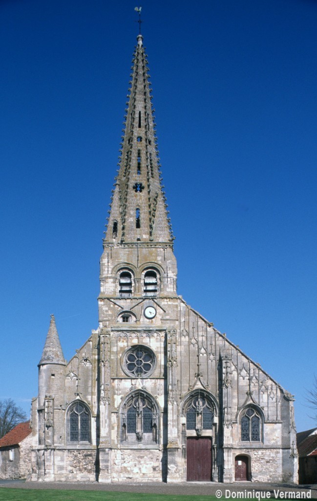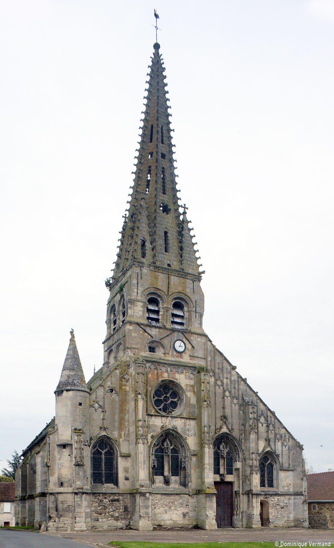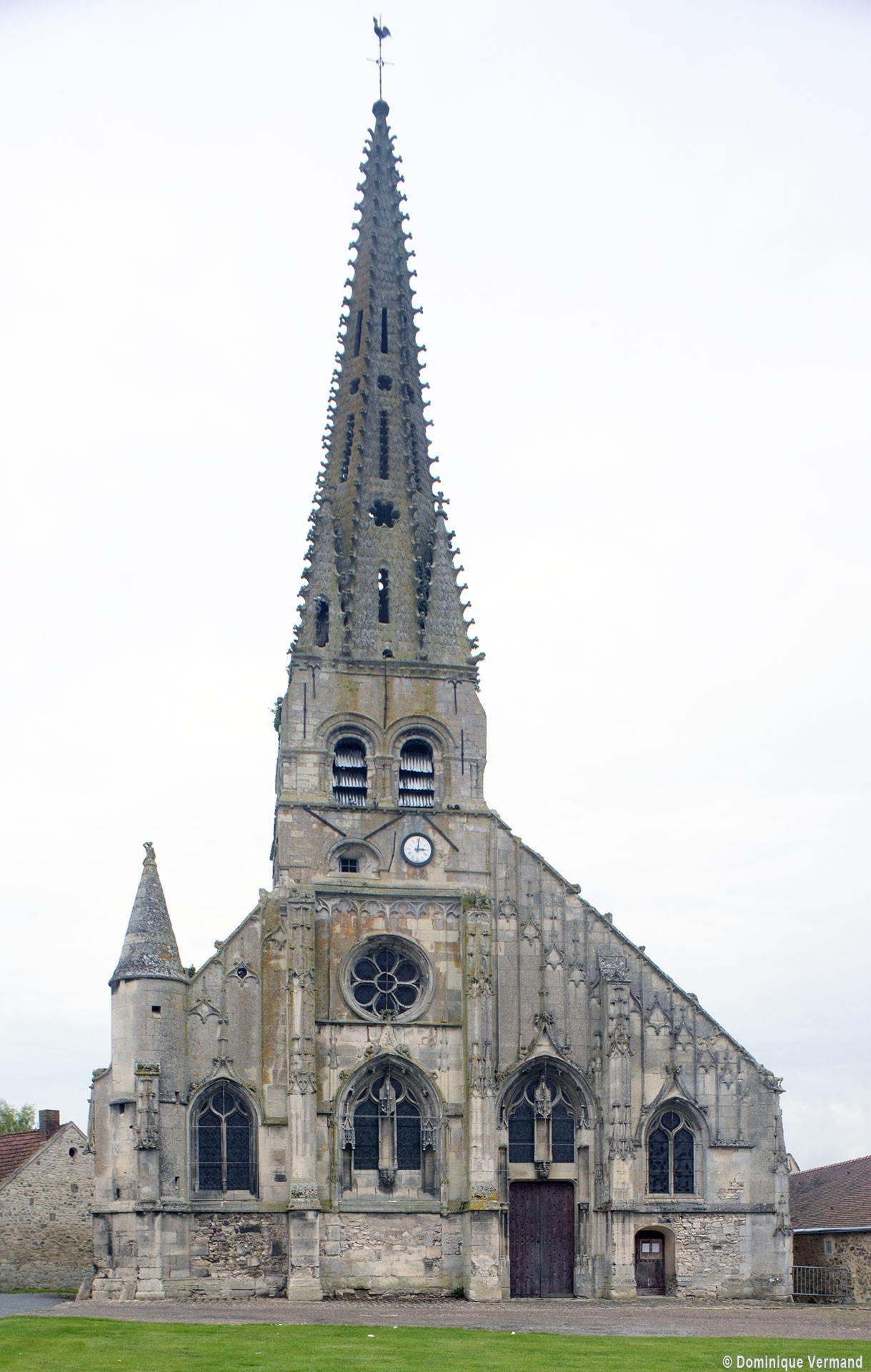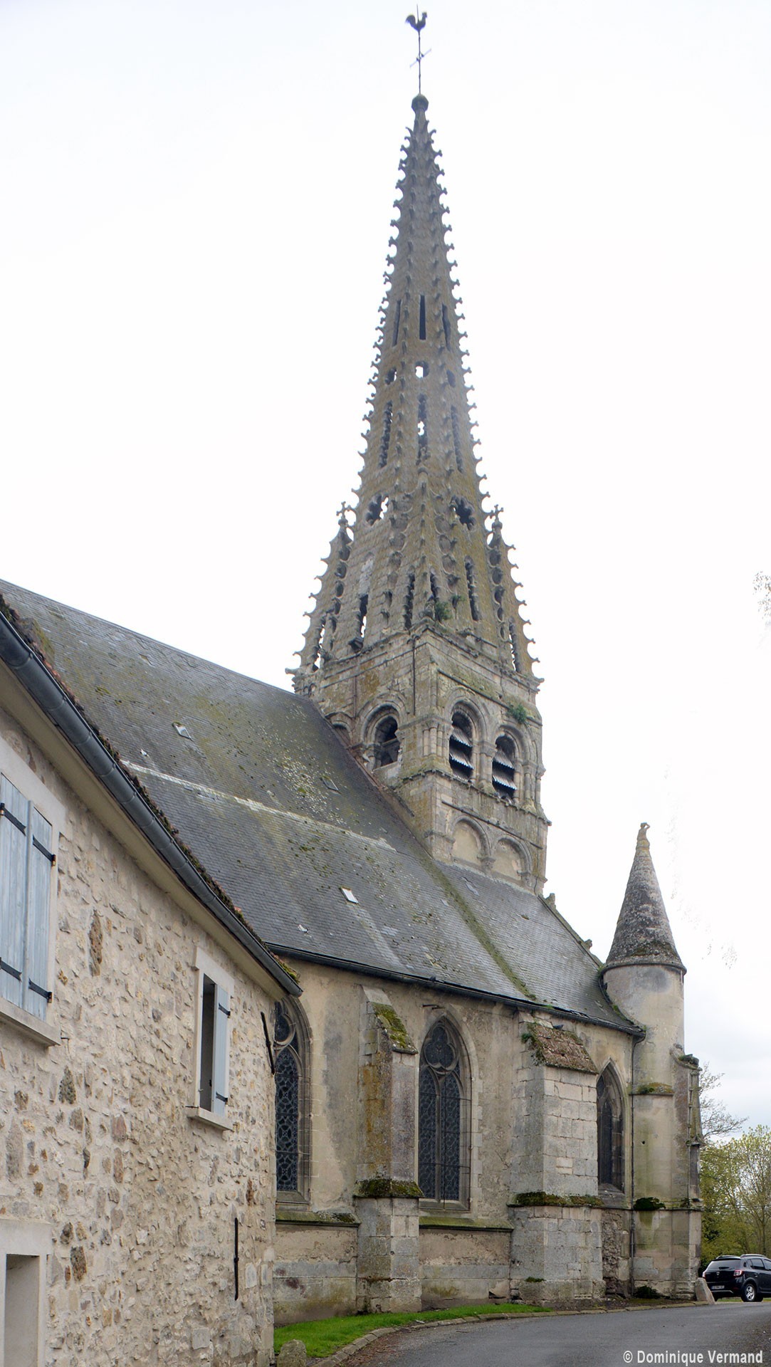 C’est également de cette époque que date la belle flèche octogonale en pierre ajourée d’ouvertures rectangulaires ou polylobées et aux arêtes garnies de crochets. Des petites pyramides occupent les angles de la tour selon un schéma classique que l’on retrouve non loin de là à Baron, Montagny-Sainte-Félicité, Versigny et Plailly, ces deux dernières bâties sans doute par le même atelier.