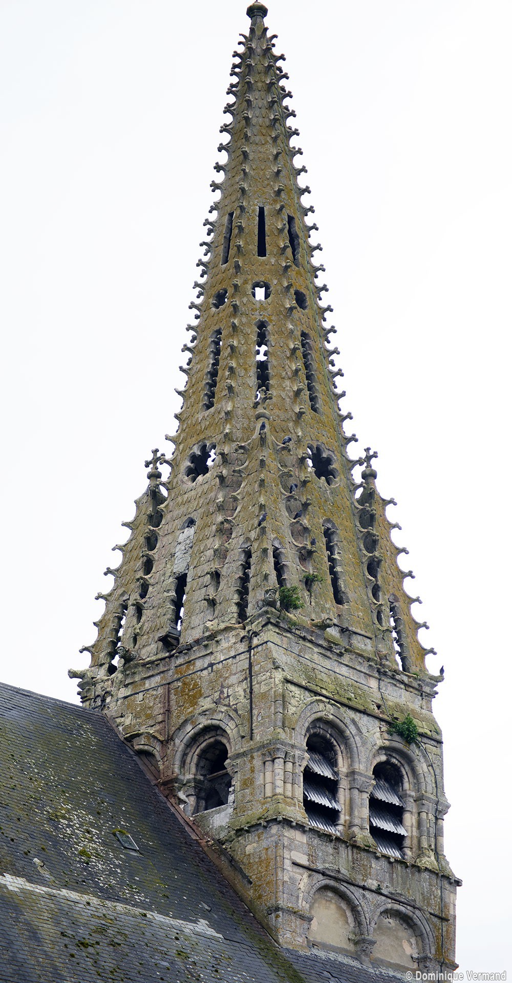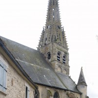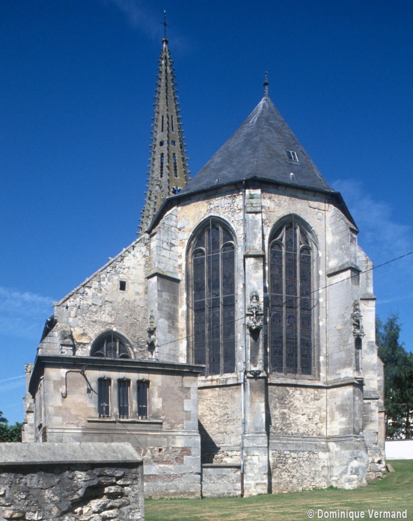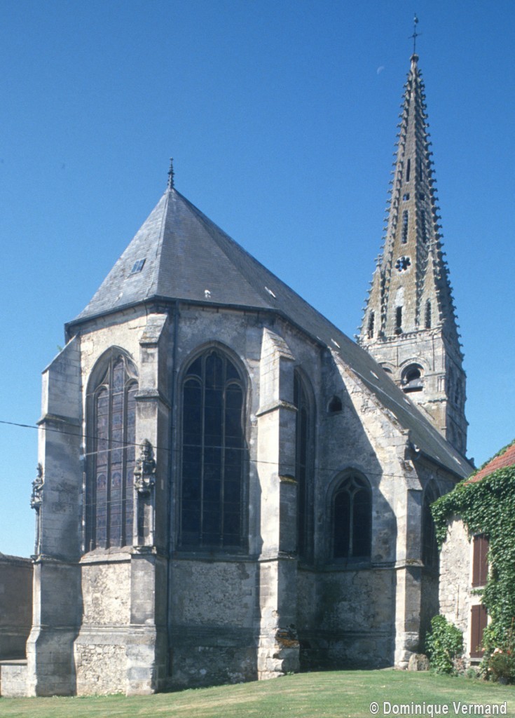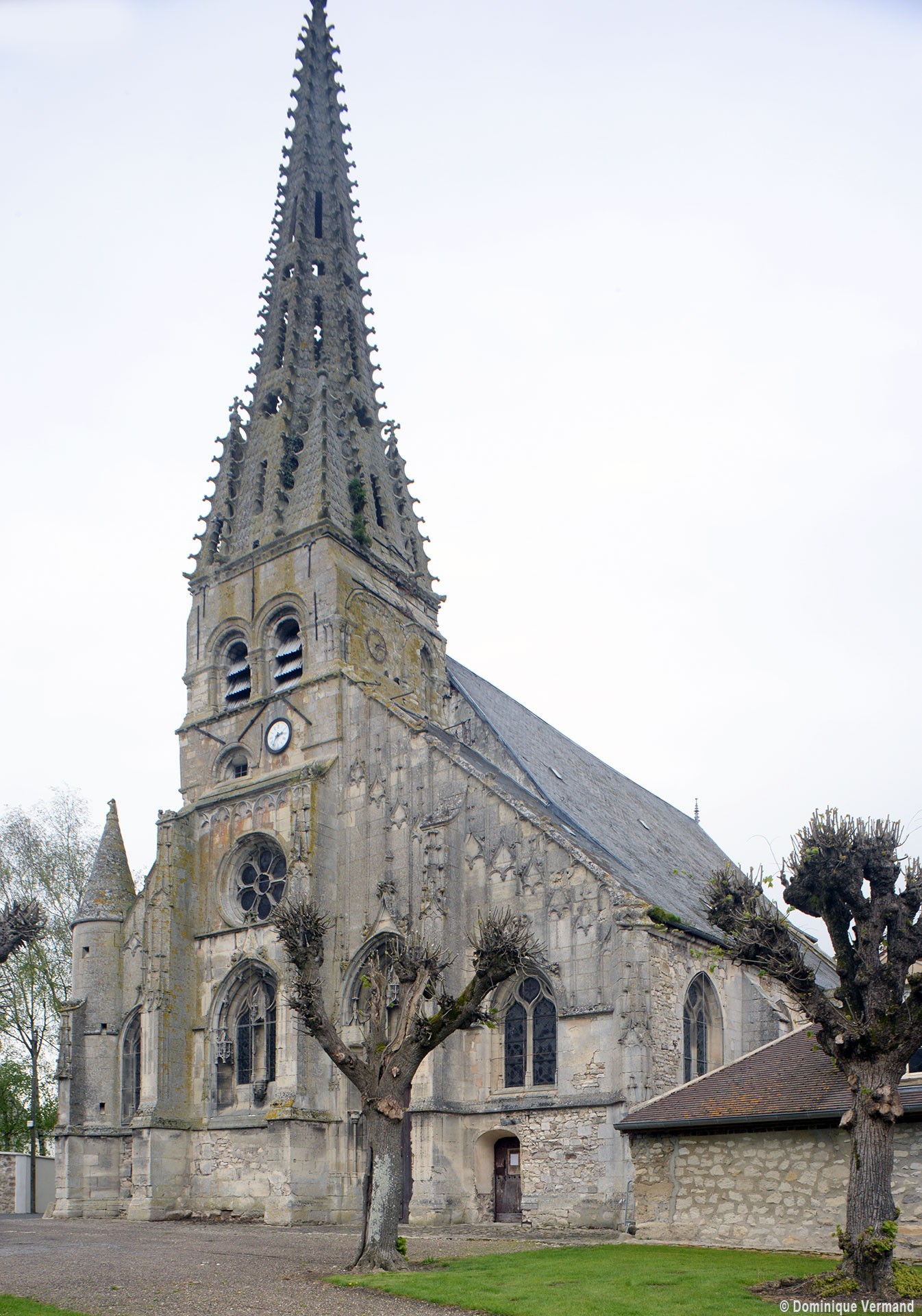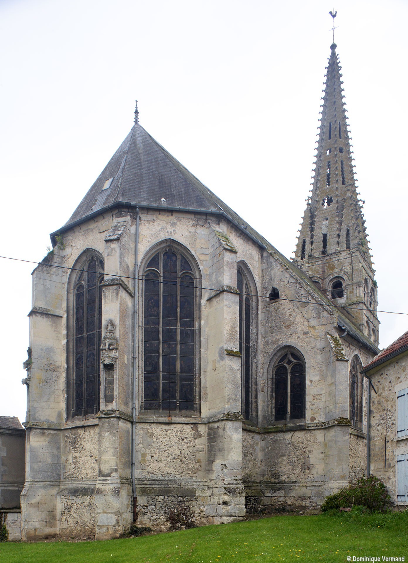 C’est également de cette époque que date la belle flèche octogonale en pierre ajourée d’ouvertures rectangulaires ou polylobées et aux arêtes garnies de crochets. Des petites pyramides occupent les angles de la tour selon un schéma classique que l’on retrouve non loin de là à Baron, Montagny-Sainte-Félicité, Versigny et Plailly, ces deux dernières bâties sans doute par le même atelier.