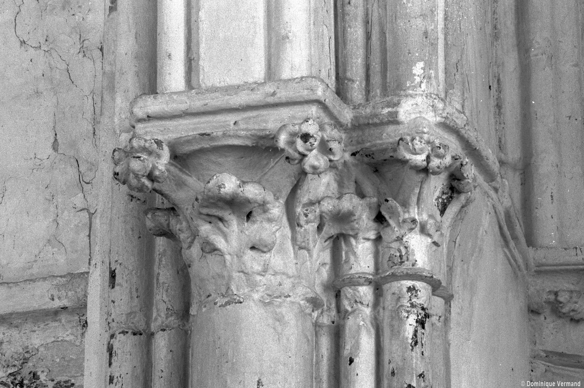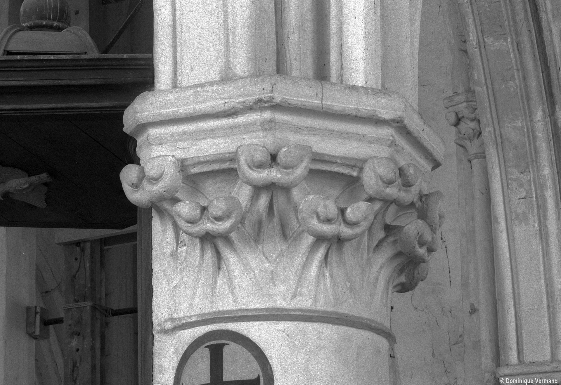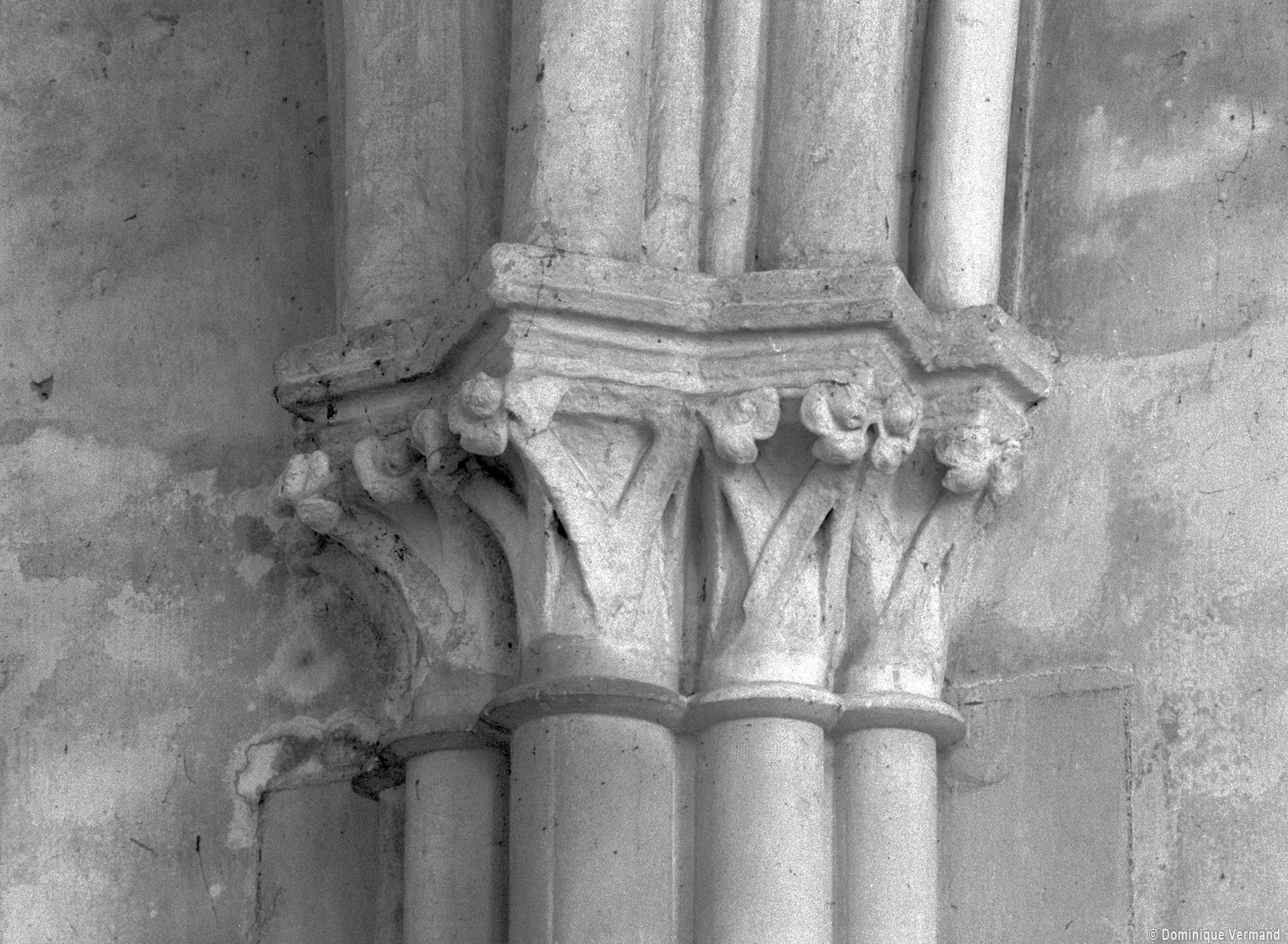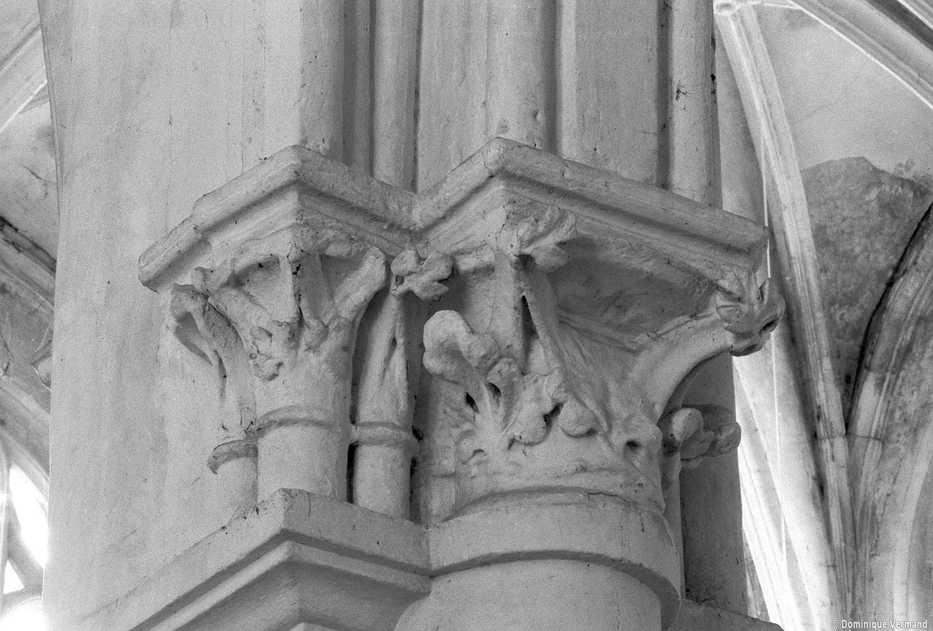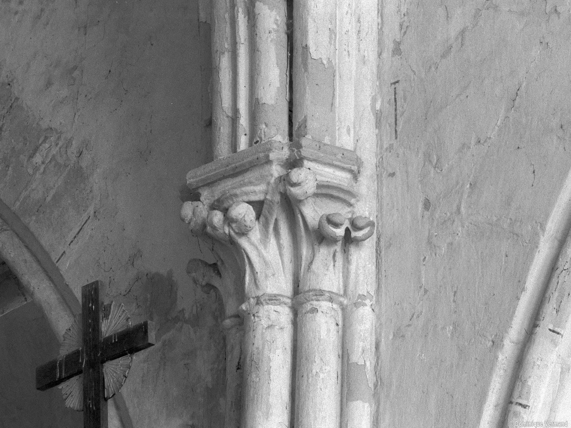 Vers le milieu du 13ème siècle, ce chœur est démoli pour faire place à un ensemble plus ambitieux comprenant un vaisseau central de deux travées bâties dans le prolongement de la base du clocher et du croisillon sud – son axe est donc décalé vers le sud par rapport à celui de l’église précédente – tandis qu’un bas-côté est construit dans le prolongement du croisillon nord. Malgré les modifications ultérieures, ces parties sont encore bien conservées et montrent un bel ensemble de chapiteaux à crochets finement travaillés et, au nord, des fenêtres avec deux lancettes surmontées d’un trilobe. Le mur gouttereau sud garde encore la trace des deux immenses fenêtres qui s’ouvraient de ce côté. Par sa largeur et son volume très unifié, ce chœur s’inscrivait dans le courant le plus novateur de l’architecture de son temps.
