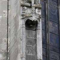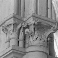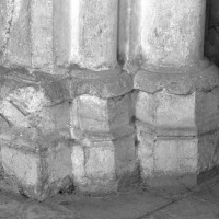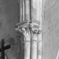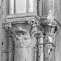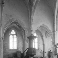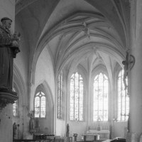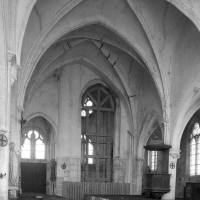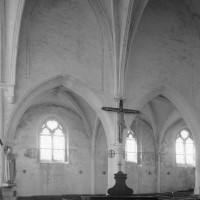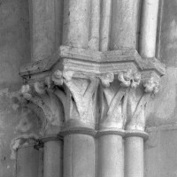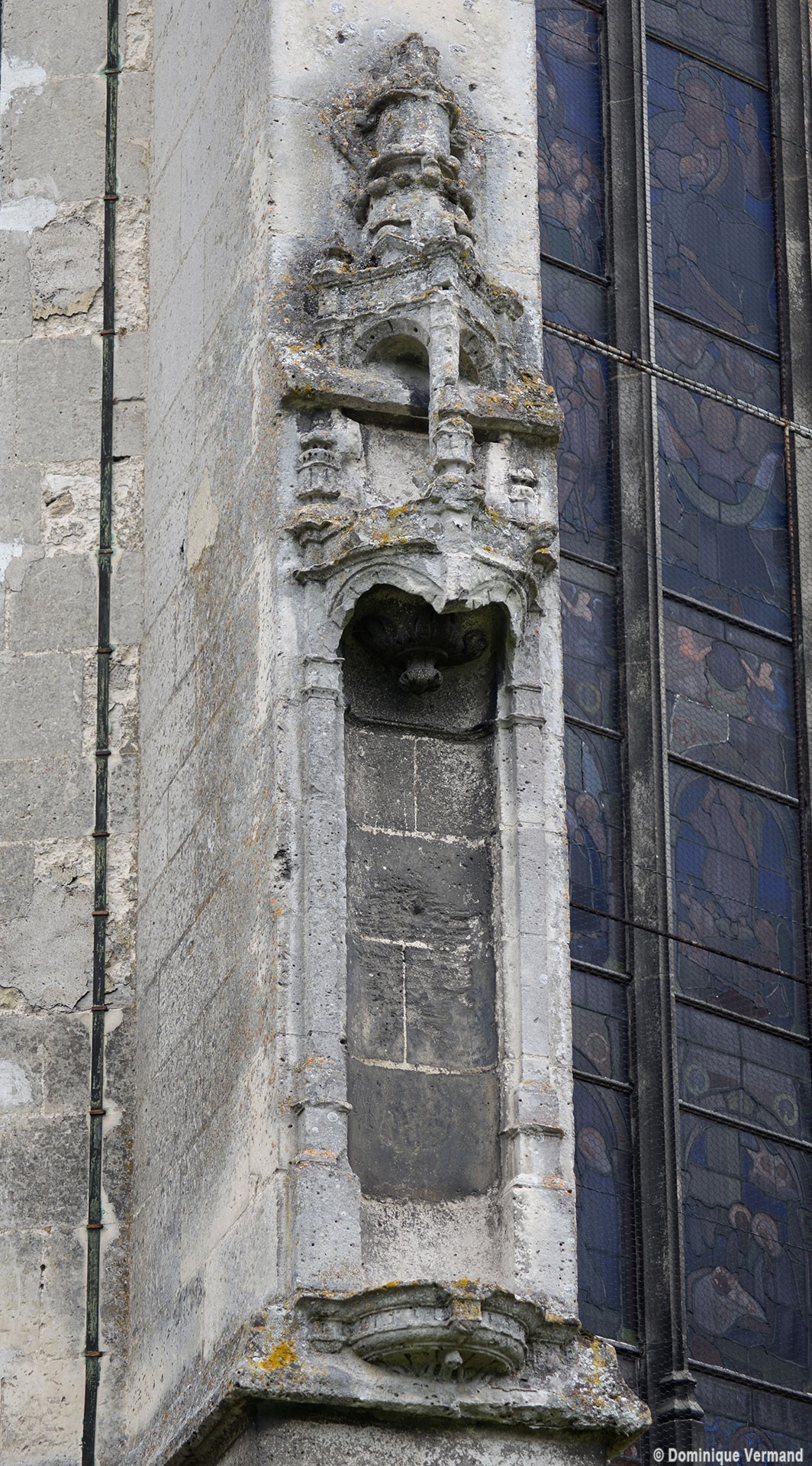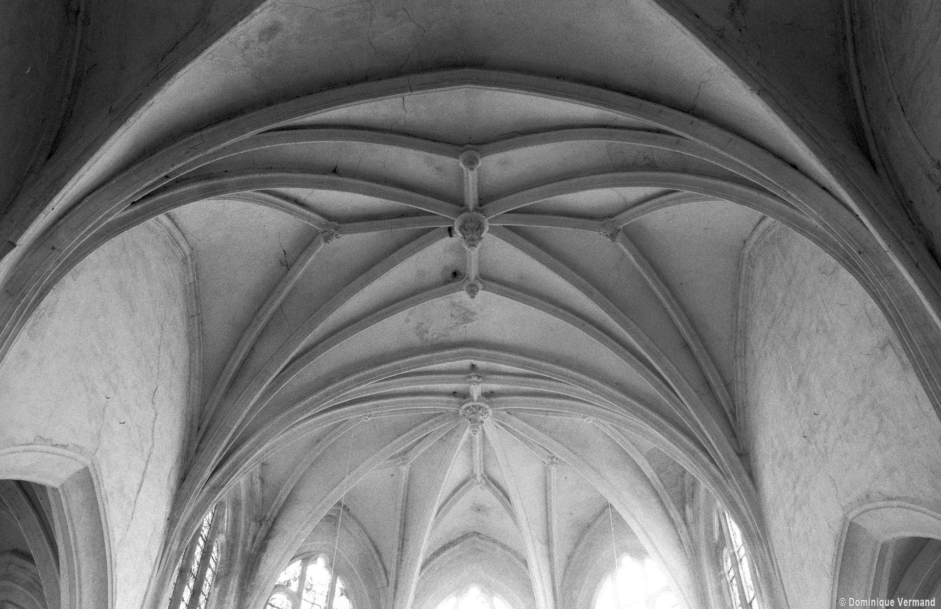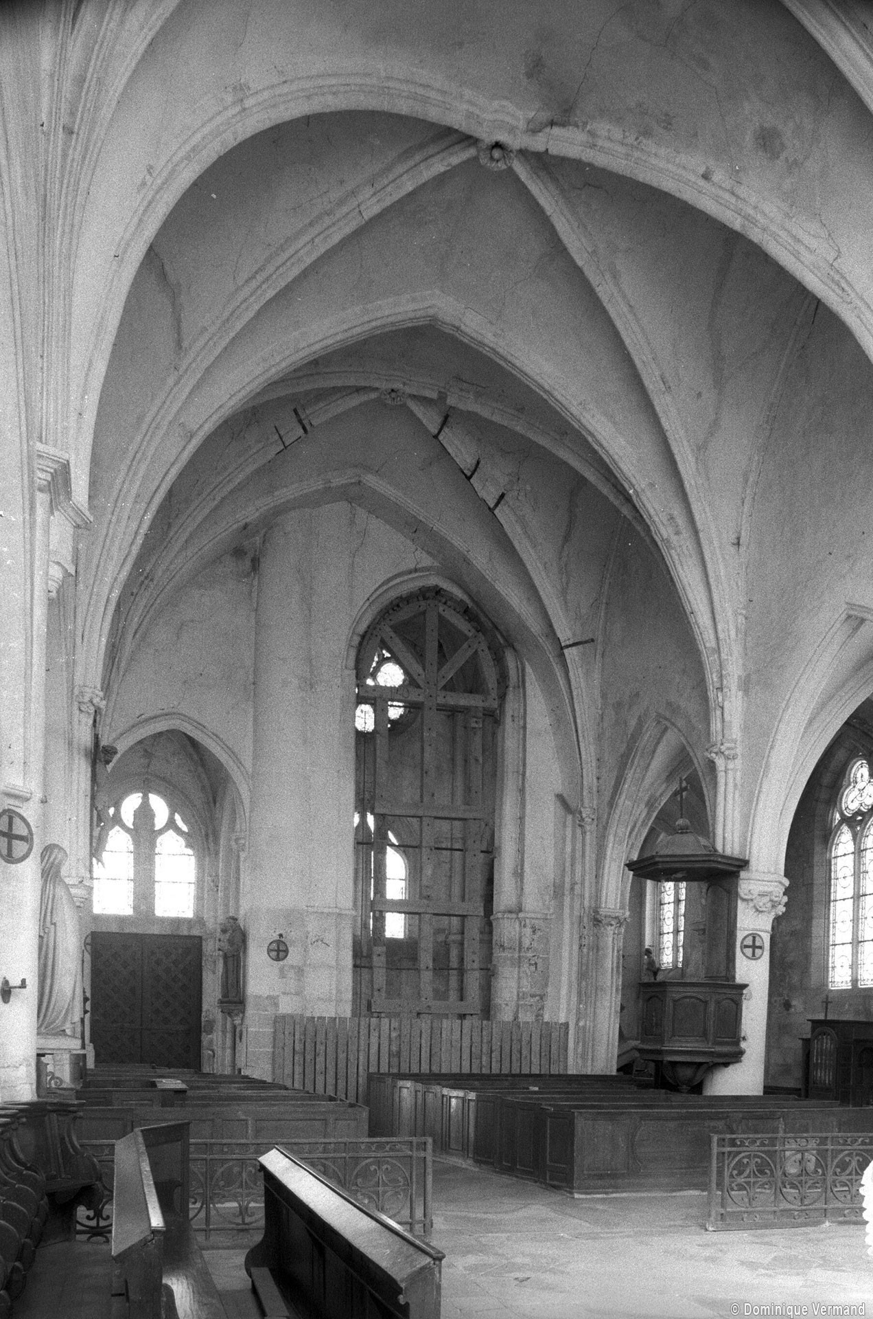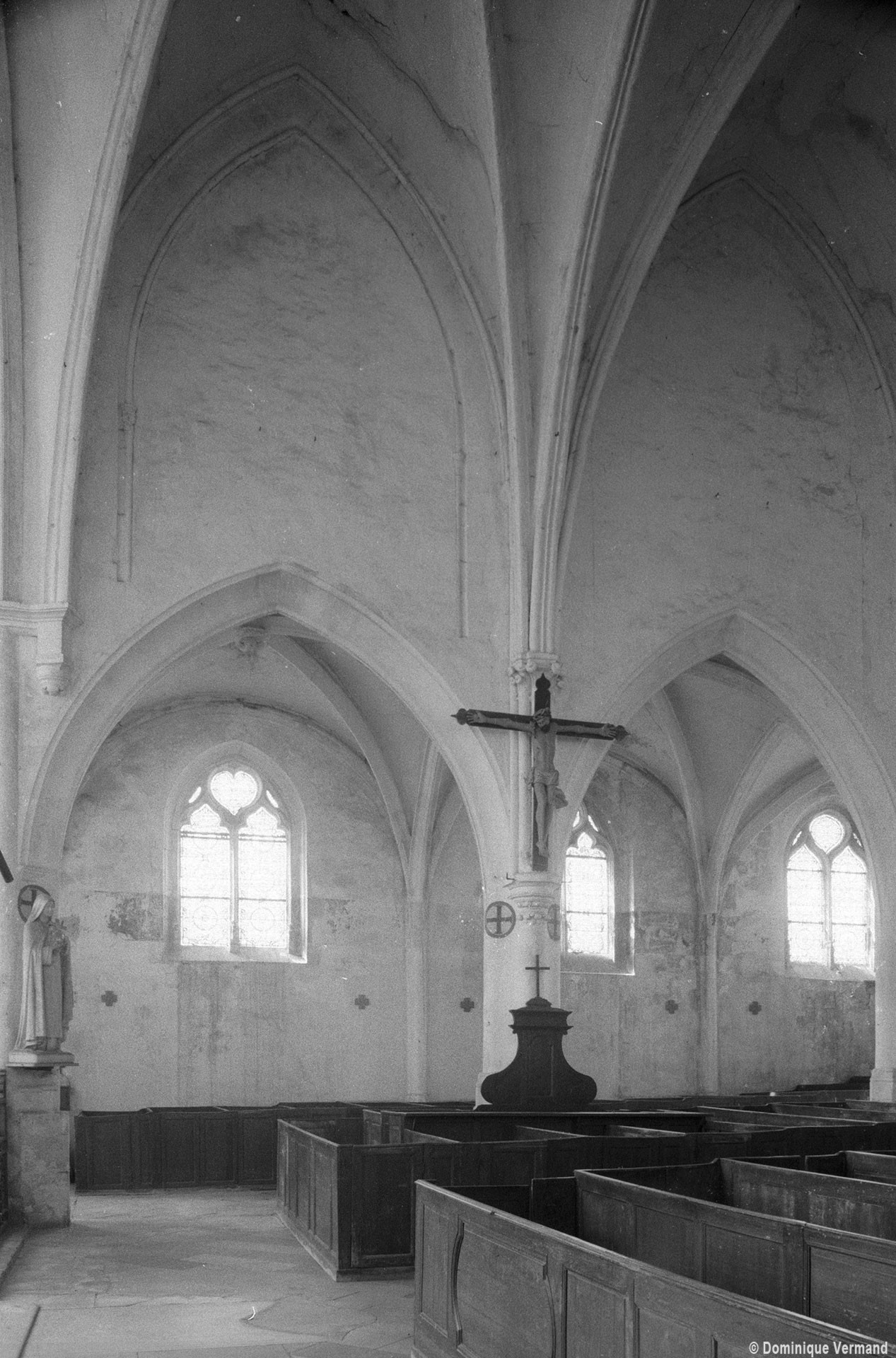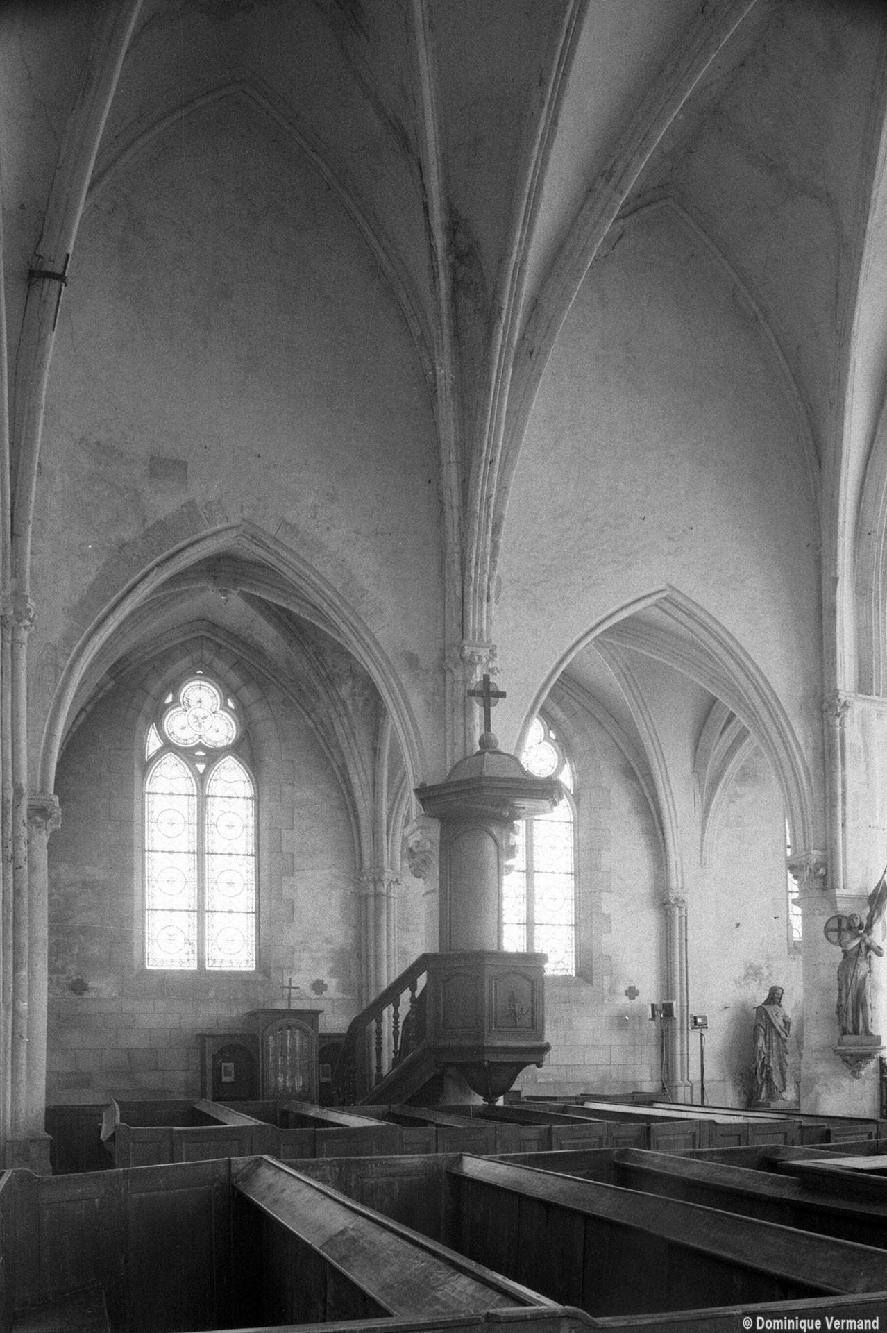 Vers le milieu du 13ème siècle, ce chœur est démoli pour faire place à un ensemble plus ambitieux comprenant un vaisseau central de deux travées bâties dans le prolongement de la base du clocher et du croisillon sud – son axe est donc décalé vers le sud par rapport à celui de l’église précédente – tandis qu’un bas-côté est construit dans le prolongement du croisillon nord. Malgré les modifications ultérieures, ces parties sont encore bien conservées et montrent un bel ensemble de chapiteaux à crochets finement travaillés et, au nord, des fenêtres avec deux lancettes surmontées d’un trilobe. Le mur gouttereau sud garde encore la trace des deux immenses fenêtres qui s’ouvraient de ce côté. Par sa largeur et son volume très unifié, ce chœur s’inscrivait dans le courant le plus novateur de l’architecture de son temps.