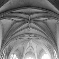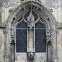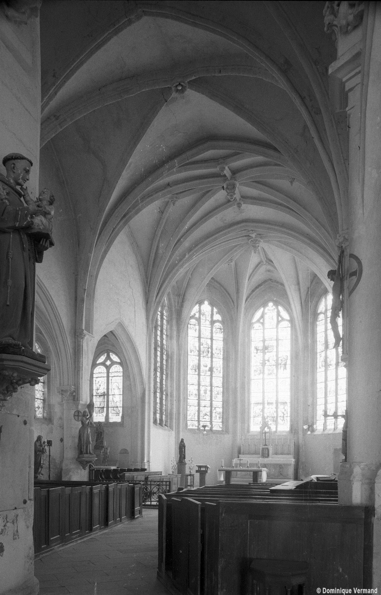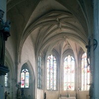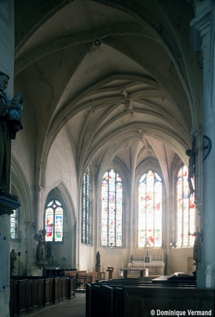 C’est un peu plus tard qu’une troisième travée avec bas-côtés et une abside pentagonale sont rajoutées à l’est. Toutes les voûtes sont avec liernes et tiercerons (c’est-à-dire avec des nervures supplémentaires), selon l’usage du temps. Le réseau des fenêtres et le décor des niches qui, à l’extérieur, habillent les contreforts portent déjà la marque de la Renaissance, ce que confirme la date de 1554 figurant sur le beau vitrail restauré évoquant la Mort et l’Assomption de la Vierge (1996, modifié 2019).