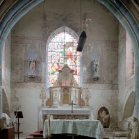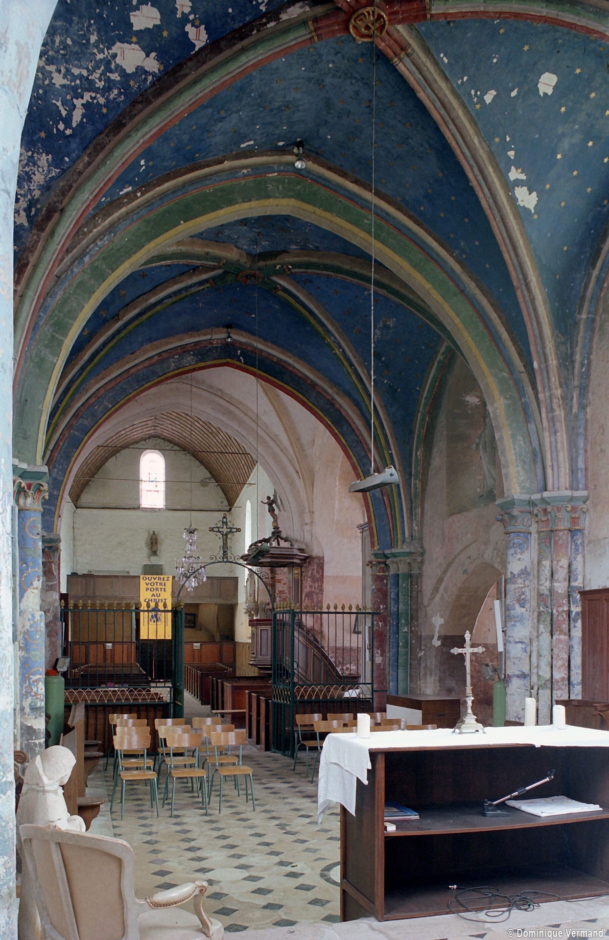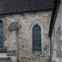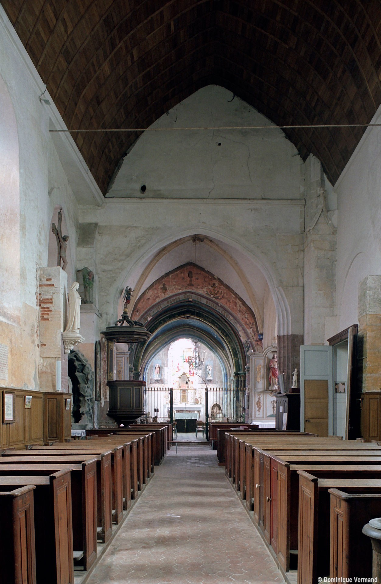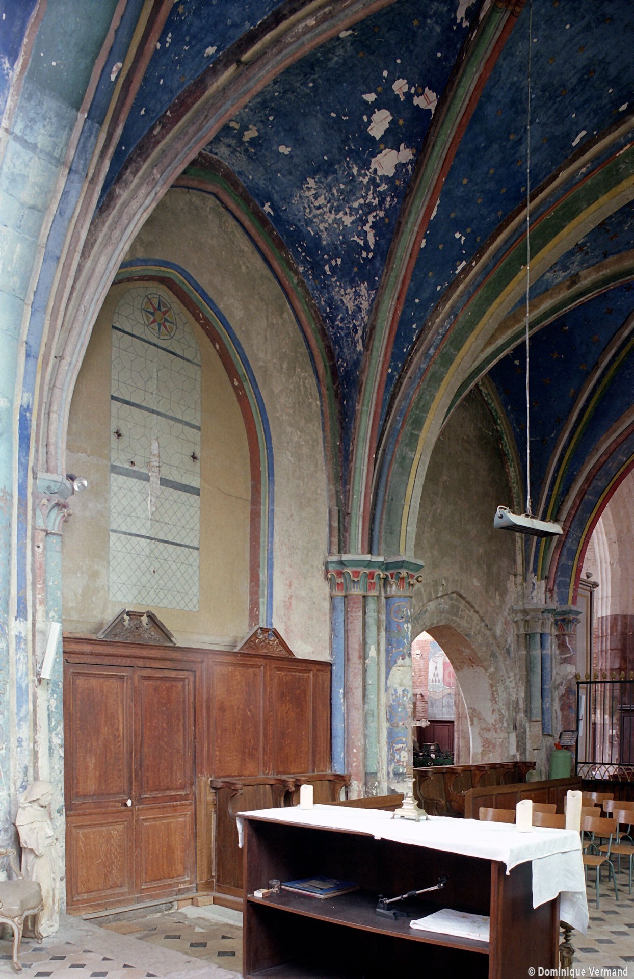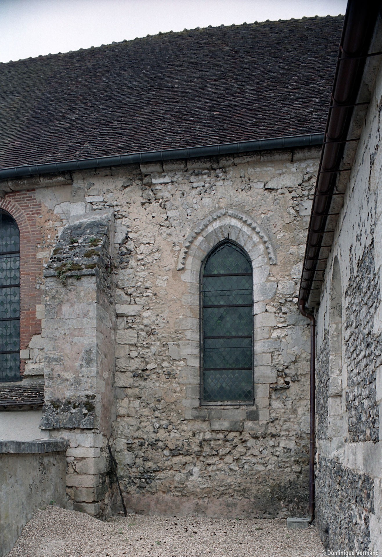 Vers 1200, l’édifice n’était constitué que d’une simple nef – d’origine sans doute plus ancienne mais très dénaturée par la suite – et d’un choeur de deux travées à chevet plat. Englobé dans les agrandissements successifs de l’église, celui-ci a conservé ses deux voûtes d’ogives retombant sur des faisceaux de colonnettes par l’intermédiaire de chapiteaux à crochets. Les fenêtres primitives avec décor de pointes de diamant se voient encore sur le côté nord, celle de la première travée depuis l’intérieur.
