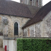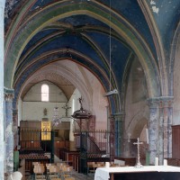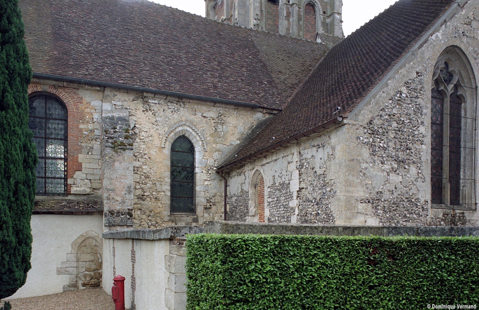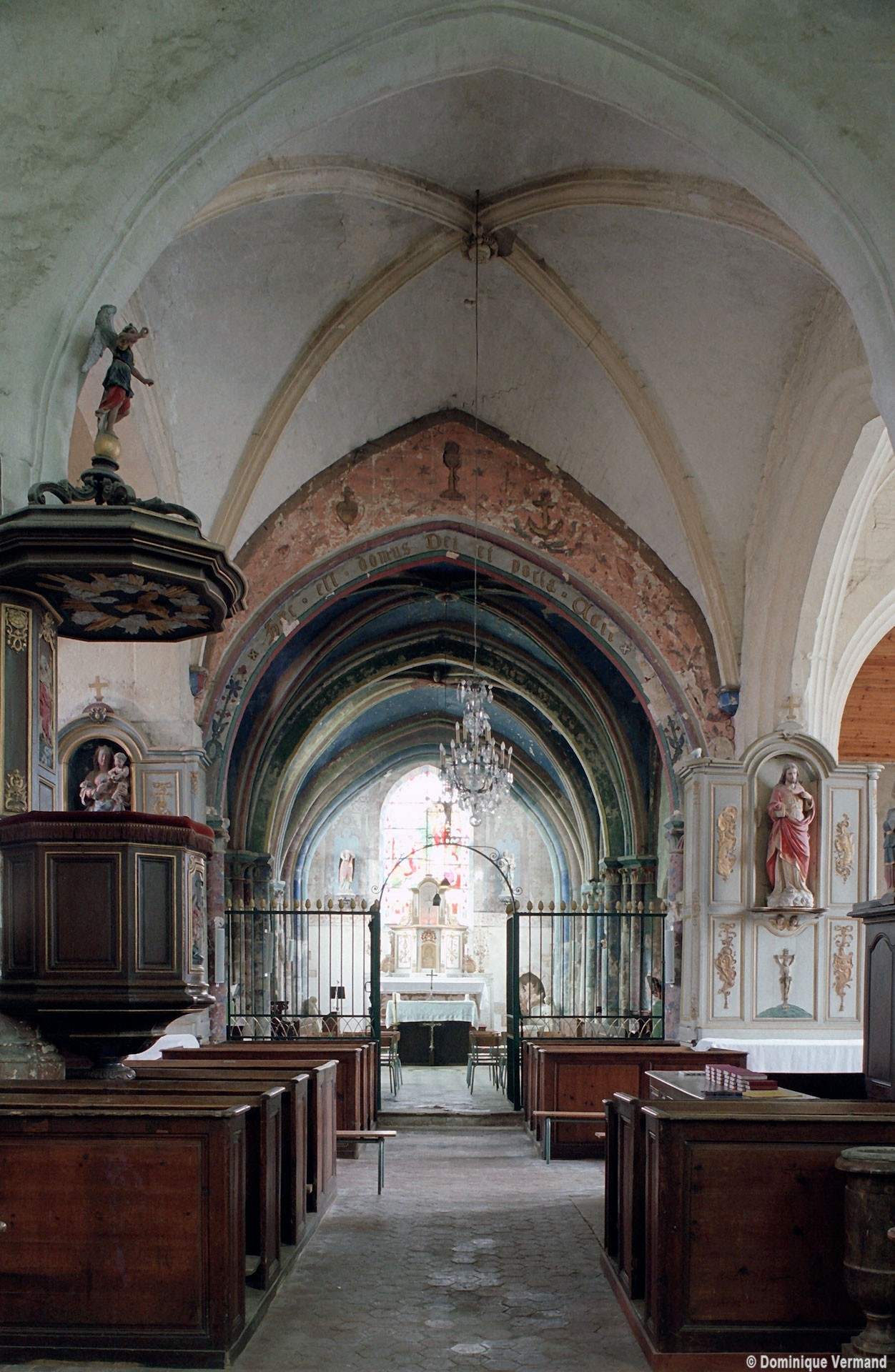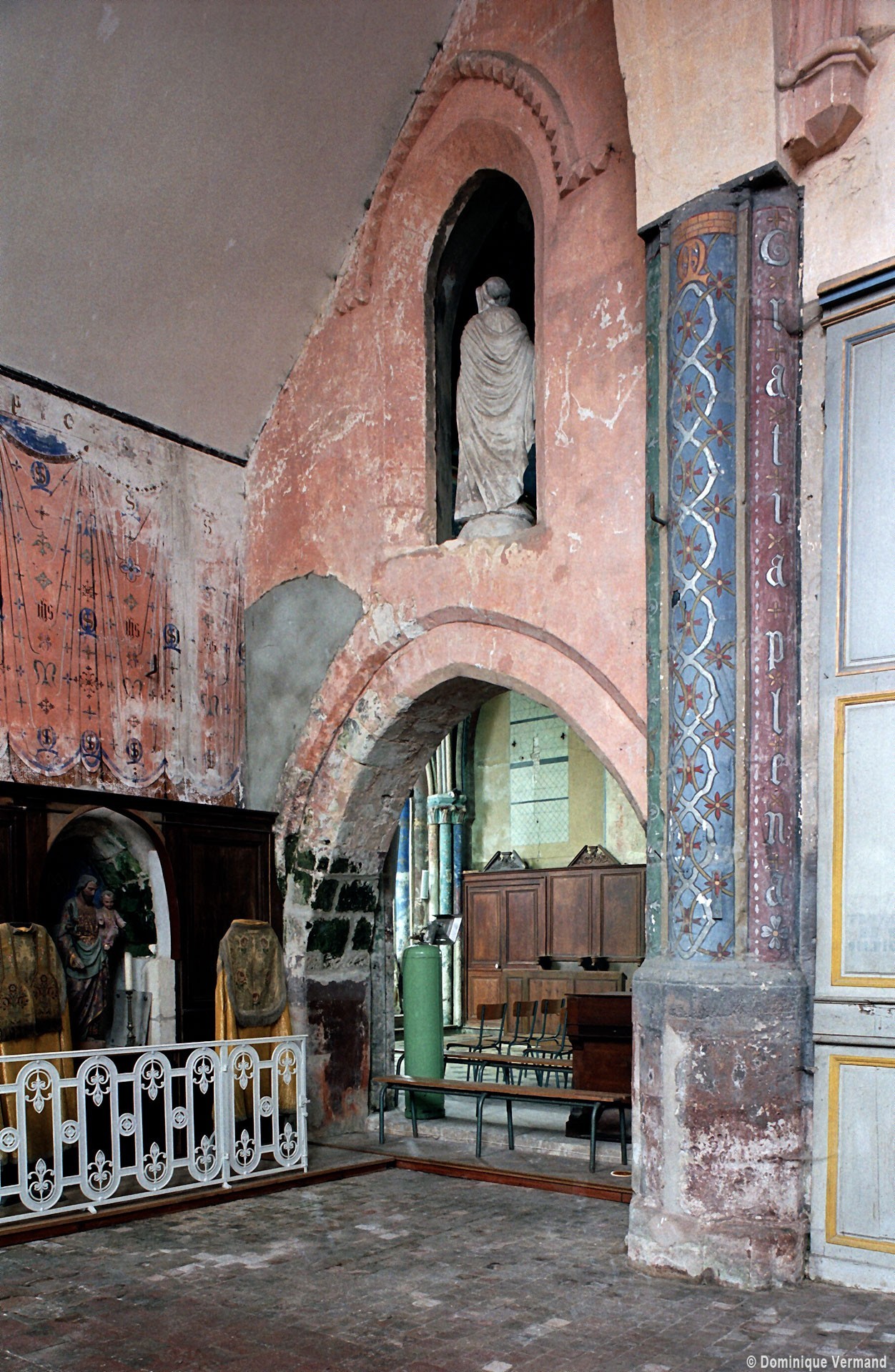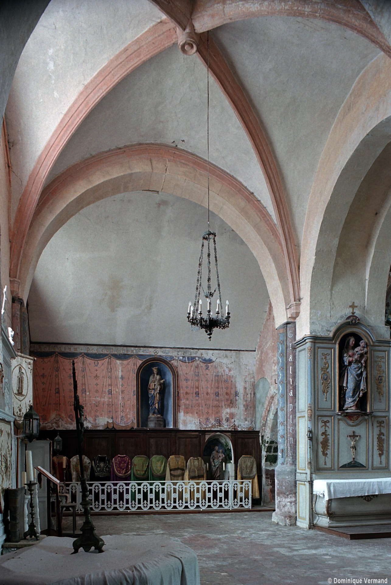 Vers 1200, l’édifice n’était constitué que d’une simple nef – d’origine sans doute plus ancienne mais très dénaturée par la suite – et d’un choeur de deux travées à chevet plat. Englobé dans les agrandissements successifs de l’église, celui-ci a conservé ses deux voûtes d’ogives retombant sur des faisceaux de colonnettes par l’intermédiaire de chapiteaux à crochets. Les fenêtres primitives avec décor de pointes de diamant se voient encore sur le côté nord, celle de la première travée depuis l’intérieur.