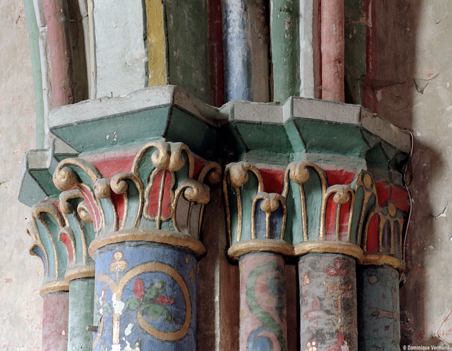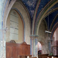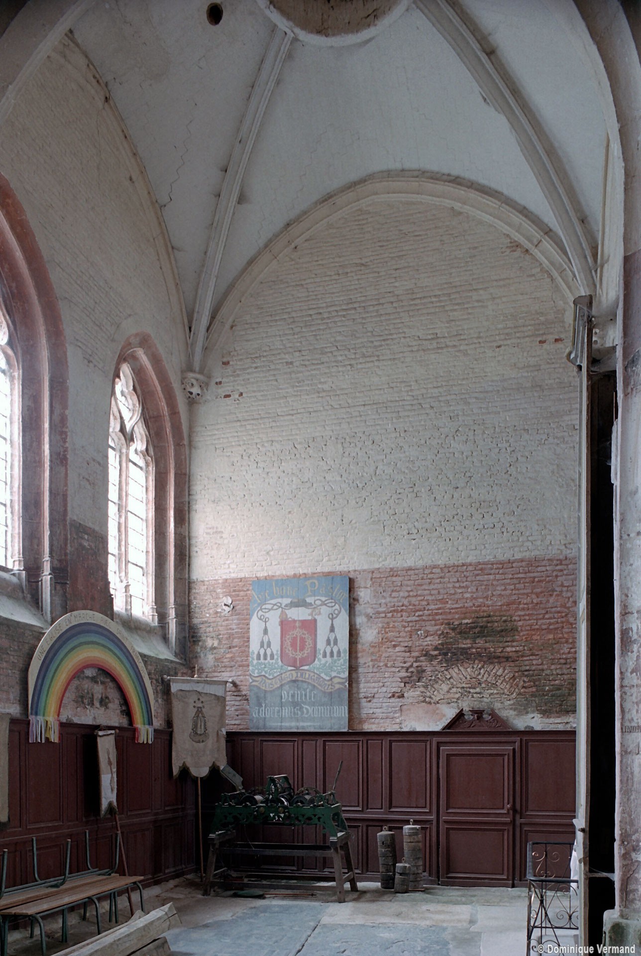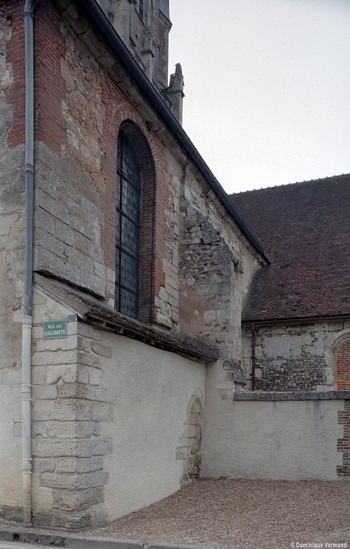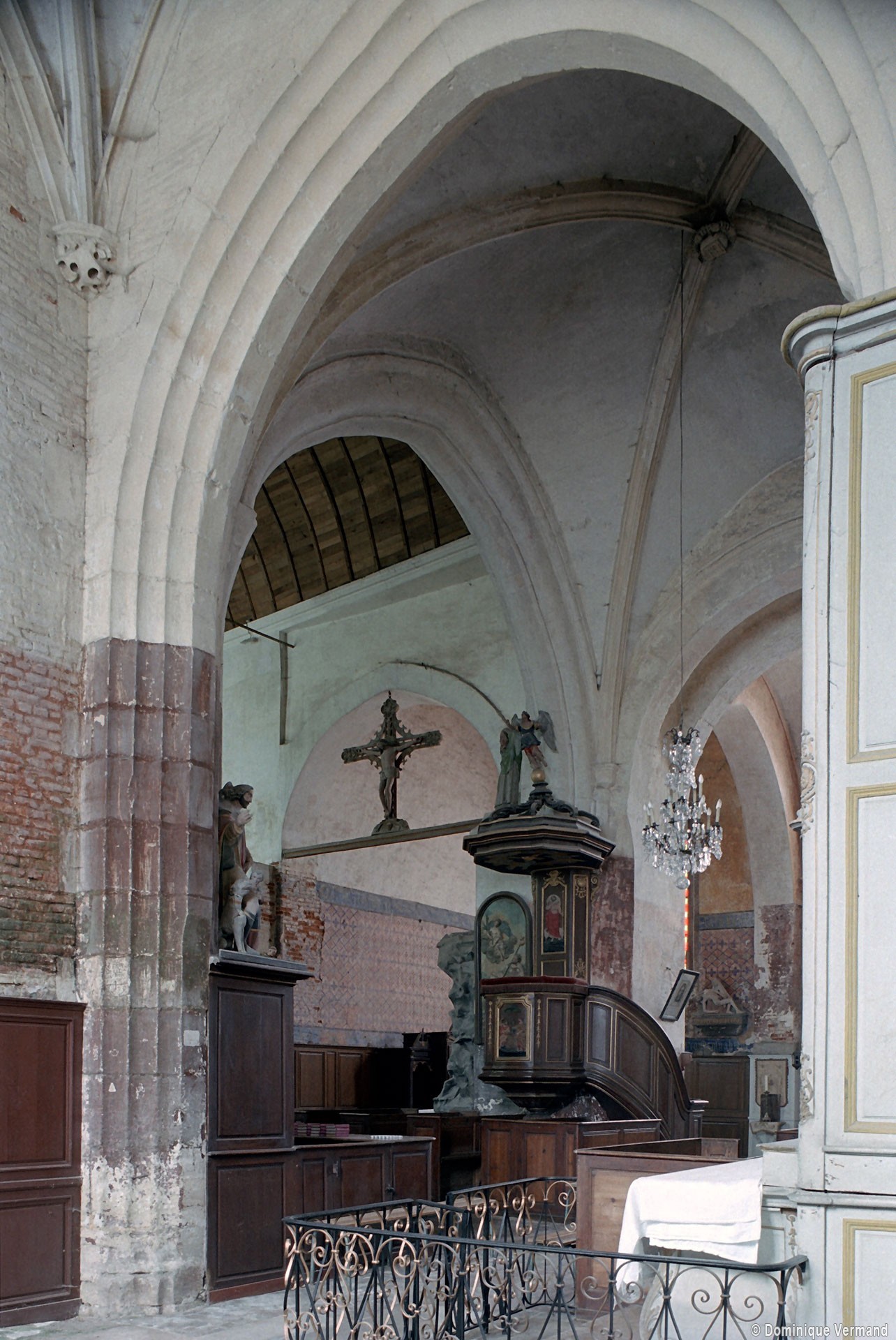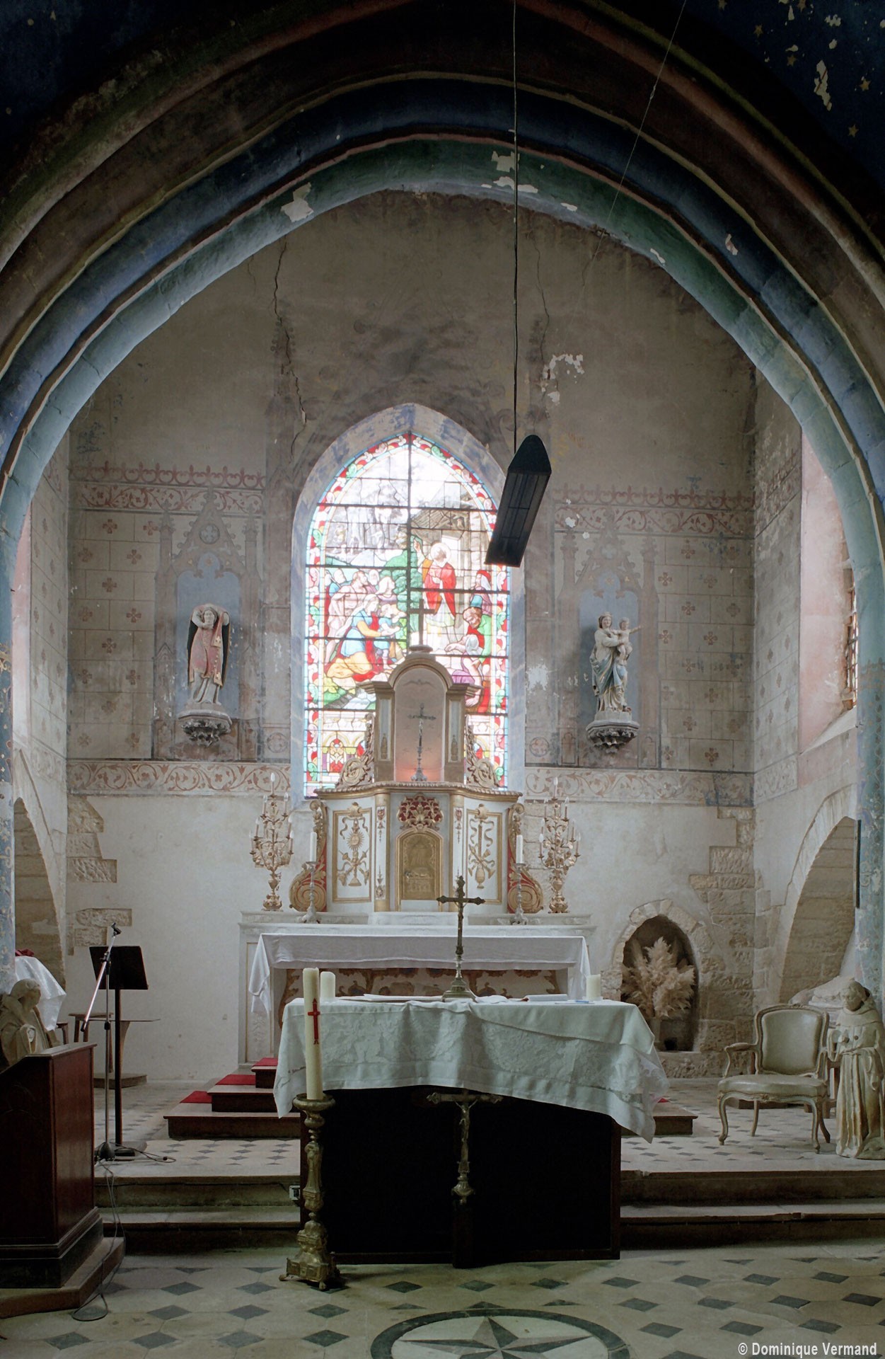Vers 1200, l’édifice n’était constitué que d’une simple nef – d’origine sans doute plus ancienne mais très dénaturée par la suite – et d’un choeur de deux travées à chevet plat. Englobé dans les agrandissements successifs de l’église, celui-ci a conservé ses deux voûtes d’ogives retombant sur des faisceaux de colonnettes par l’intermédiaire de chapiteaux à crochets. Les fenêtres primitives avec décor de pointes de diamant se voient encore sur le côté nord, celle de la première travée depuis l’intérieur.
