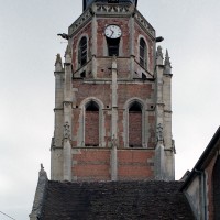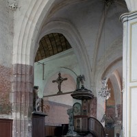 Au 16ème siècle, les travaux vont reprendre avec la construction d’un transept à l’ouest du choeur. Les chapelles de Guillaume II y sont alors annexées tandis qu’une travée prolonge vers l’ouest le croisillon nord. Les voûtes d’ogives ne couvrent que le transept proprement dit, dont le croisillon sud sert d’assise au clocher. Celui-ci est une haute tour en briques et pierre de style gothique flamboyant dont le dernier étage est de plan octogonal. Un lanternon en charpente et ardoise du 17ème siècle couronne cette tour, la plus belle de toute la région.