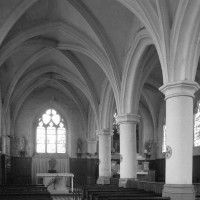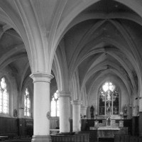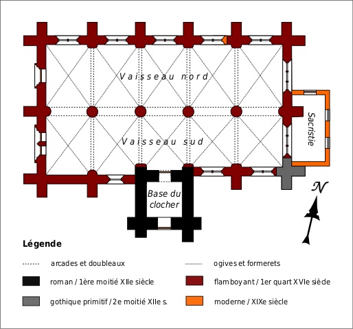 Rebâtie au 15ème siècle (une clef de voûte porte la date de 1419) et modifiée au siècle suivant, l’église affecte un plan rectangulaire sur lequel seul fait saillie, au sud, le clocher. L’intérieur, long de cinq travées, est divisé en deux nefs identiques dont les voûtes retombent au centre sur une file de quatre piles circulaires. Rare pour une nef, ce parti dérive de celui fréquemment utilisé à la même époque, mais selon un axe transversal, pour les transepts et les chœurs. Bien construit, l’ensemble traduit cependant une grande économie de moyens, notamment dans la décoration sculptée, pratiquement absente.