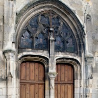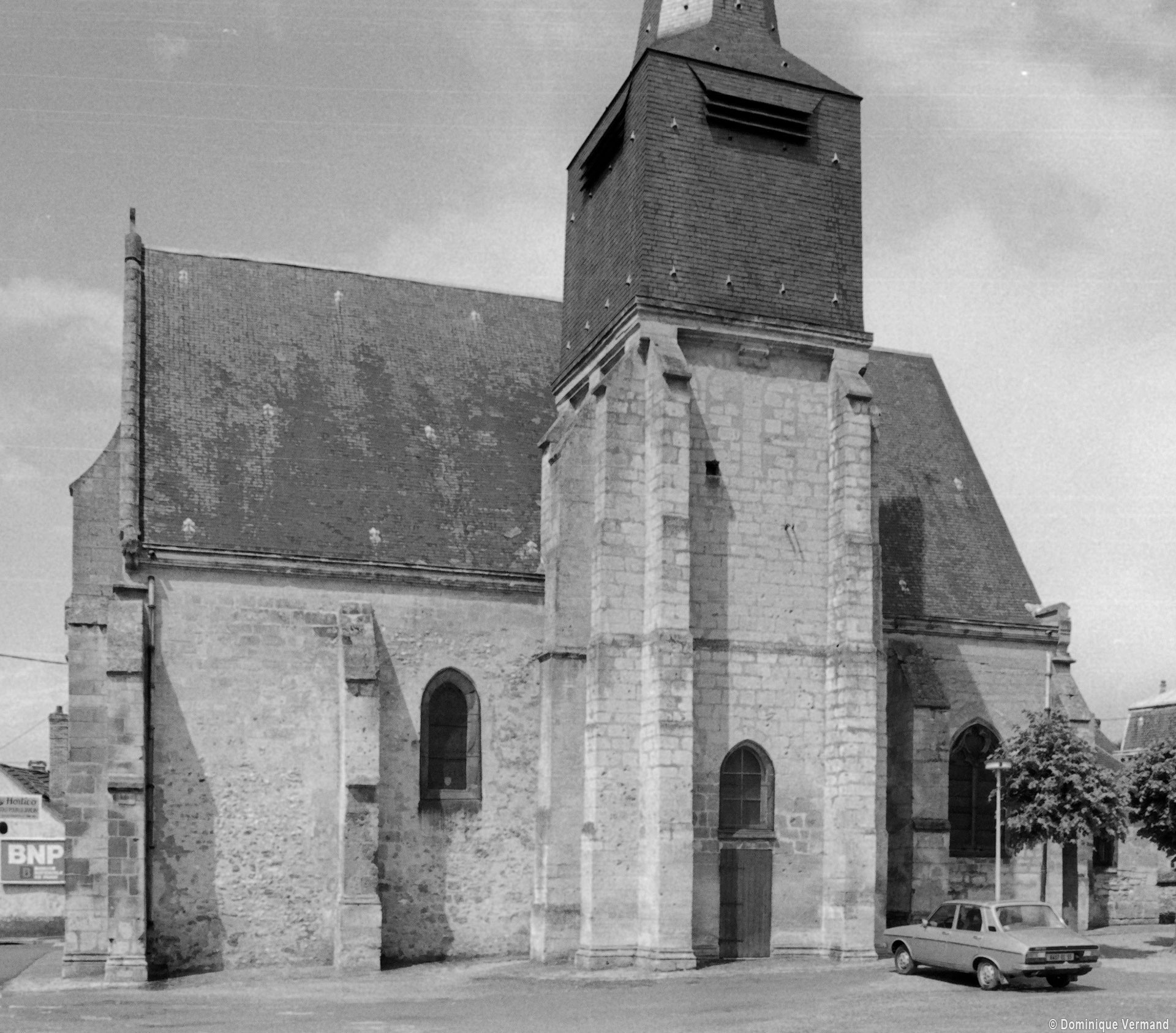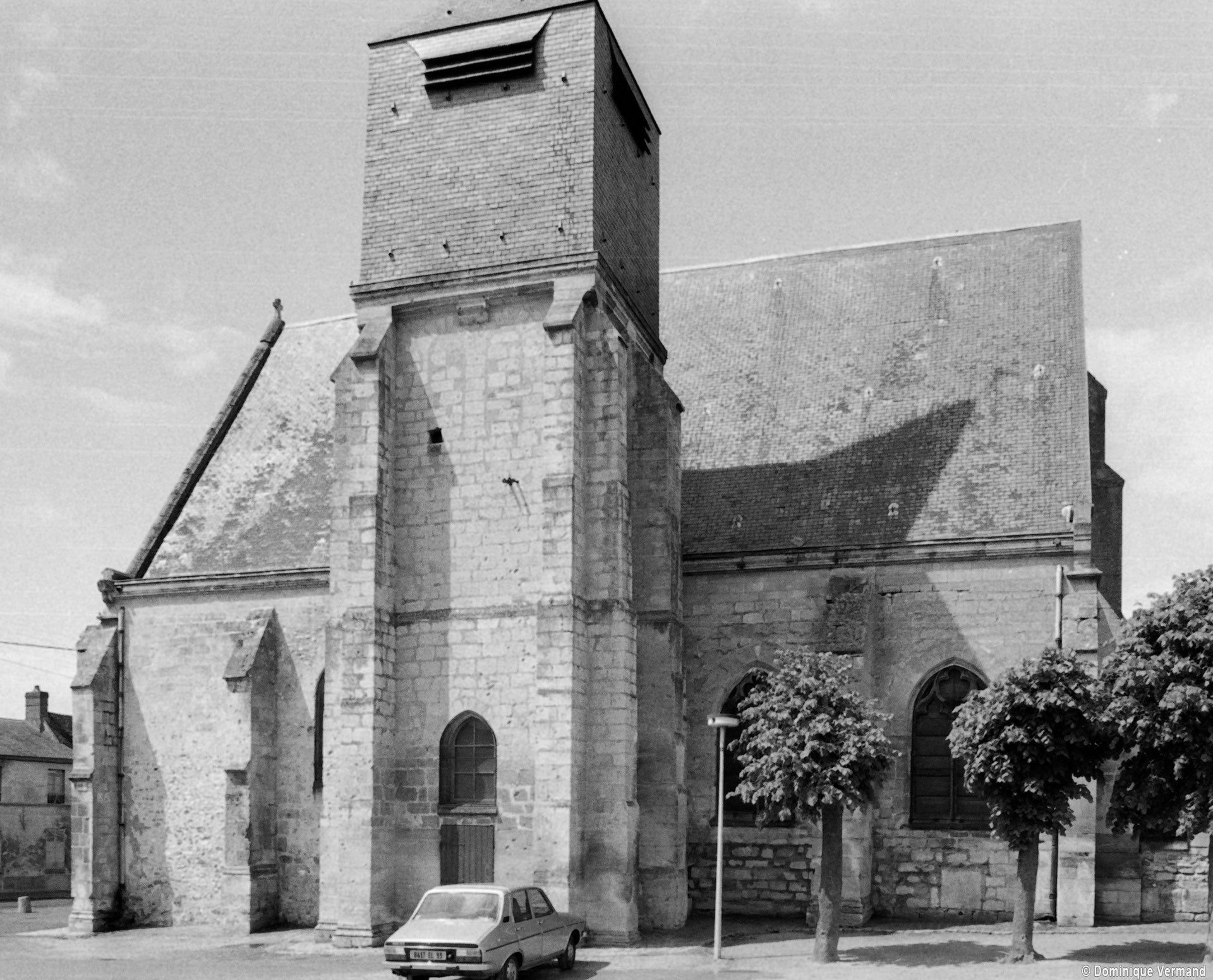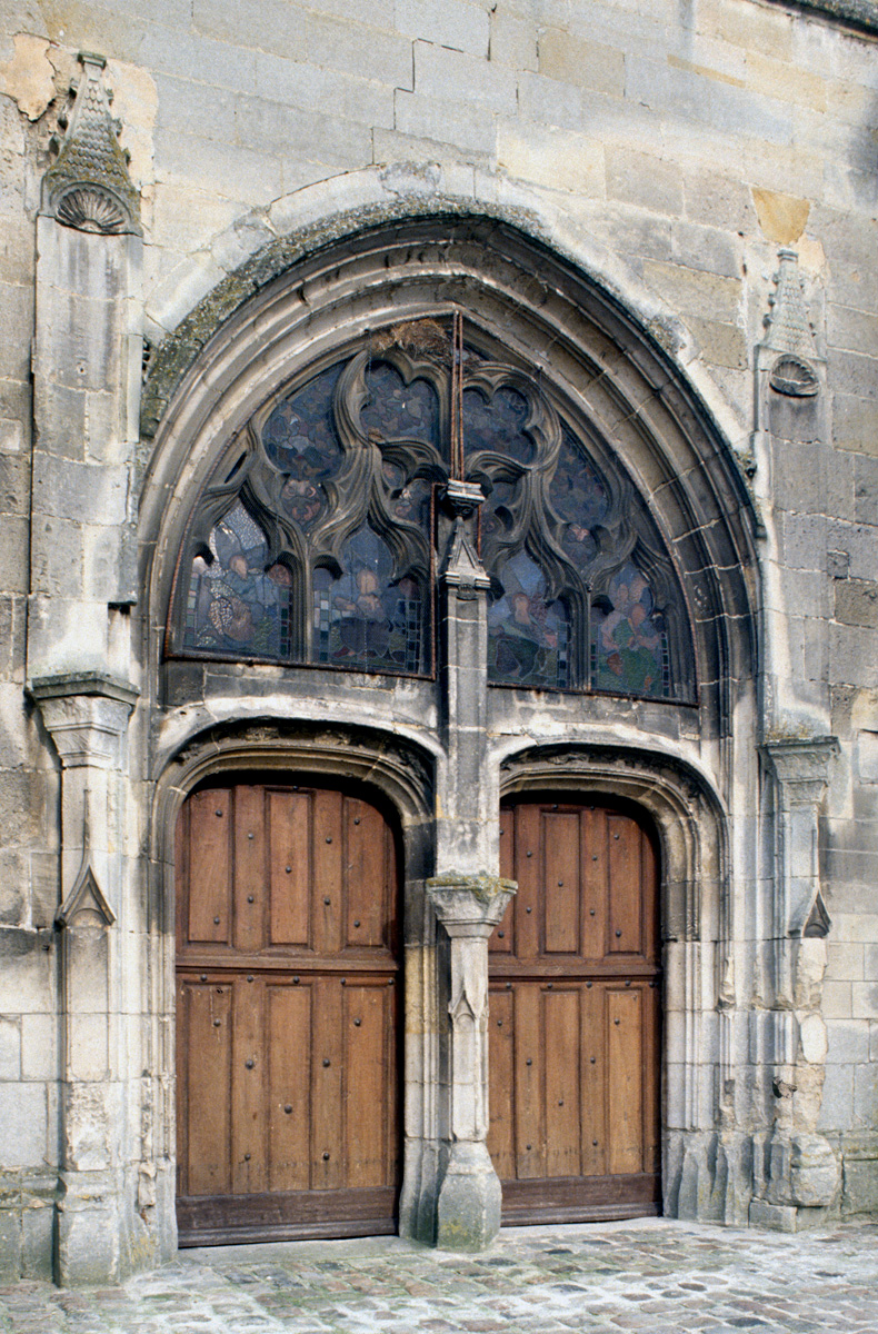 A l’extérieur, le clocher apparaît comme une tour massive et austère, aujourd’hui pratiquement privée d’ouvertures. Ses contreforts saillants montant d’un seul jet et avec peu de larmiers intermédiaires, comme la forme légèrement brisée que ses anciennes ouvertures laissent deviner pourraient plaider, mais sans certitude, pour le 12ème siècle. Semblables, la façade et le chevet sont constitués par un simple mur pignon qu’un haut contrefort épaule au milieu. Doté d’un trumeau, d’un tympan vitré et de niches qui abritaient autrefois des statues, le portail principal, de style gothique flamboyant, accueille timidement, au-dessus des niches qui l’encadre, deux coquilles Saint-Jacques qui se réclament du vocabulaire de la Renaissance (1994, modifié 2015).