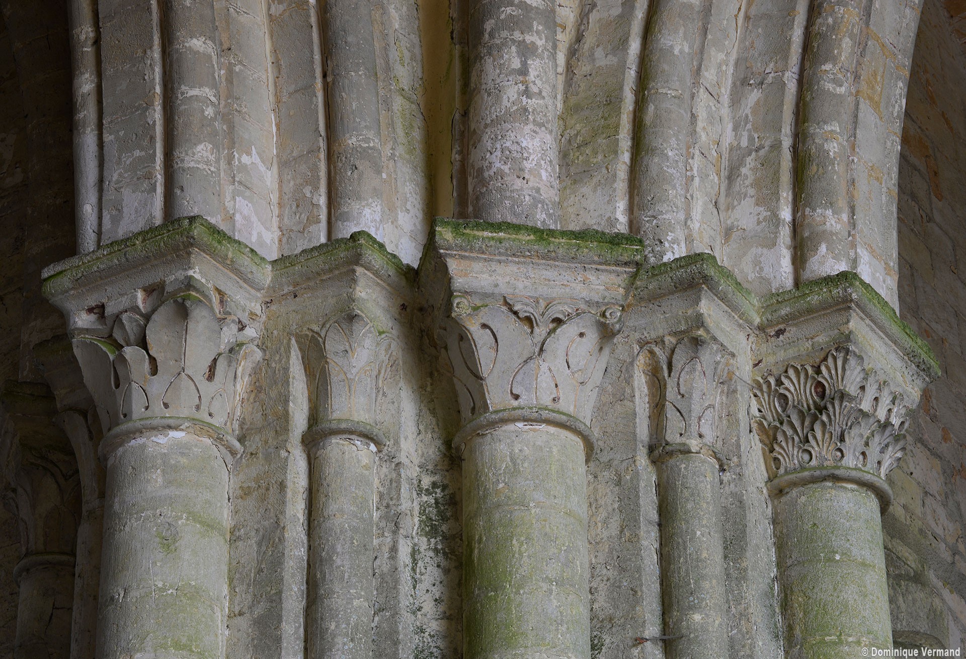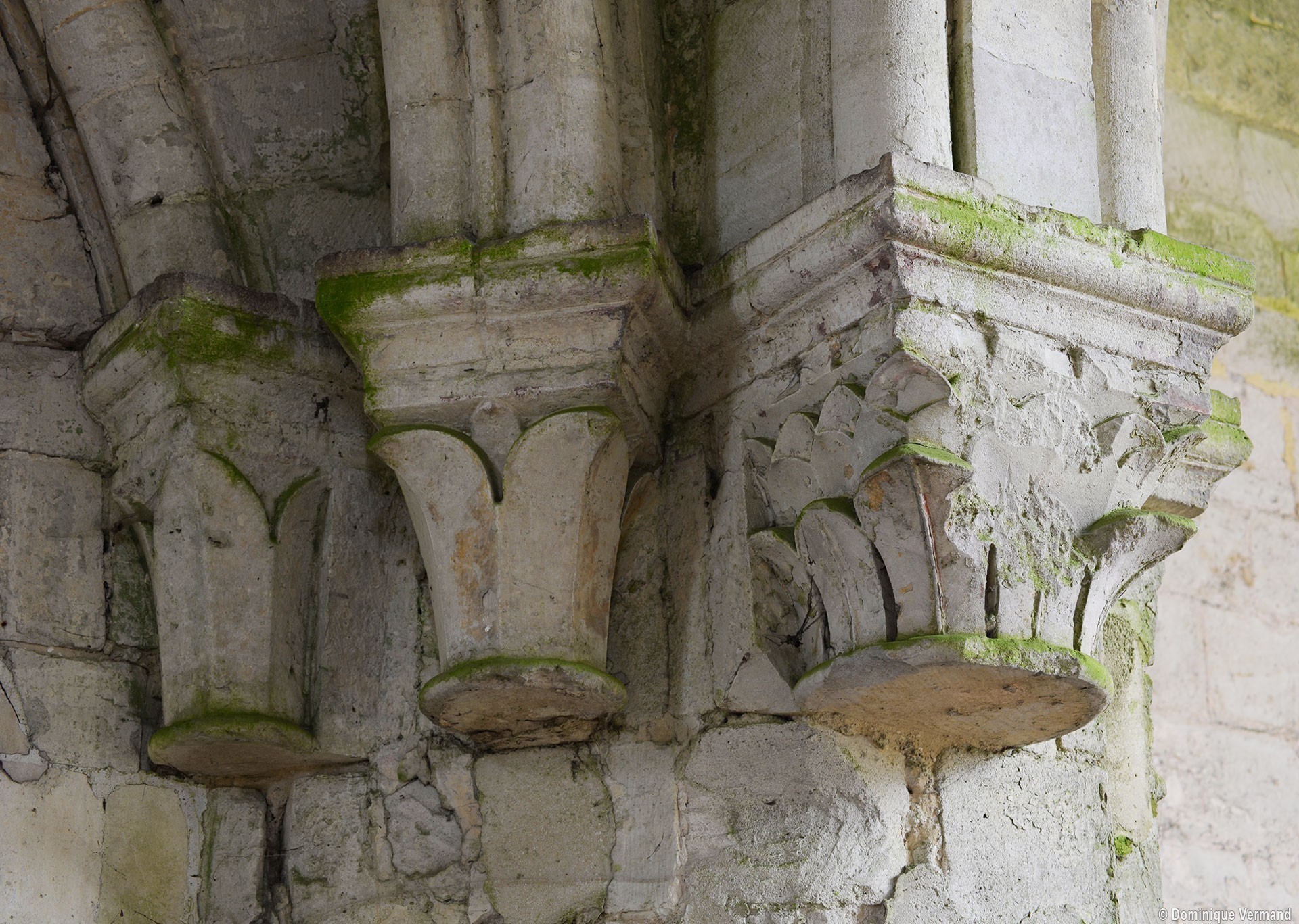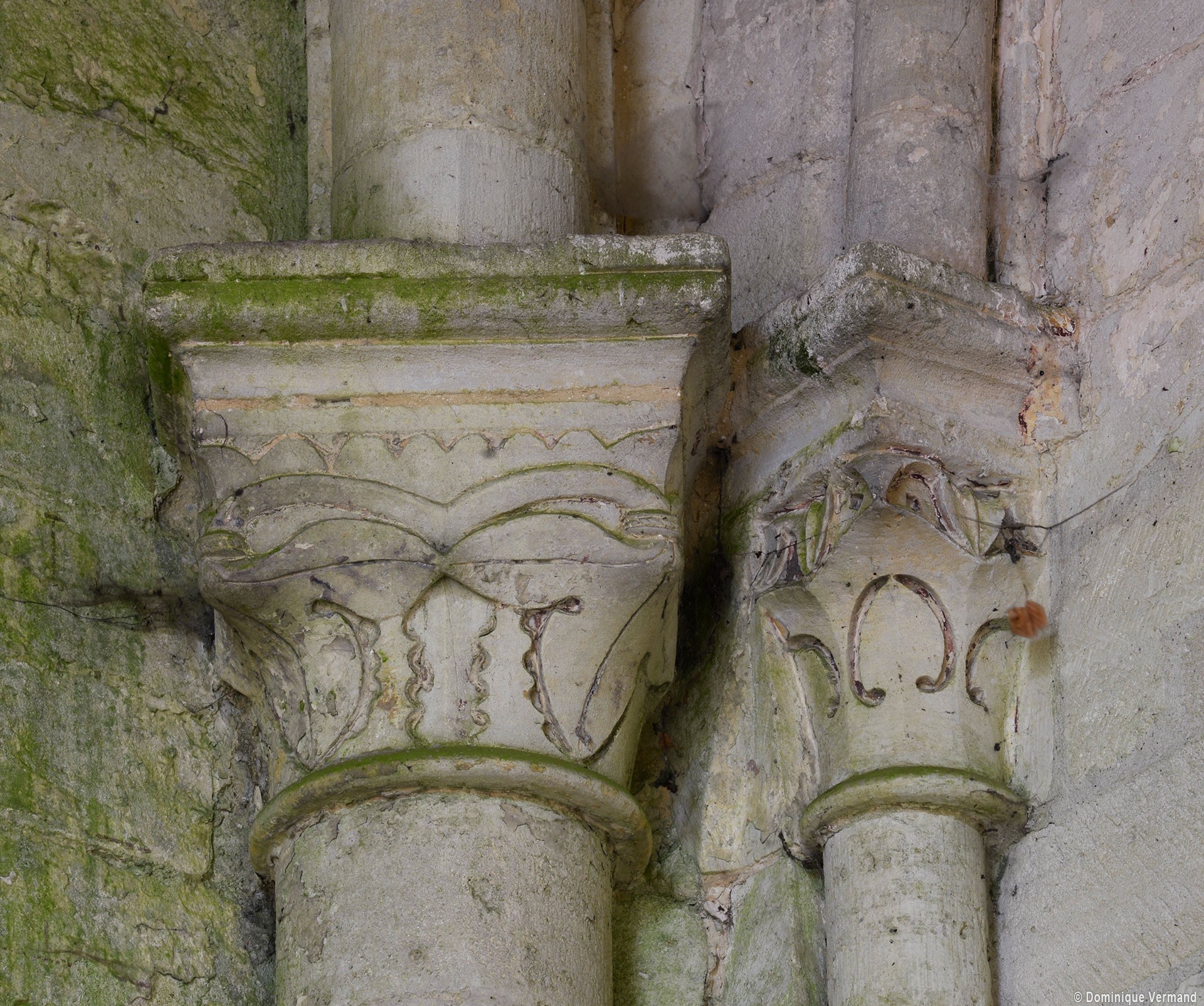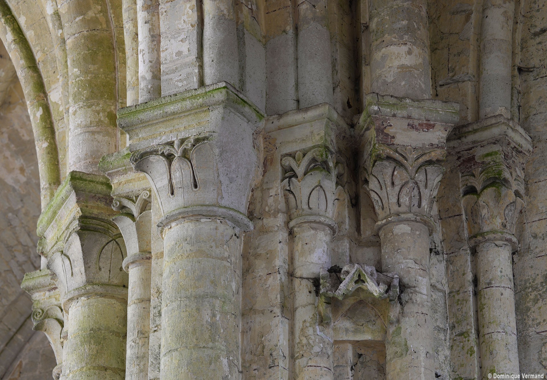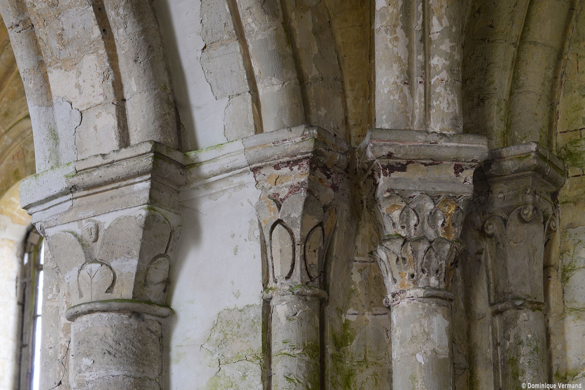 Le chœur, dont la voûte de la seconde travée est plus basse, a été traité avec un raffinement plus poussé – arcs formerets, colonnettes et moulures toriques encadrant les fenêtres – que l’on ne retrouve pas au transept. Dans leur grande majorité, les chapiteaux montrent des variations sur le thème de la feuille plate – dite également feuille d’eau -, également très présent à Senlis et originaire du Beauvaisis.