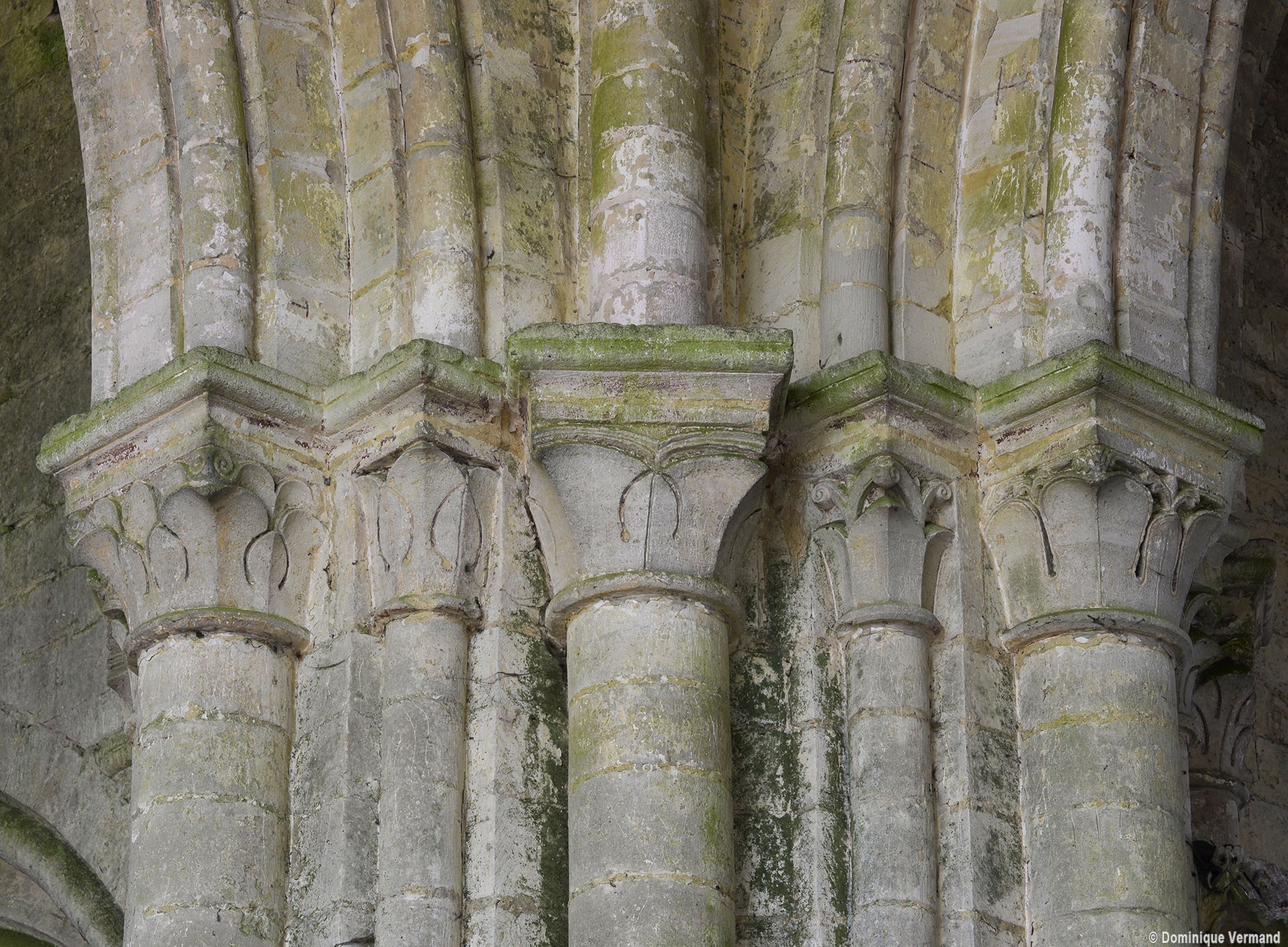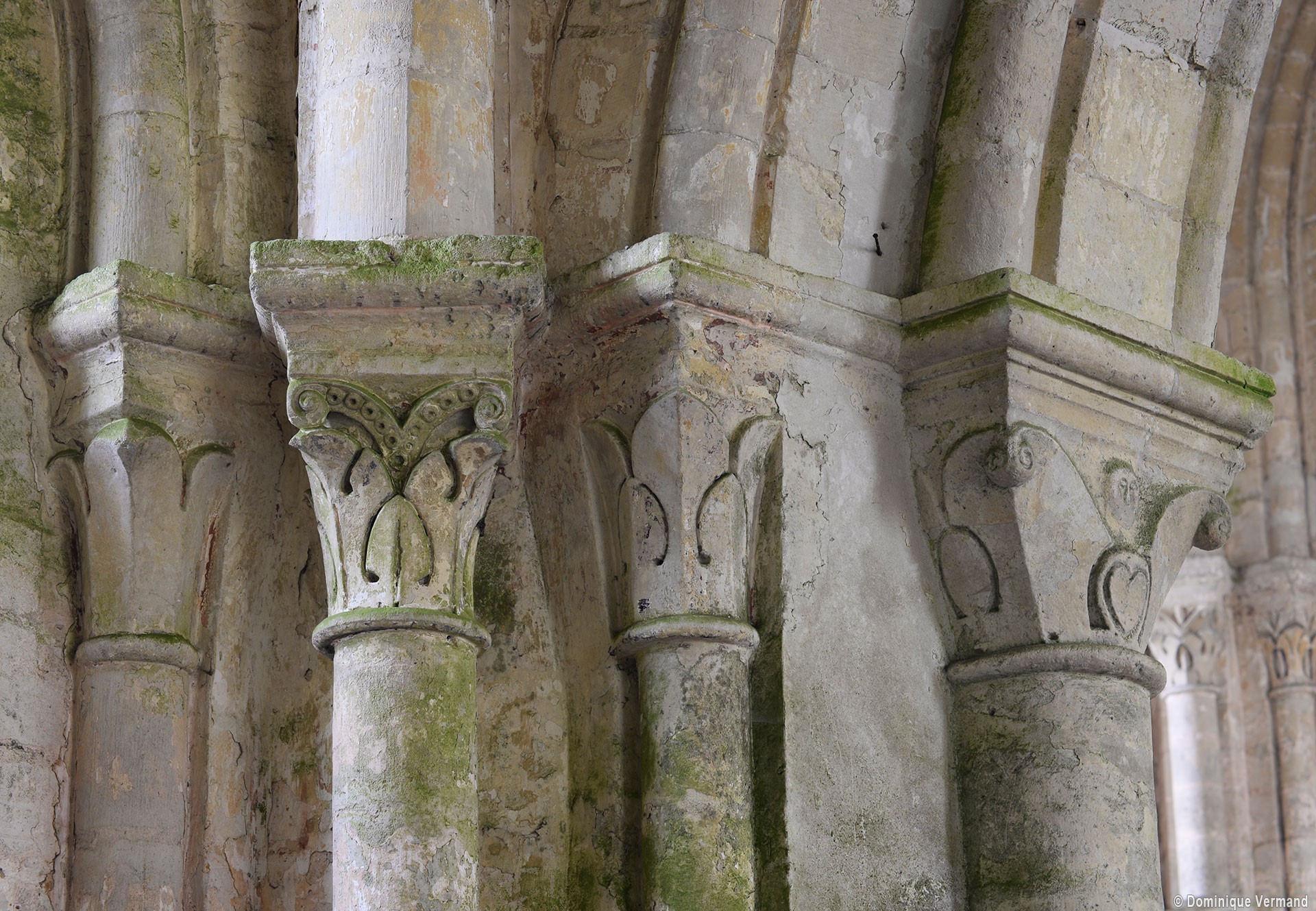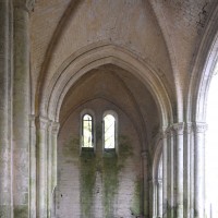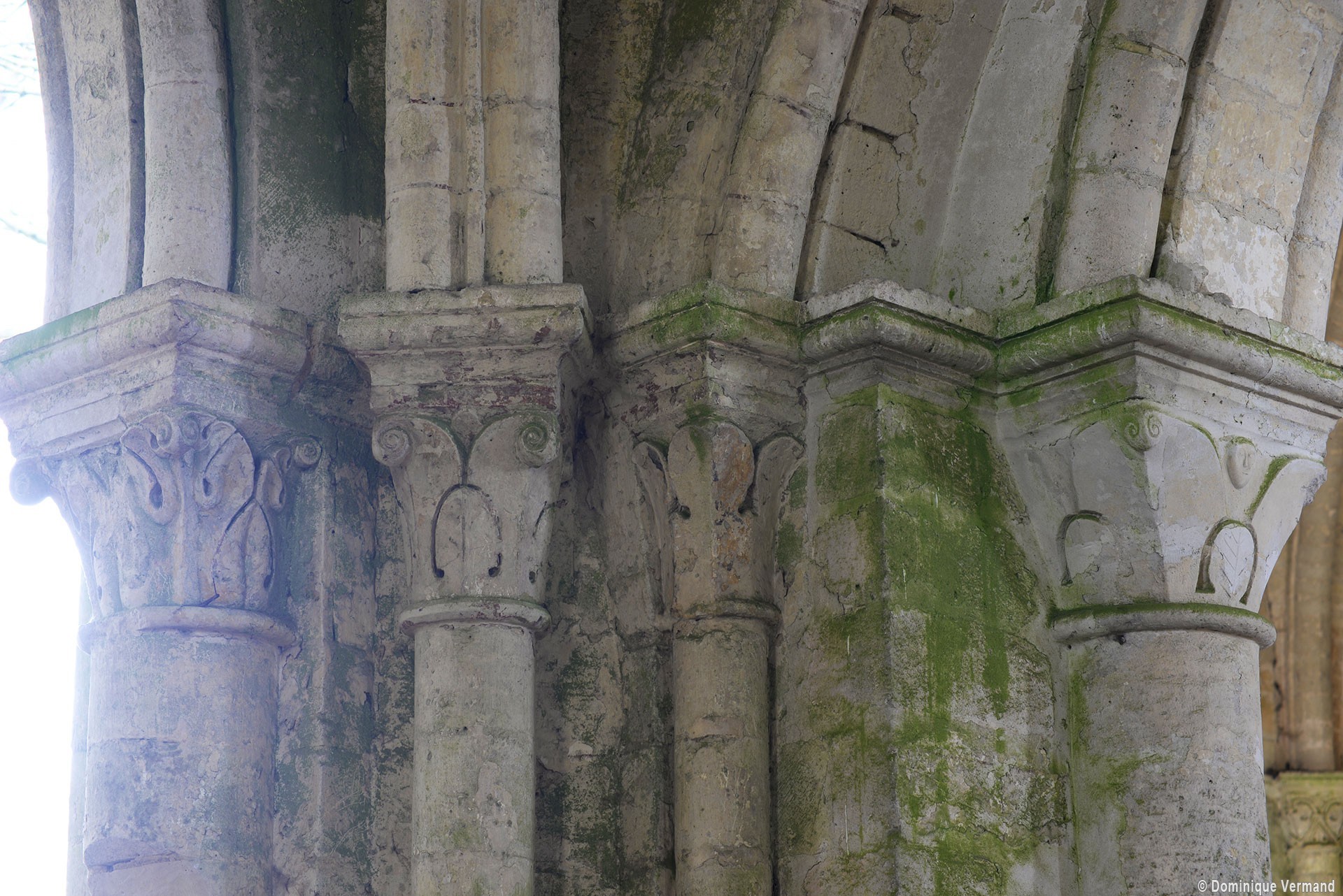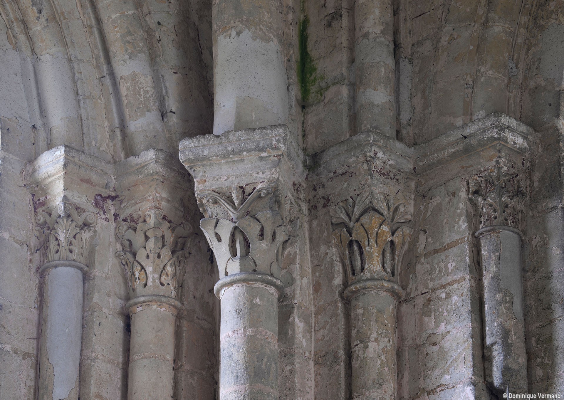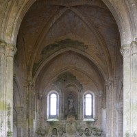 Le chœur, dont la voûte de la seconde travée est plus basse, a été traité avec un raffinement plus poussé – arcs formerets, colonnettes et moulures toriques encadrant les fenêtres – que l’on ne retrouve pas au transept. Dans leur grande majorité, les chapiteaux montrent des variations sur le thème de la feuille plate – dite également feuille d’eau -, également très présent à Senlis et originaire du Beauvaisis.