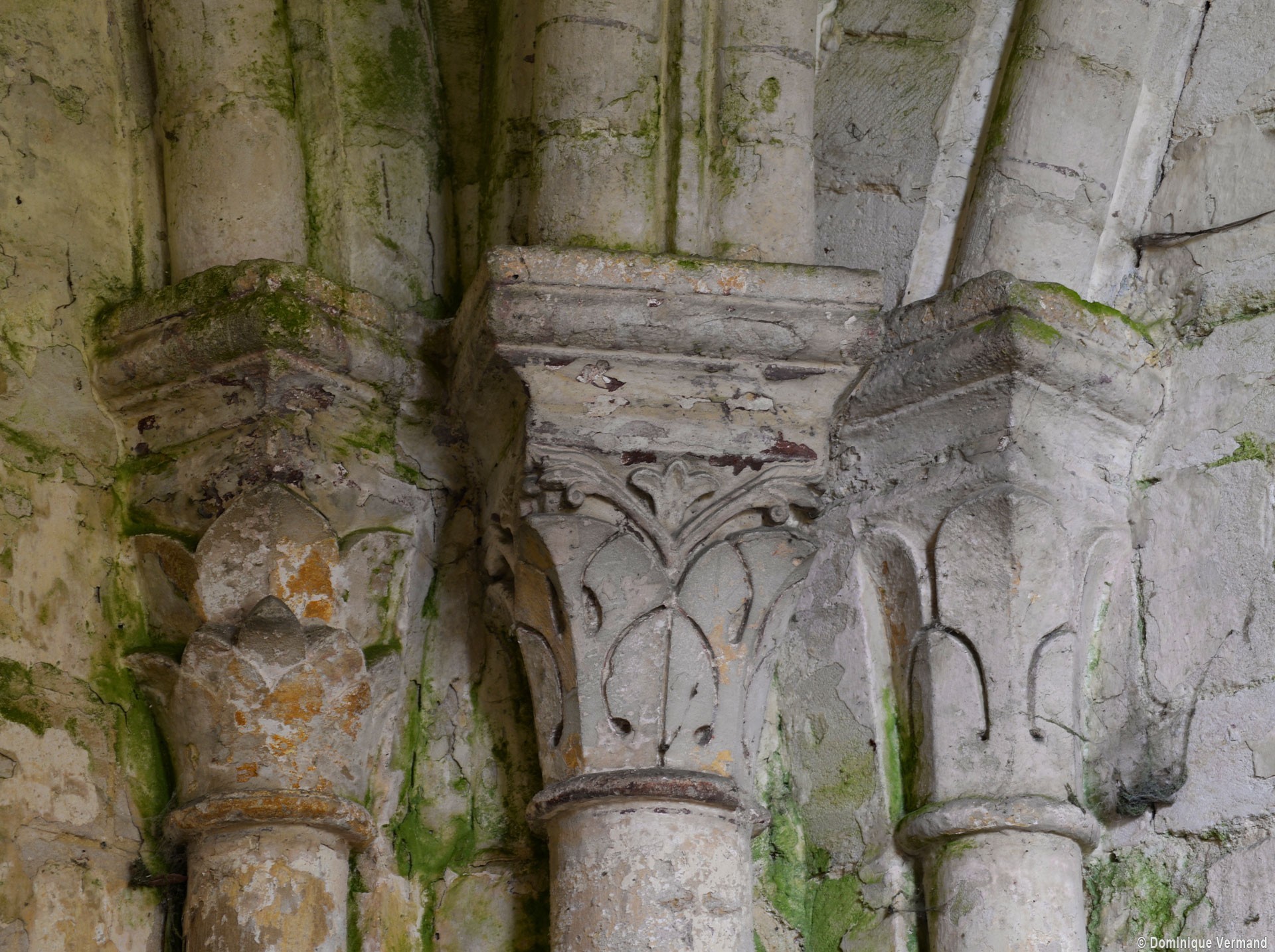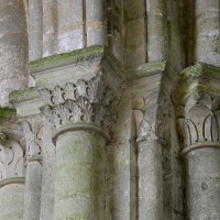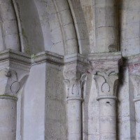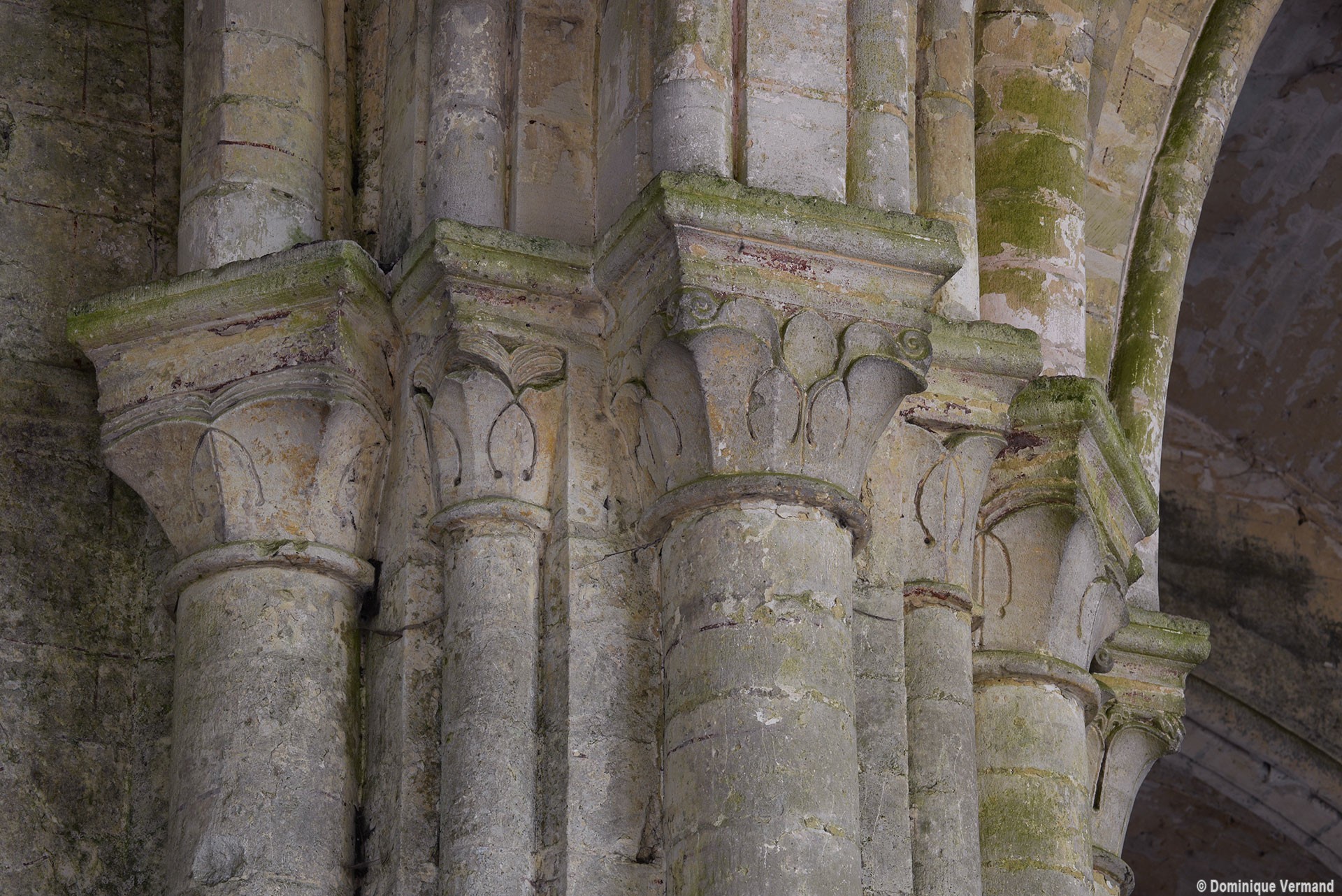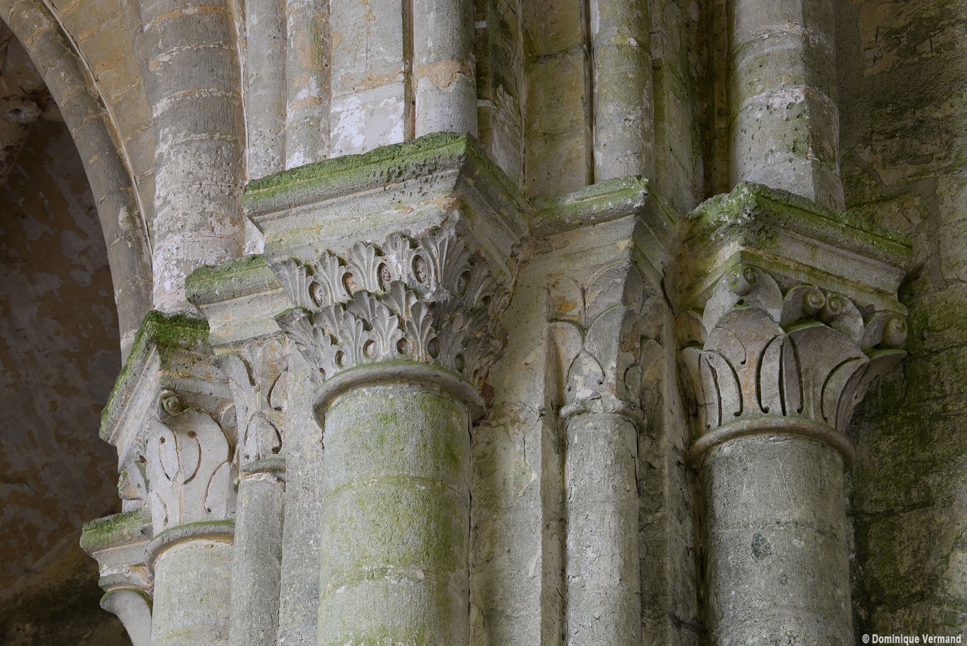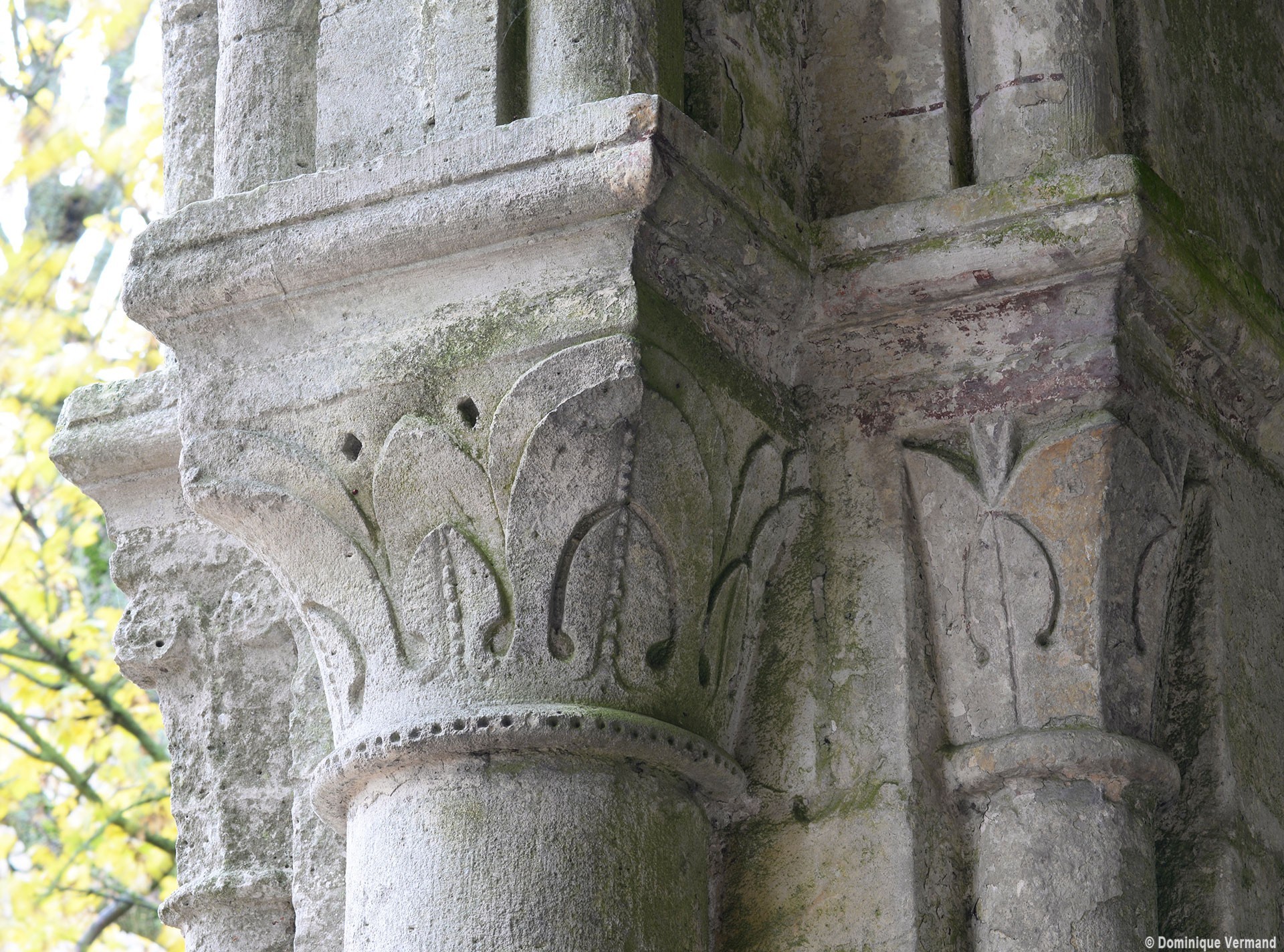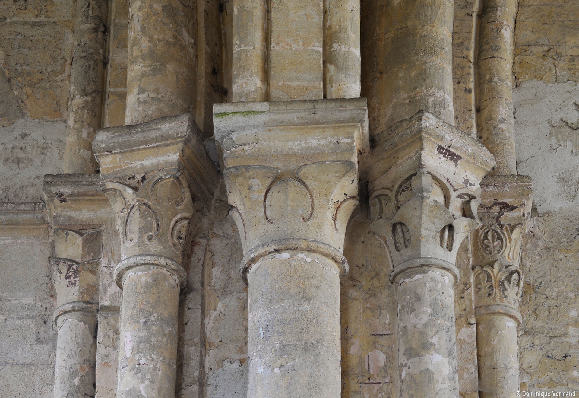 Le chœur, dont la voûte de la seconde travée est plus basse, a été traité avec un raffinement plus poussé – arcs formerets, colonnettes et moulures toriques encadrant les fenêtres – que l’on ne retrouve pas au transept. Dans leur grande majorité, les chapiteaux montrent des variations sur le thème de la feuille plate – dite également feuille d’eau -, également très présent à Senlis et originaire du Beauvaisis.