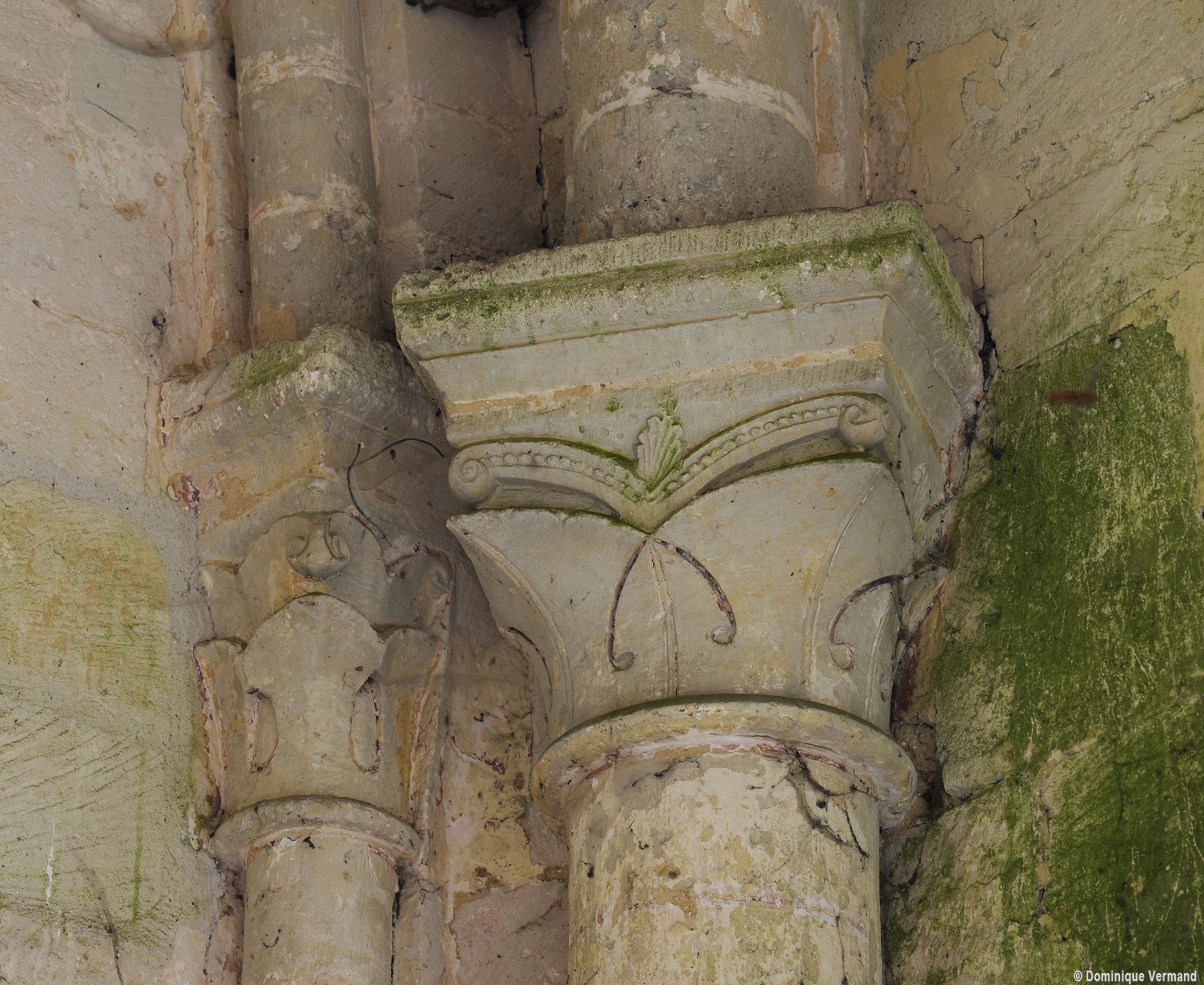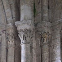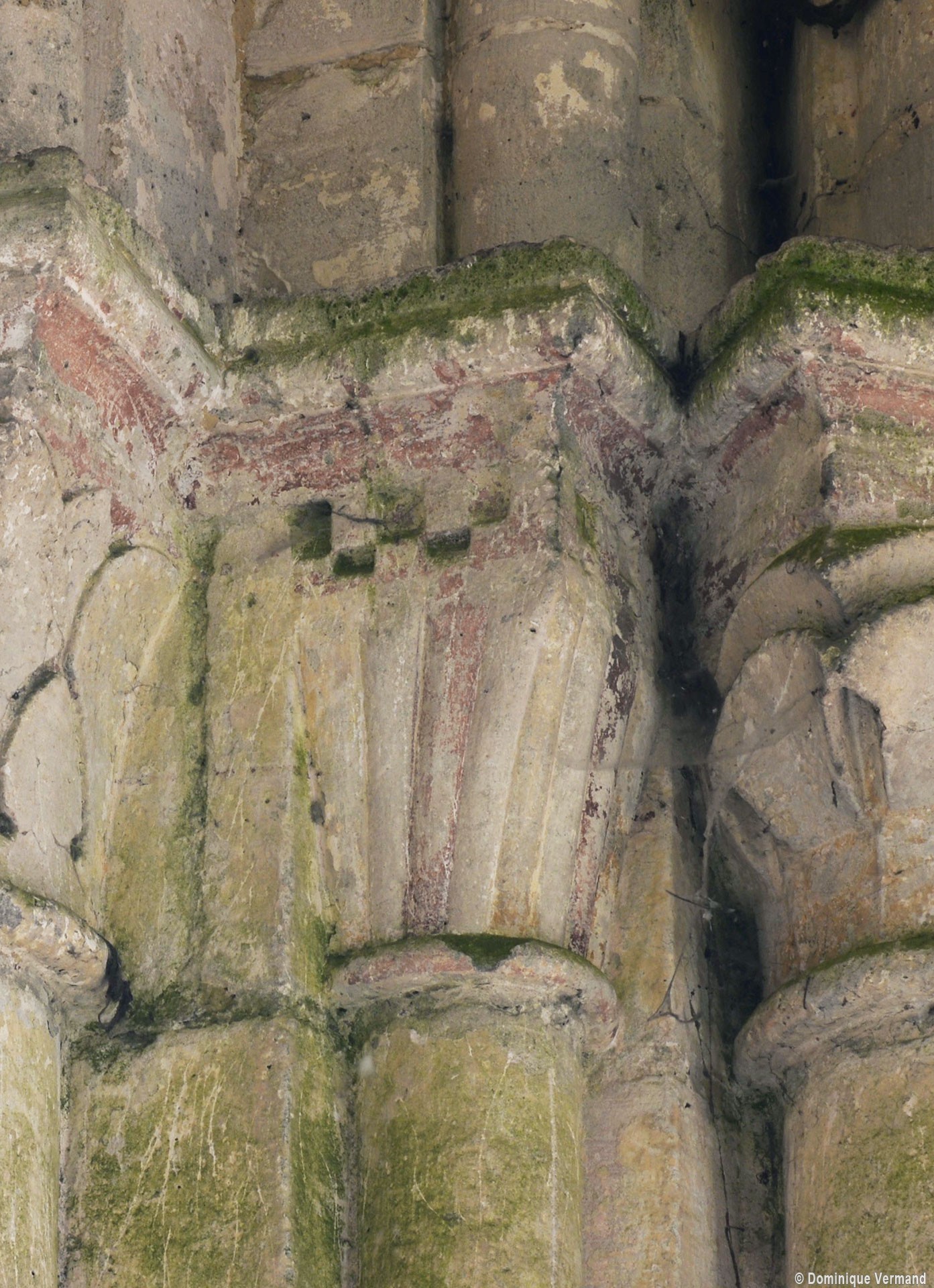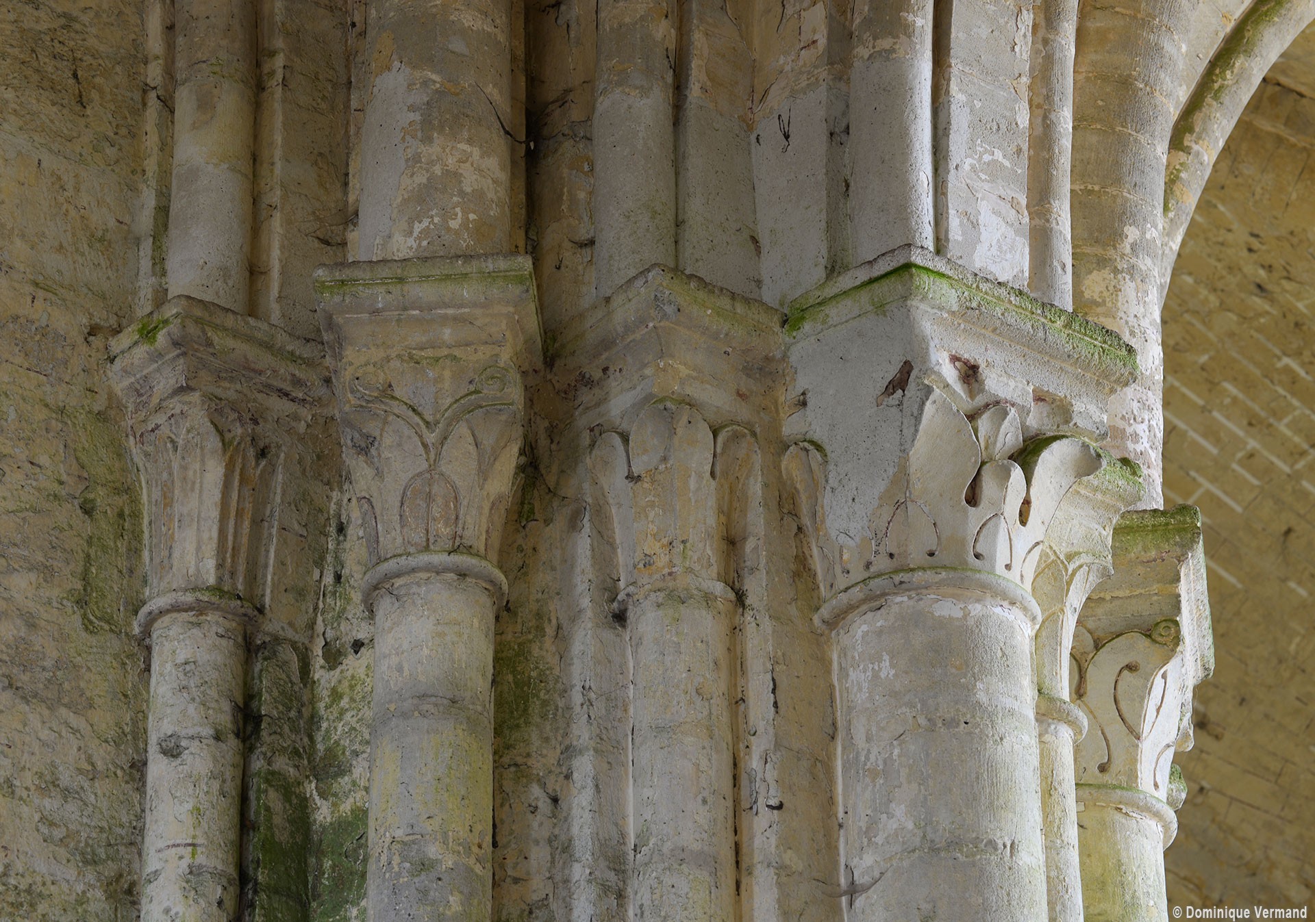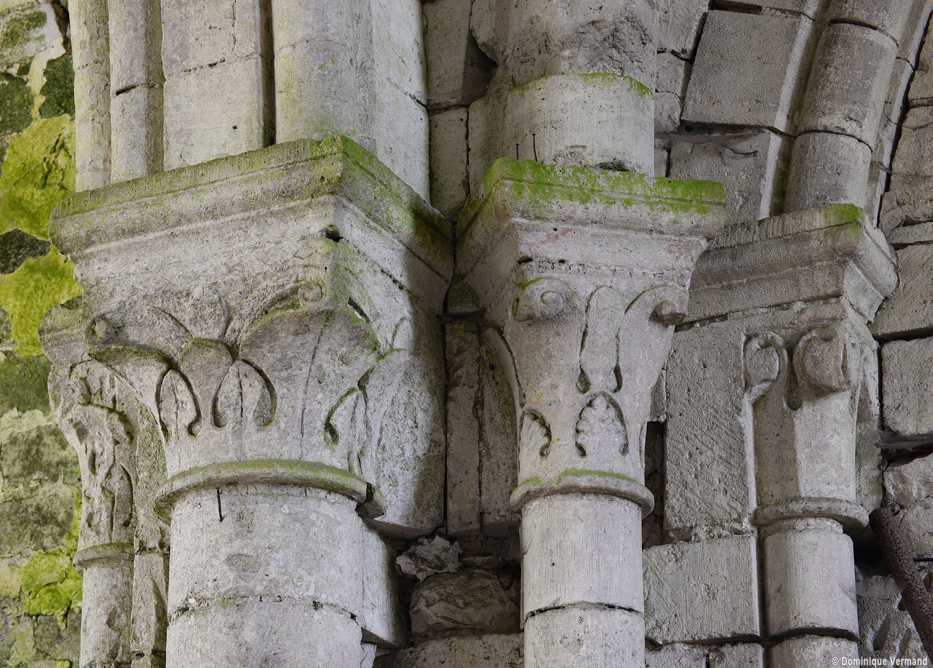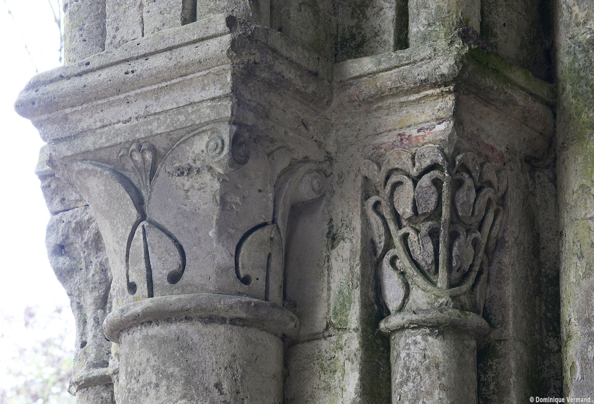 Le chœur, dont la voûte de la seconde travée est plus basse, a été traité avec un raffinement plus poussé – arcs formerets, colonnettes et moulures toriques encadrant les fenêtres – que l’on ne retrouve pas au transept. Dans leur grande majorité, les chapiteaux montrent des variations sur le thème de la feuille plate – dite également feuille d’eau -, également très présent à Senlis et originaire du Beauvaisis.