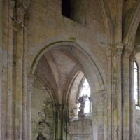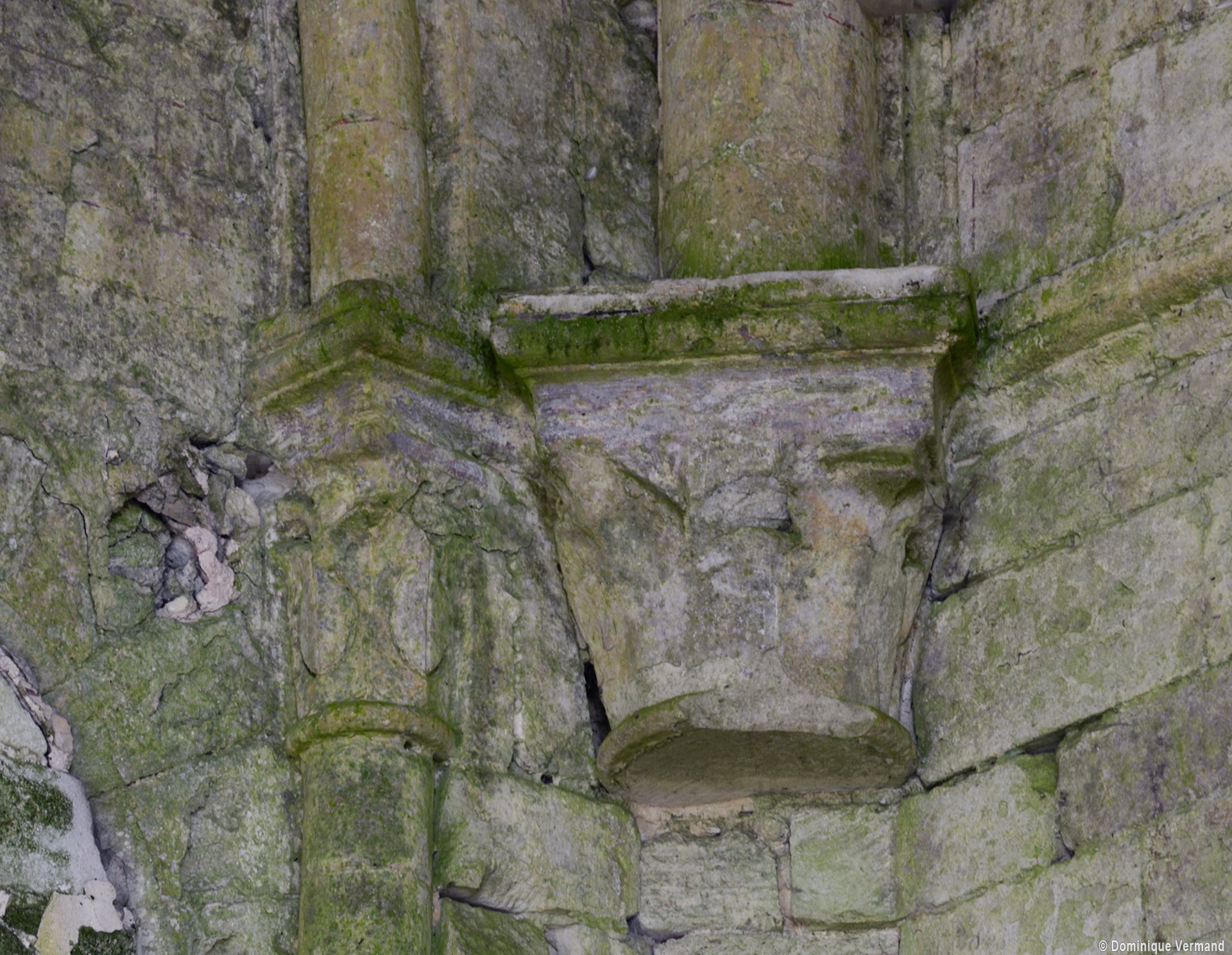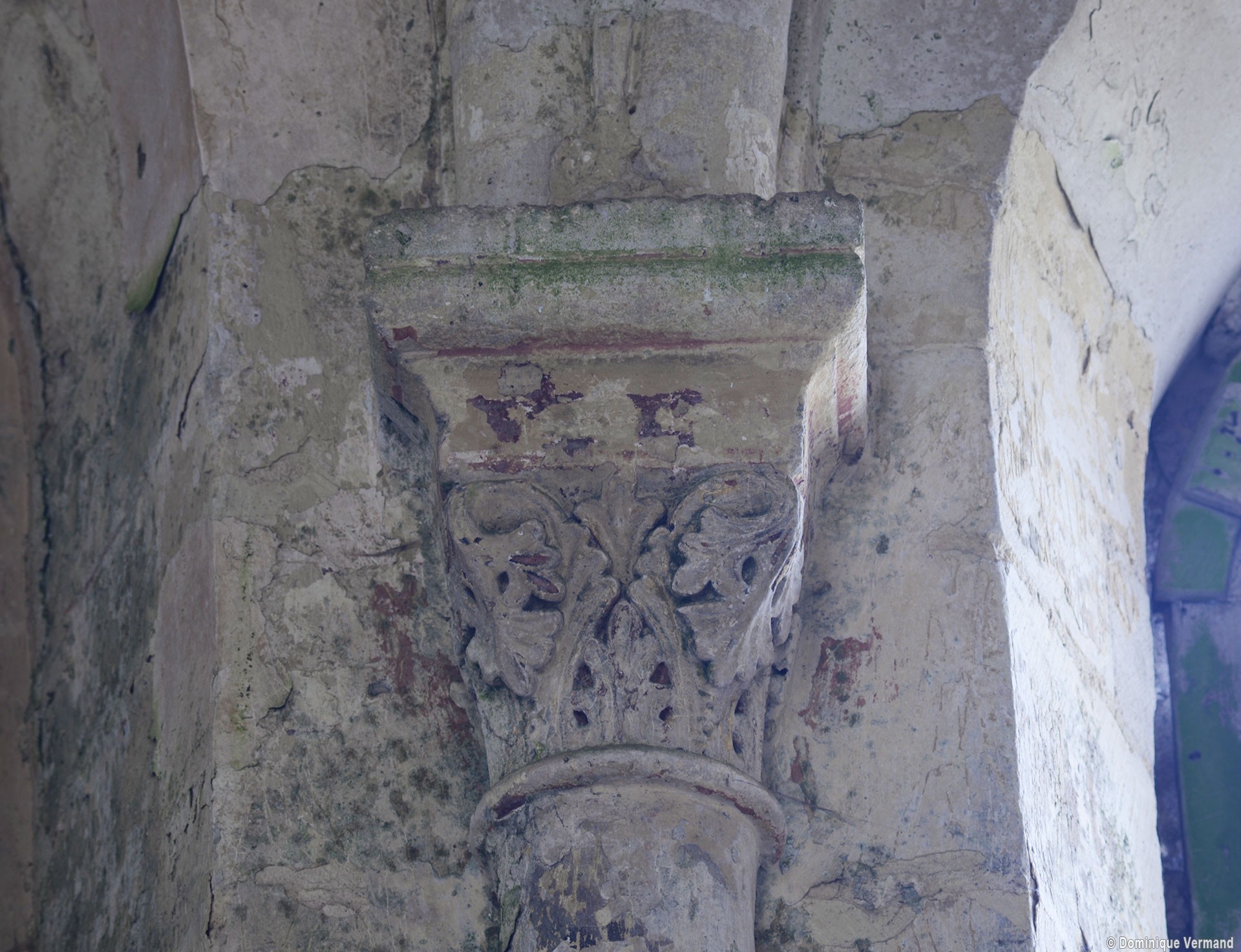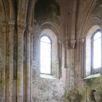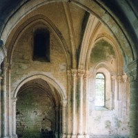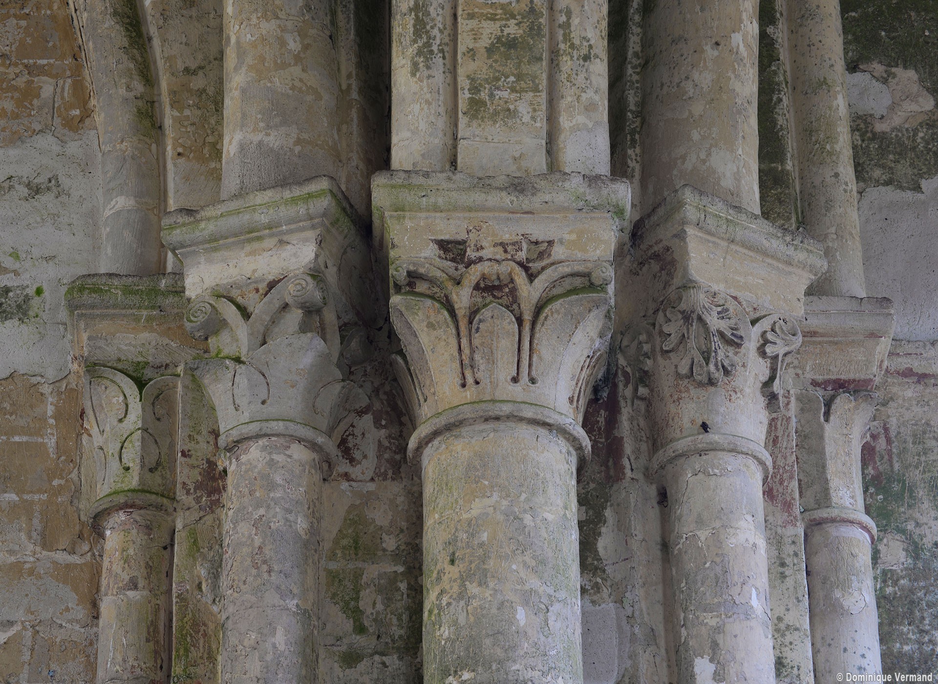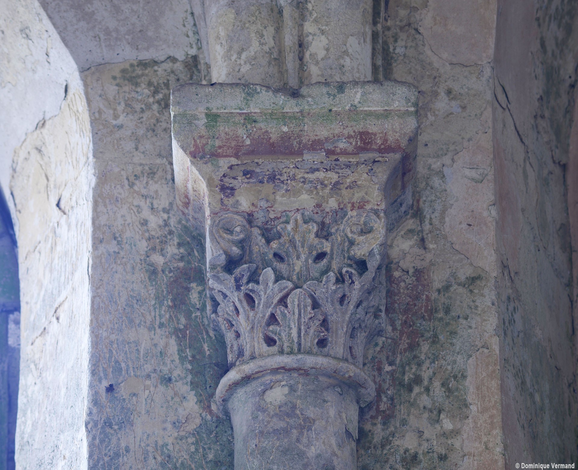 Le chœur, dont la voûte de la seconde travée est plus basse, a été traité avec un raffinement plus poussé – arcs formerets, colonnettes et moulures toriques encadrant les fenêtres – que l’on ne retrouve pas au transept. Dans leur grande majorité, les chapiteaux montrent des variations sur le thème de la feuille plate – dite également feuille d’eau -, également très présent à Senlis et originaire du Beauvaisis.
