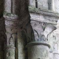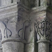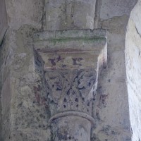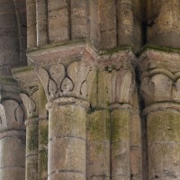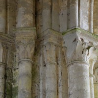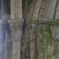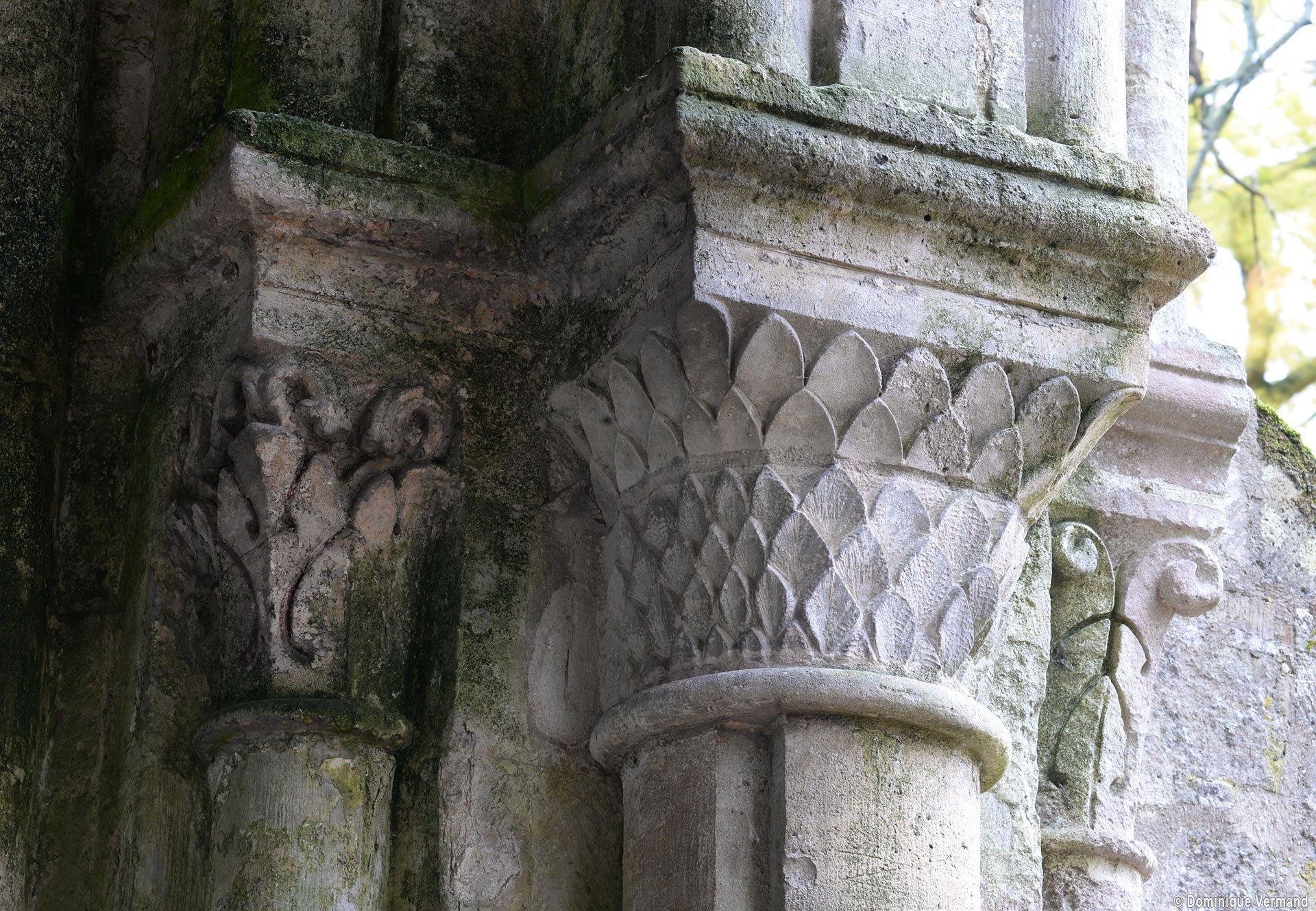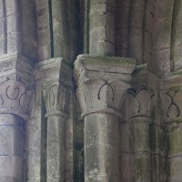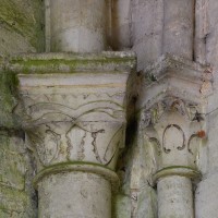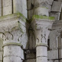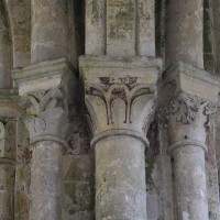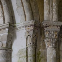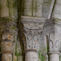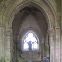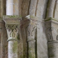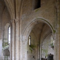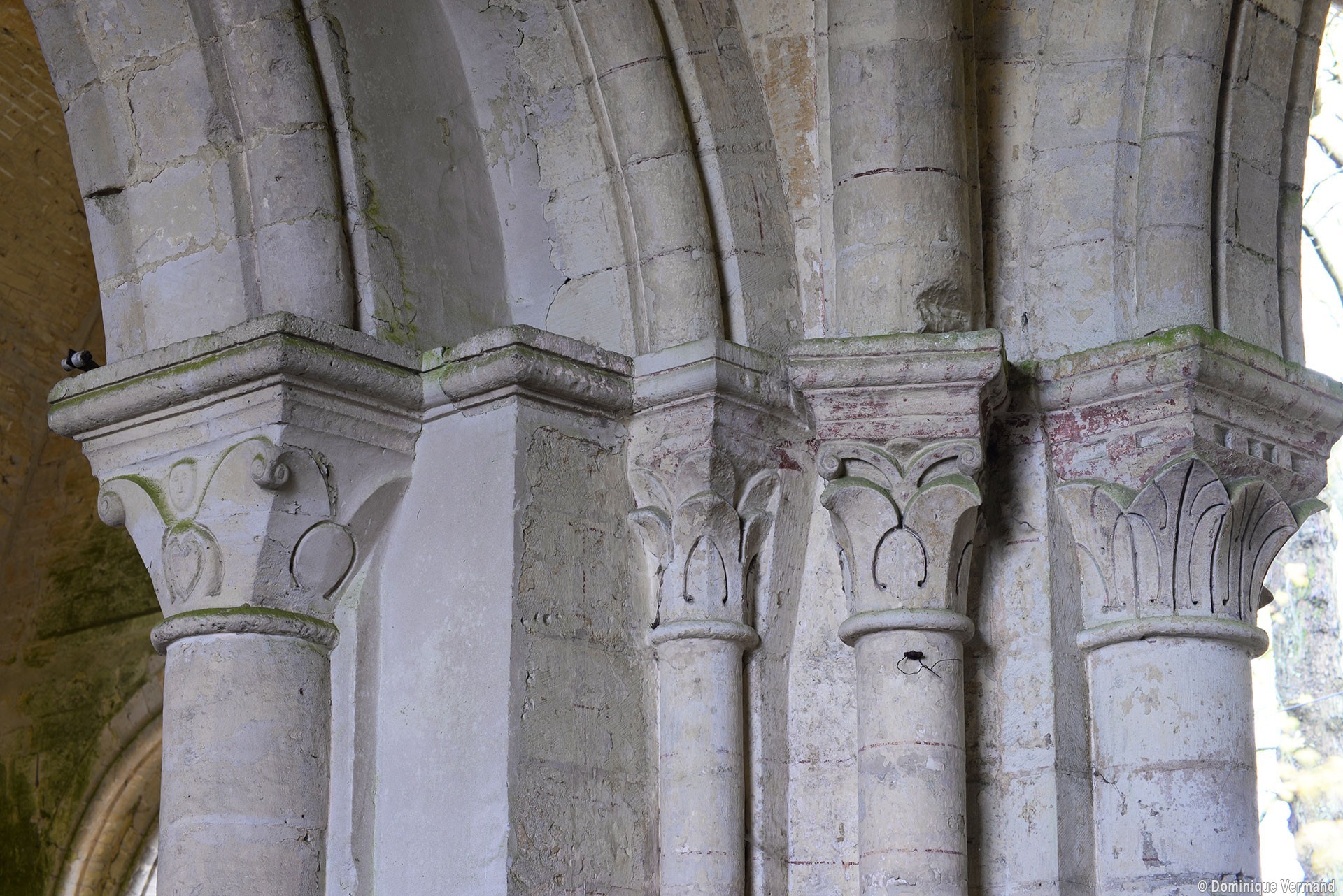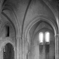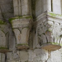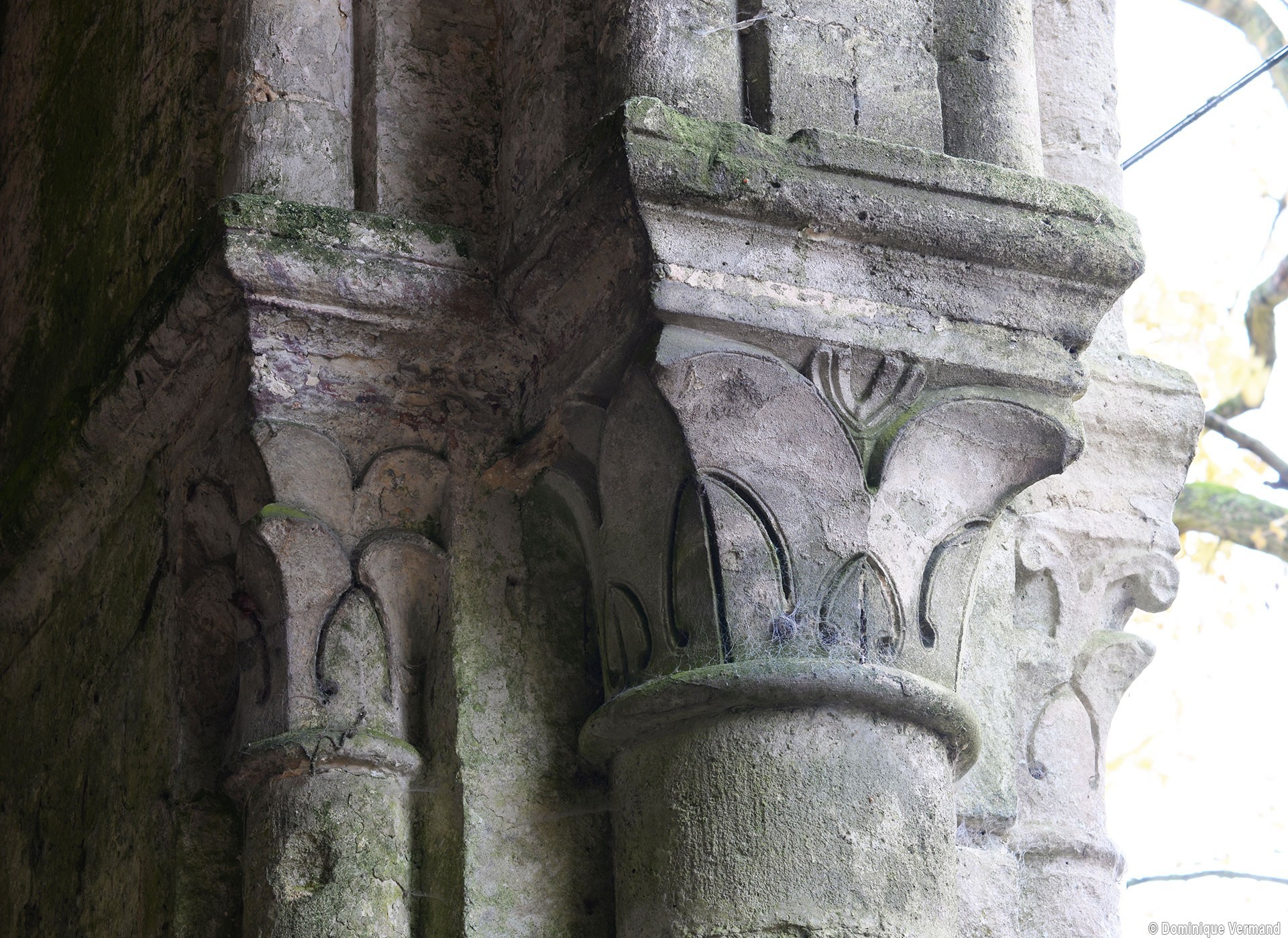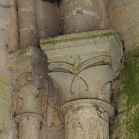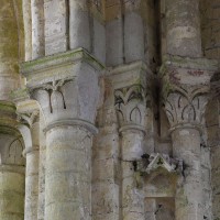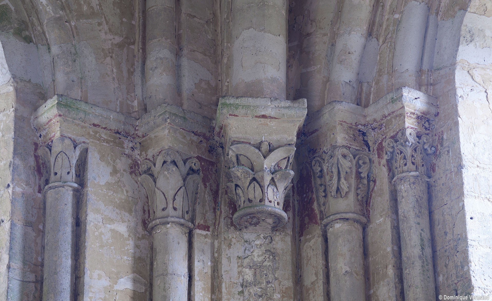 Le chœur, dont la voûte de la seconde travée est plus basse, a été traité avec un raffinement plus poussé – arcs formerets, colonnettes et moulures toriques encadrant les fenêtres – que l’on ne retrouve pas au transept. Dans leur grande majorité, les chapiteaux montrent des variations sur le thème de la feuille plate – dite également feuille d’eau -, également très présent à Senlis et originaire du Beauvaisis.