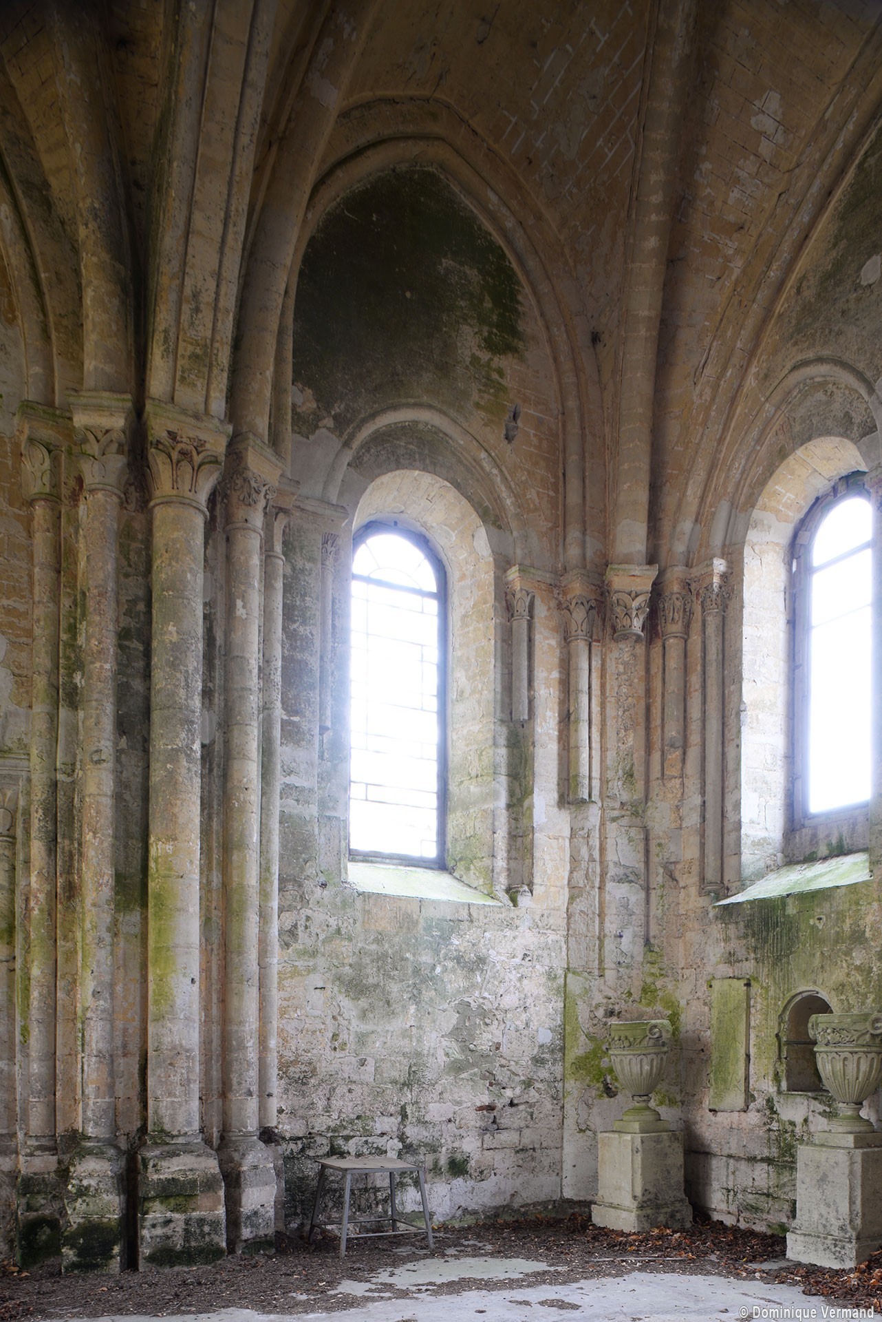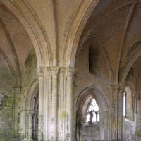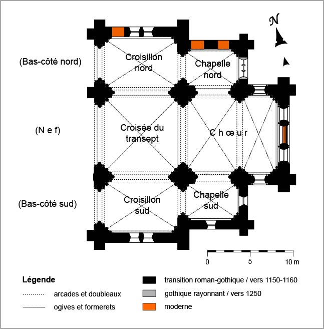 L’édifice est entièrement voûté d’ogives. Leur profil en amande de même que celui des arcs doubleaux et des arcades des chapelles (un double ressaut adouci par des tores) sont absolument identiques à ceux rencontrés à la cathédrale senlisienne. Seule la voûte de la chapelle sud, dont l’ogive est profilée d’une arête entre deux tores, et les arcades faisant communiquer les deux chapelles avec le chœur, surbaissées et sans ressaut, échappent à la comparaison.