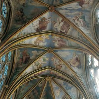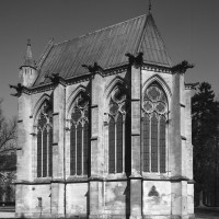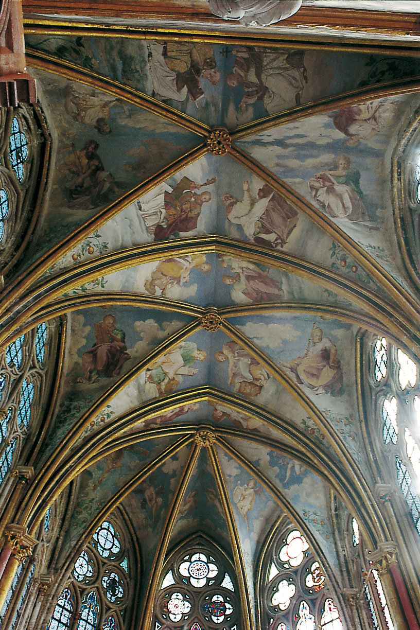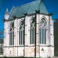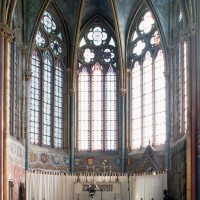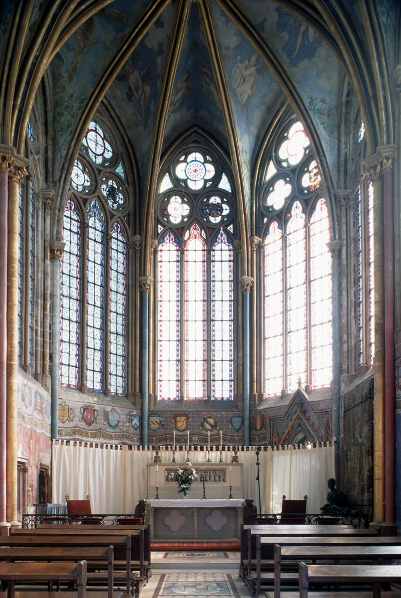 Très simple dans son économie générale, elle se compose d’une nef de trois travées et d’une abside à trois pans. Comme les chapelles palatines, épiscopales ou abbatiales de ce temps, c’est une véritable cage de verre dont les immenses fenêtres, prenant appui au-dessus d’un mur de soubassement nu, occupent tout l’espace compris entre la voûte et les contreforts.
