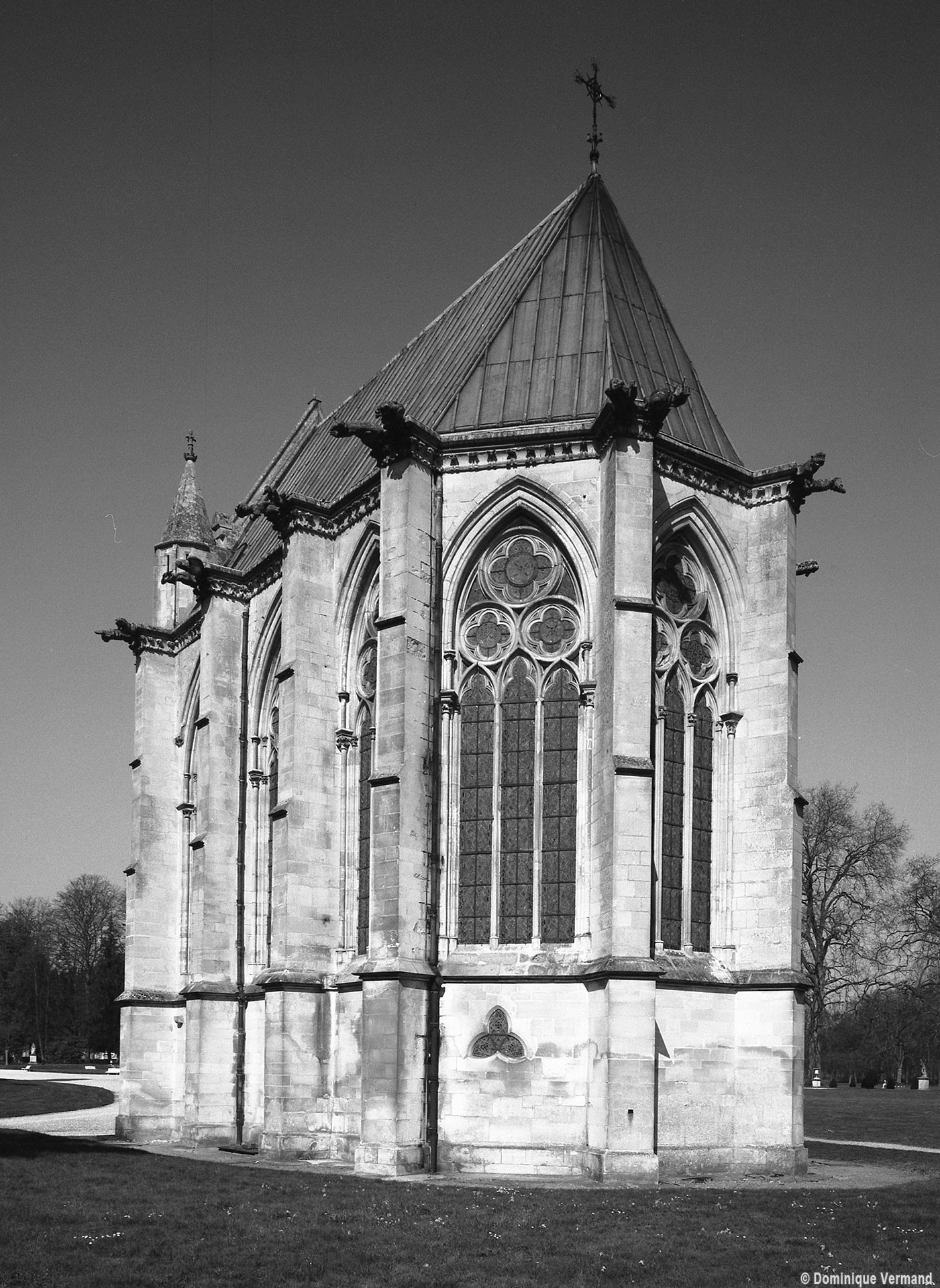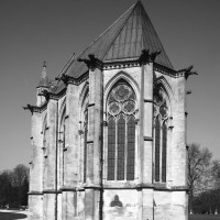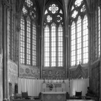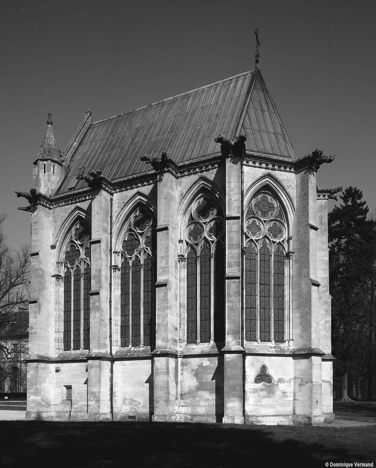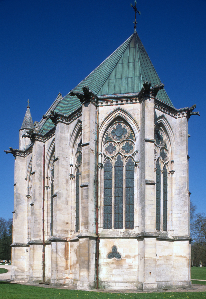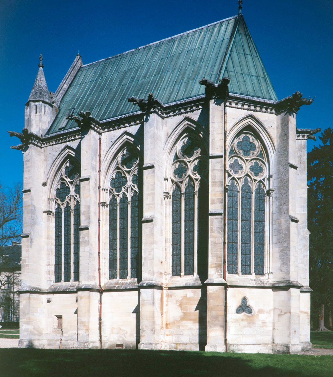Parfaite illustration du gothique rayonnant, le réseau de ces fenêtres, d’un type qui se retrouve à Saint-Denis et à Troyes ainsi qu’à la petite église d’Angicourt, dans l’Oise, est constitué de trois ou quatre lancettes surmontées de trois oculi inscrivant des quadrilobes. Les chapiteaux associés aux voûtes sont disposés “à bec” et participent d’une recherche d’effets graphiques très poussés.