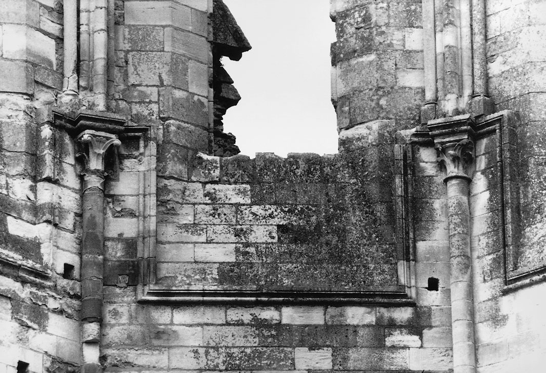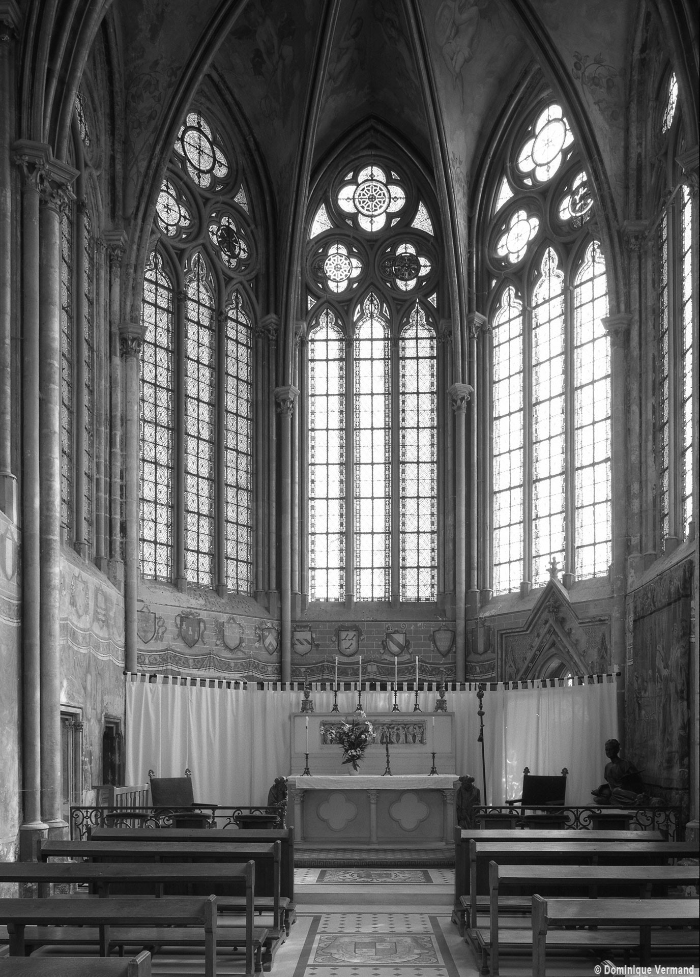 Les colonnes prolongeant les murs qui les séparent sont surmontées de chapiteaux garnis de crochets, d’une sculpture assez répétitive mais d’une grande qualité d’exécution. Les fenêtres hautes sont de simples lancettes. La nudité de la surface murale séparant les arcades de ces fenêtres est atténuée par une moulure qui, soulignant la base de l’ébrasement inférieur de la fenêtre, remonte de chaque côté pour retrouver le tailloir, avec lequel elle se confond, des chapiteaux recevant les branches d’ogives de la voûte de l’hémicycle. Très originale, cette disposition est d’un effet esthétique particulièrement heureux.