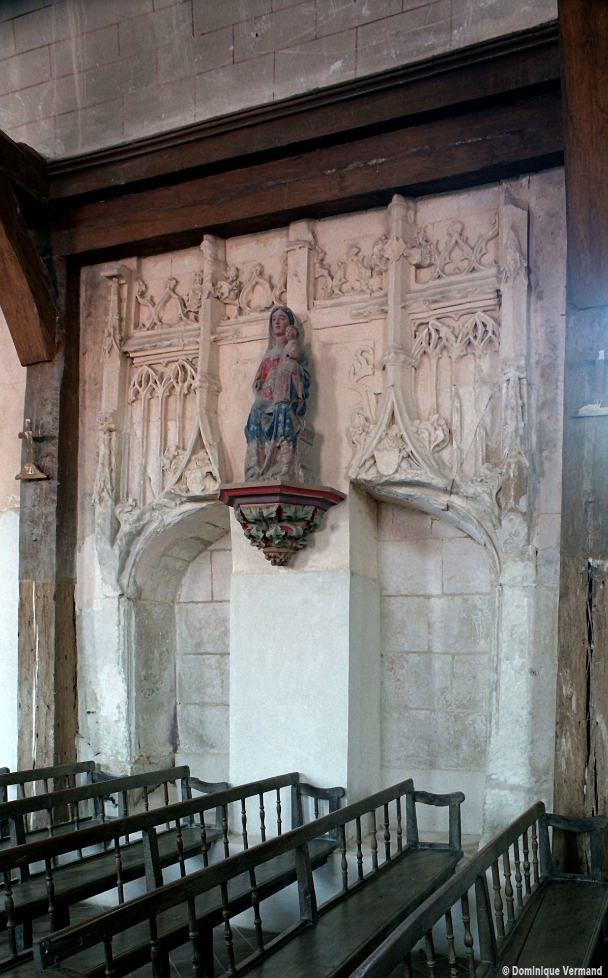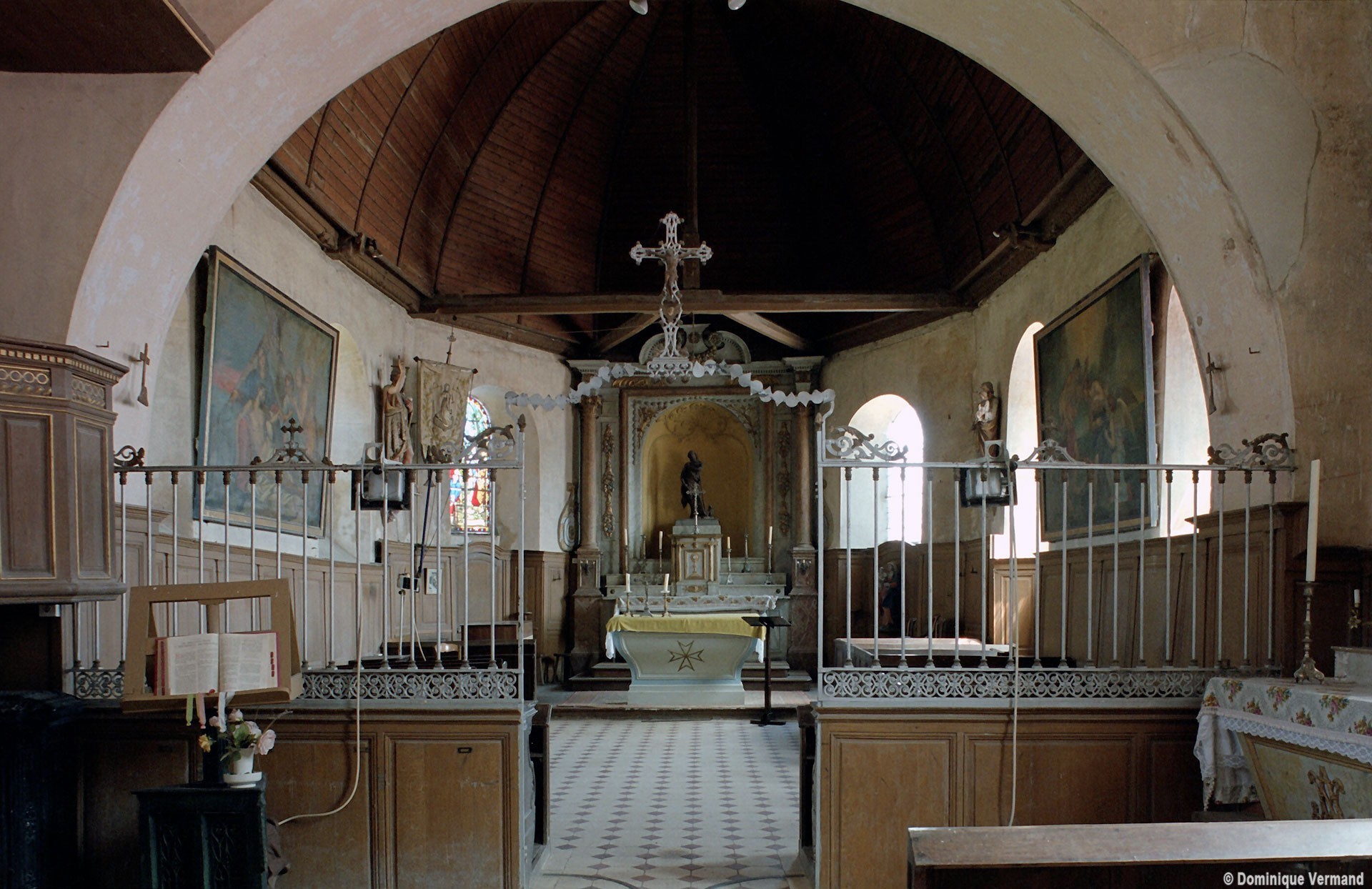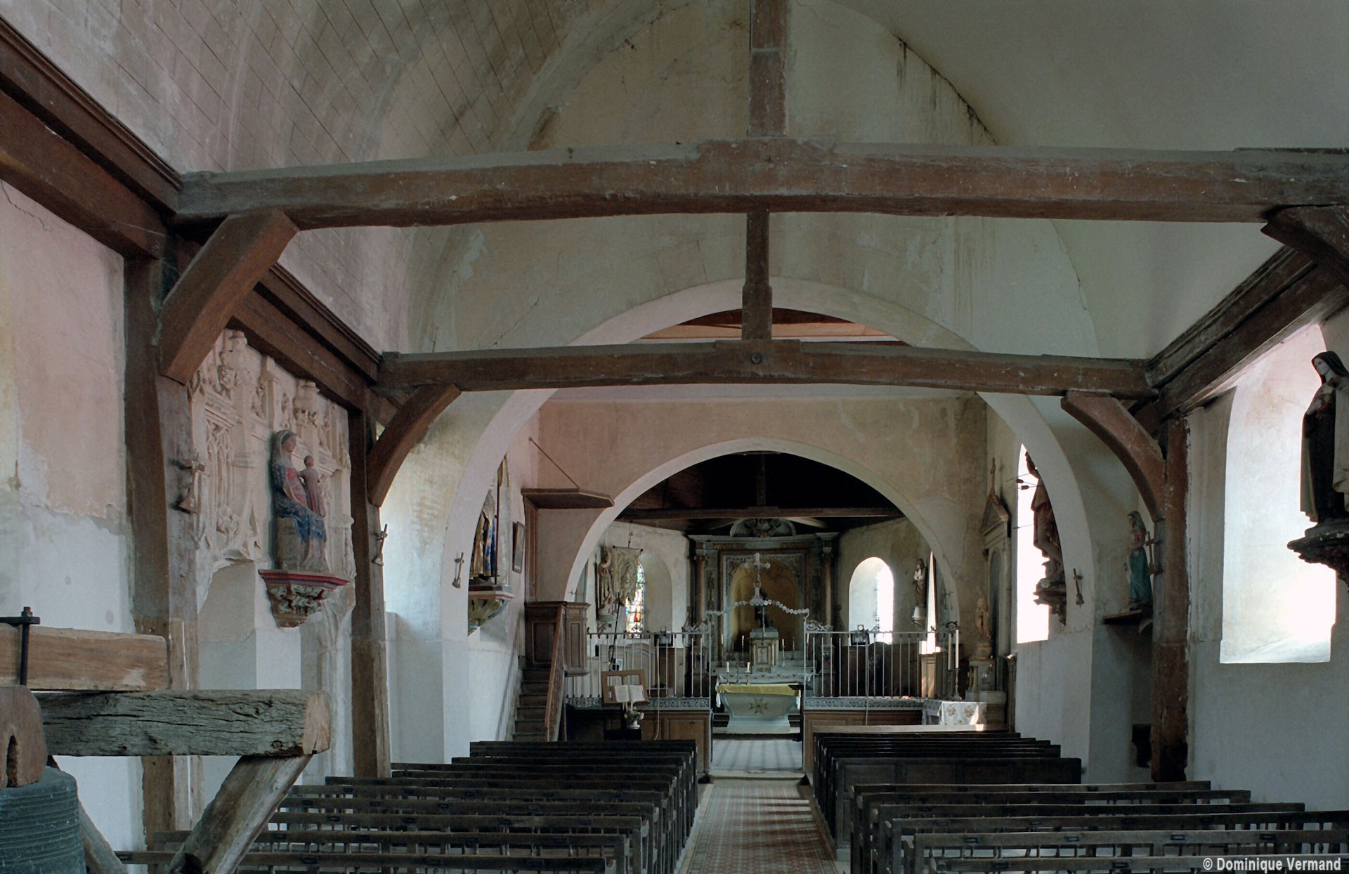 L’intérieur est nettement compartimenté par les deux arcades en plein cintre correspondant à la base du clocher. Une belle charpente en carène du 17ème siècle couvre le choeur. Dans le mur nord de la nef est incrusté le tombeau de Jean de Pisseleu, seigneur de Fontaine au 16ème siècle. Le gisant a disparu, mais l’enfeu, bien que dégradé, s’enrichit d’un très beau décor gothique flamboyant qui pose la question de l’existence d’une église en ce lieu avant l’actuelle, où il aurait été transféré. Parmi le mobilier, on remarque une cloche datée de 1770, déposée dans la nef, un bel autel du 17ème siècle et deux Vierges à l’Enfant, dont une assise (2007).
