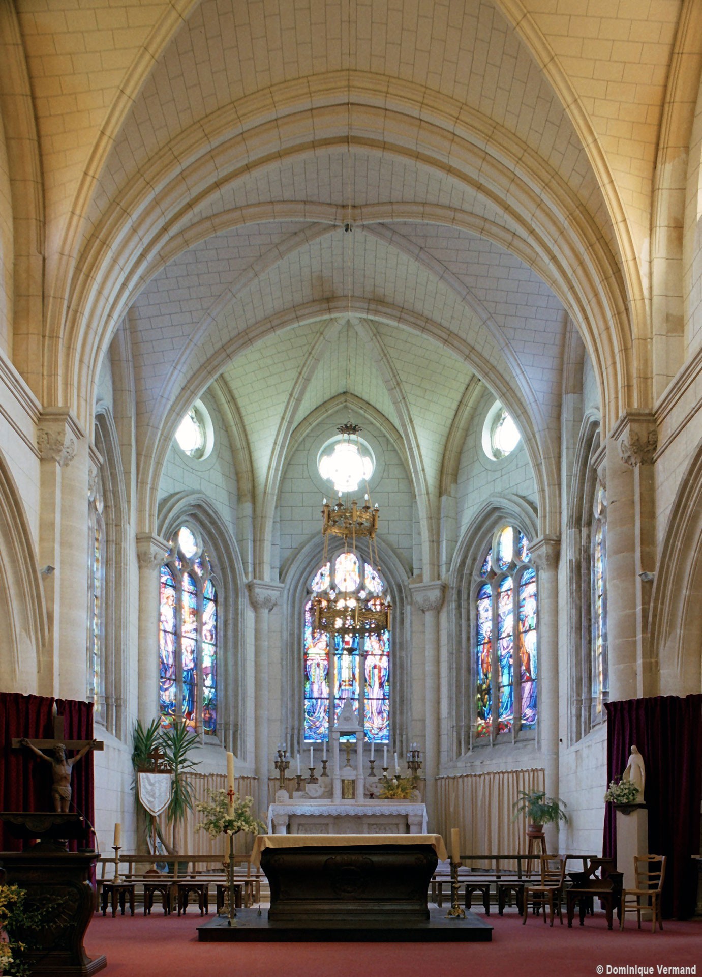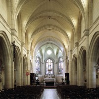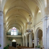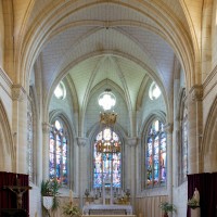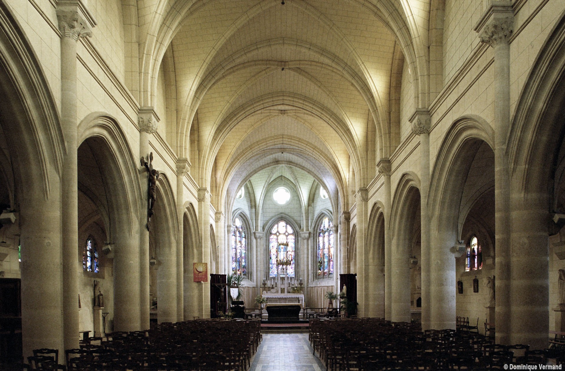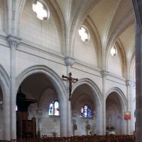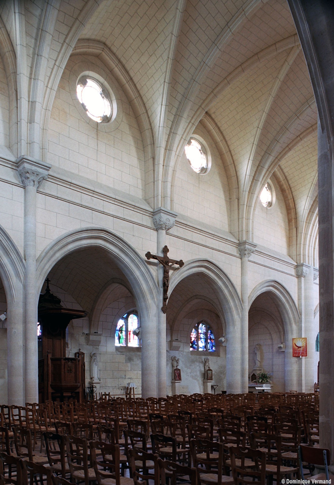 A l’intérieur, prenant appui sur les anciennes arcades, les parties hautes de la nef, ajourées par des oculi, sont couvertes de voûtes d’ogives reçues sur des chapiteaux librement inspirés des chapiteaux gothiques. Les bas-côtés reçoivent des voûtes d’arêtes. Totalement repris à l’intérieur, le choeur comporte, au-dessus des fenêtres d’origine, des oculi qui font écho à ceux de la nef.