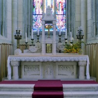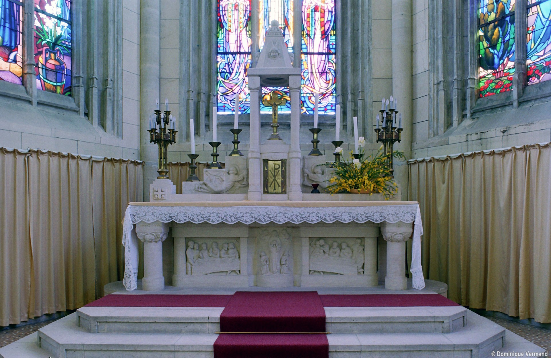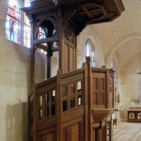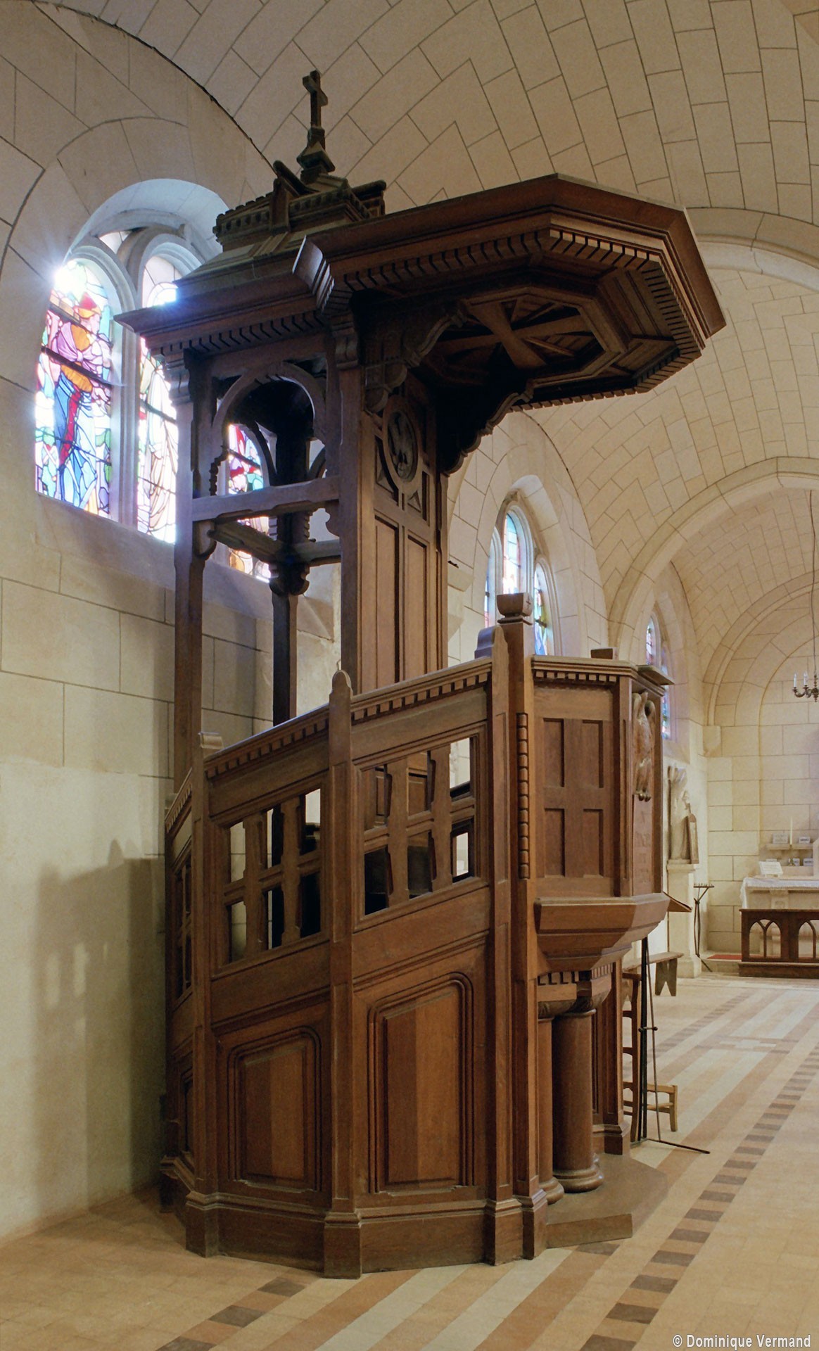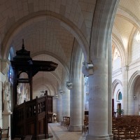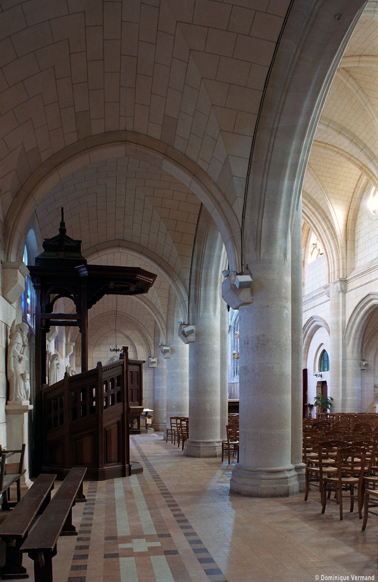 A l’intérieur, prenant appui sur les anciennes arcades, les parties hautes de la nef, ajourées par des oculi, sont couvertes de voûtes d’ogives reçues sur des chapiteaux librement inspirés des chapiteaux gothiques. Les bas-côtés reçoivent des voûtes d’arêtes. Totalement repris à l’intérieur, le choeur comporte, au-dessus des fenêtres d’origine, des oculi qui font écho à ceux de la nef.