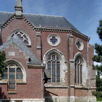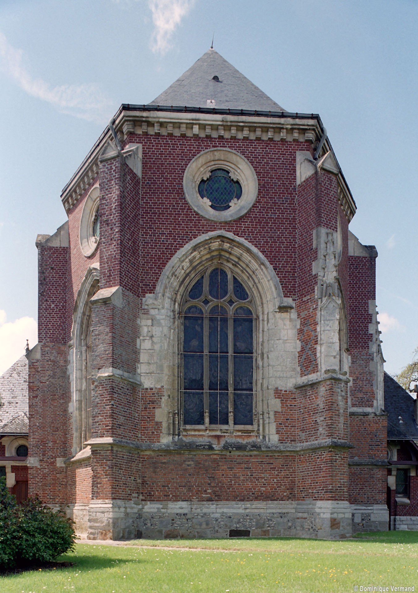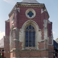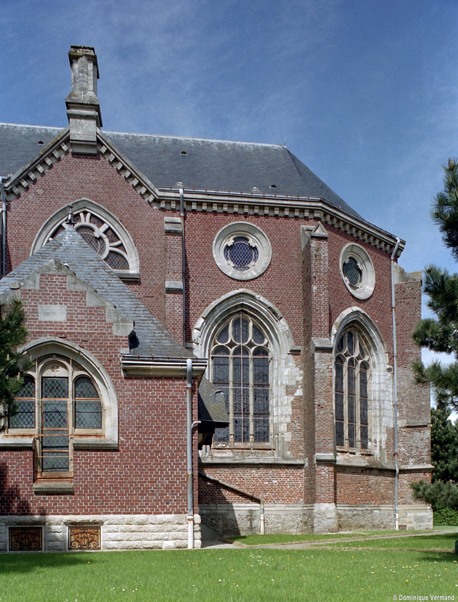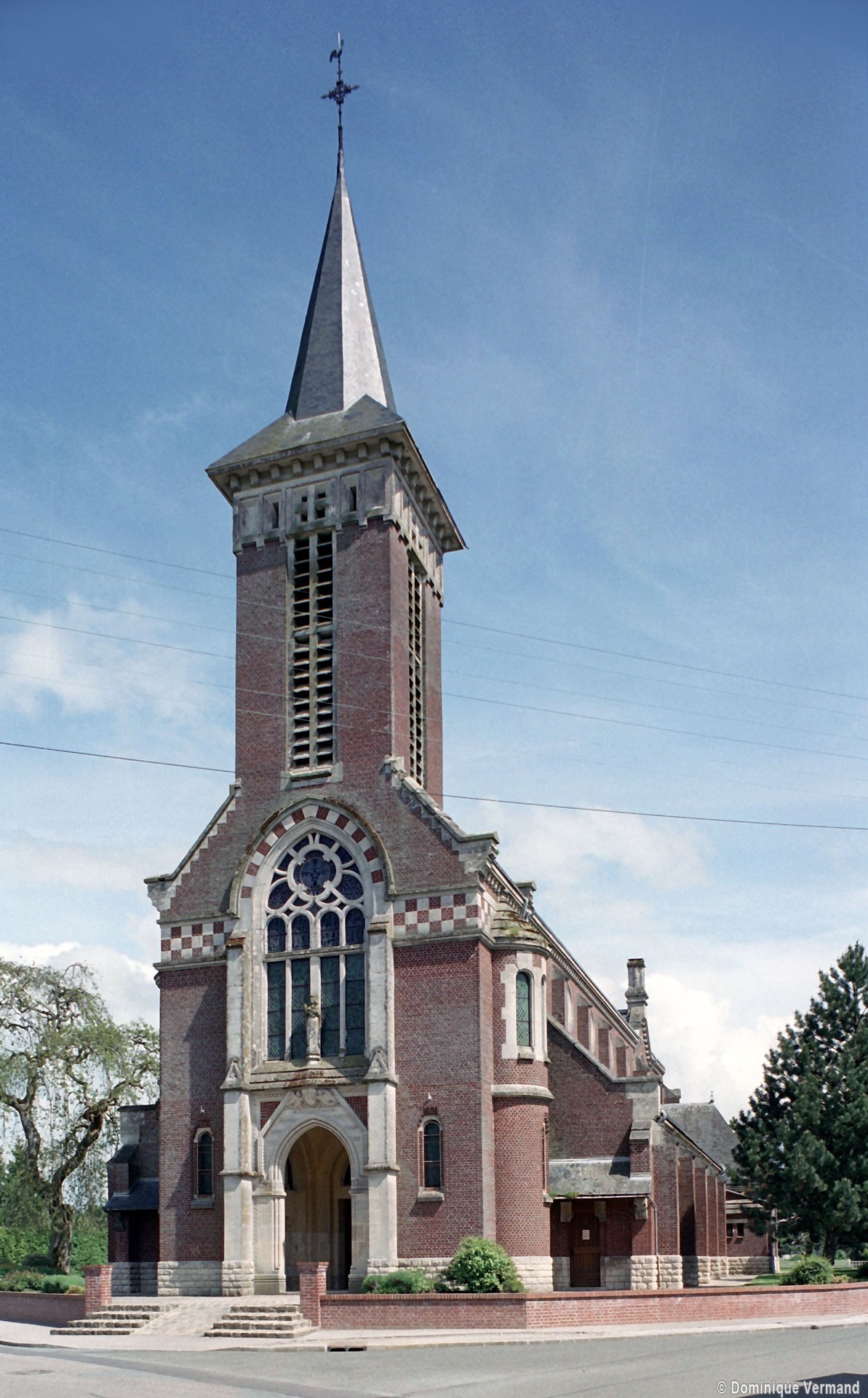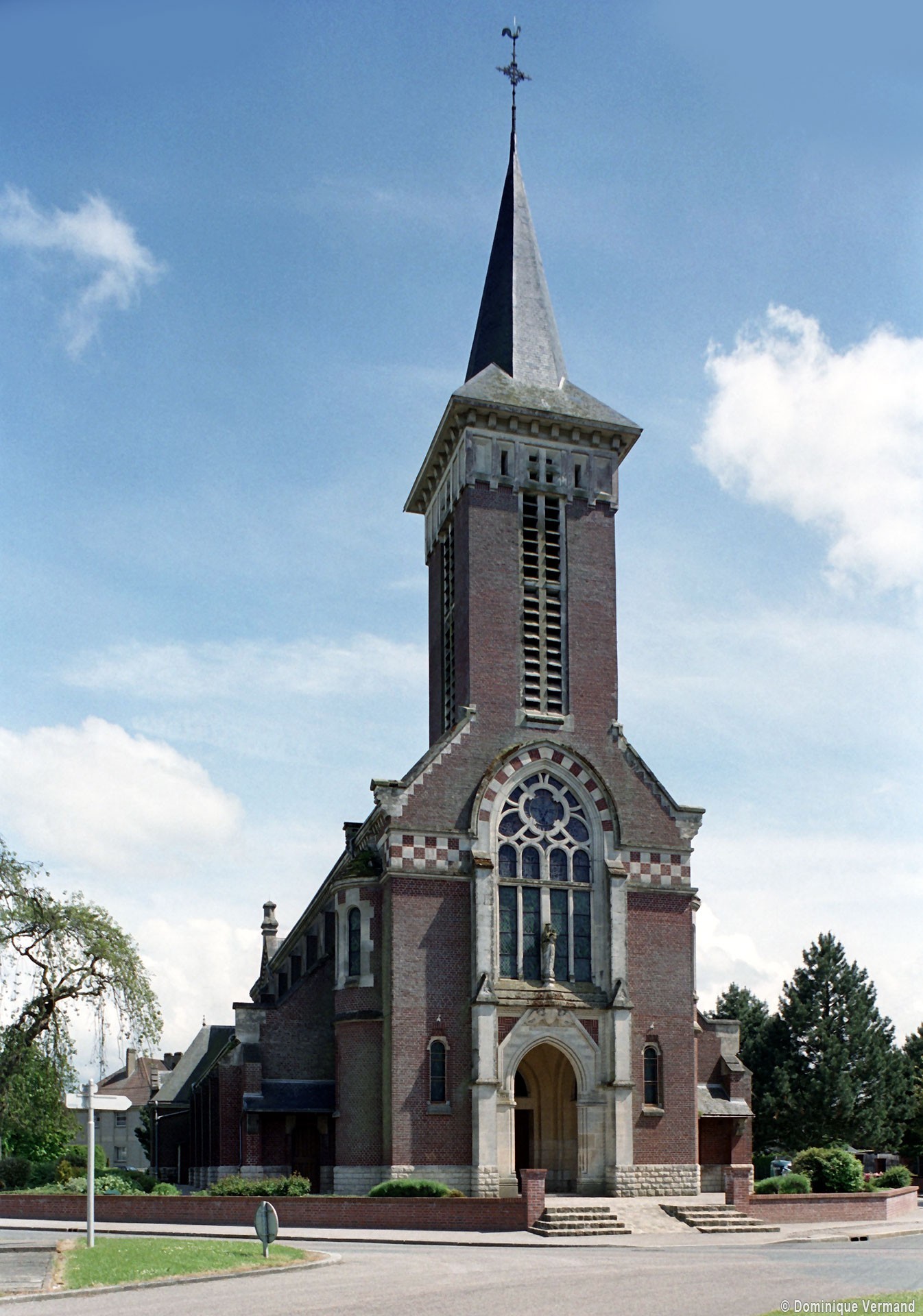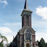 Achevée en 1937, l’église actuelle est composée d’une longue nef de six travées, avec bas-côtés, et d’un choeur à cinq pans. Un haut clocher formant porche s’élève en façade. Elle n’a conservé de la précédente que l’abside (partiellement) et les arcades, très restaurées, de la nef. Construite en briques, l’abside est ajourée de grandes fenêtres dont le réseau – refait – est déjà renaissance. Les contreforts ont des larmiers en pierre et deux, au nord, se terminent par des pinacles. Toute la partie haute est moderne.