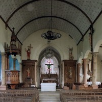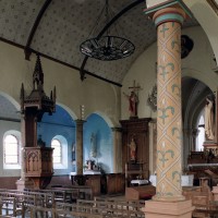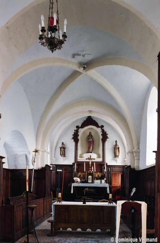 Reconstruite au 18ème siècle, la nef ouvre sur les bas-côtés par des arcades en cintre surbaissé retombant sur des piles circulaires. Tout l’édifice a été décoré au 19ème siècle d’une manière qui, discutable aujourd’hui, constitue cependant un bon exemple de l’idée que l’on se faisait à cette époque du Moyen Age. L’église a conservé plusieurs statues d’art populaire, dont un Saint-Amand avec les dragons et, surtout, une imposante et magnifique Vierge à l’Enfant, en pierre, du 16ème siècle (2005).