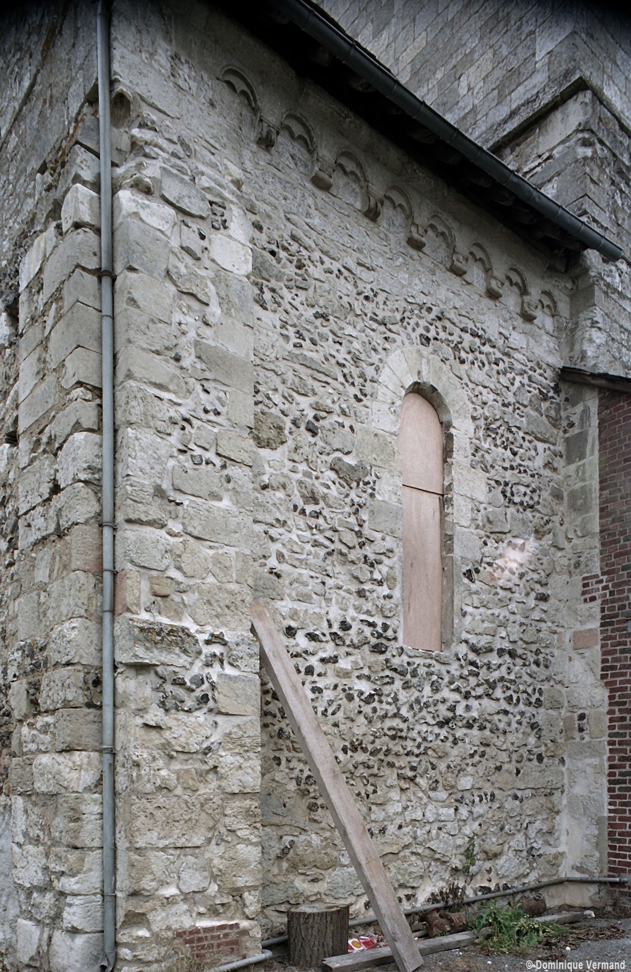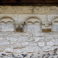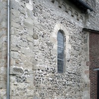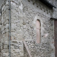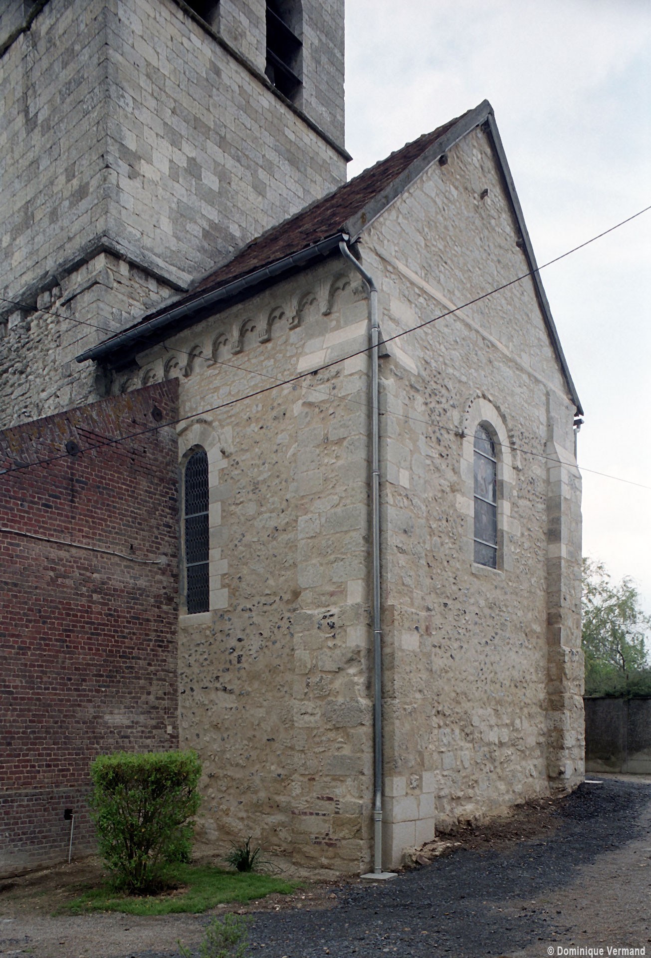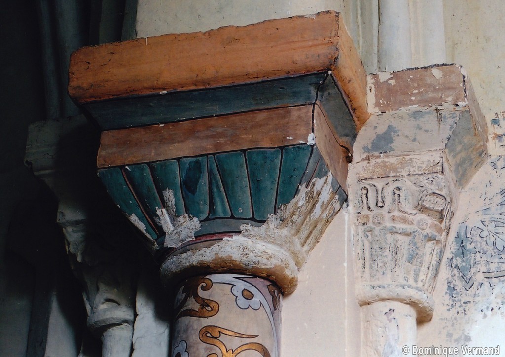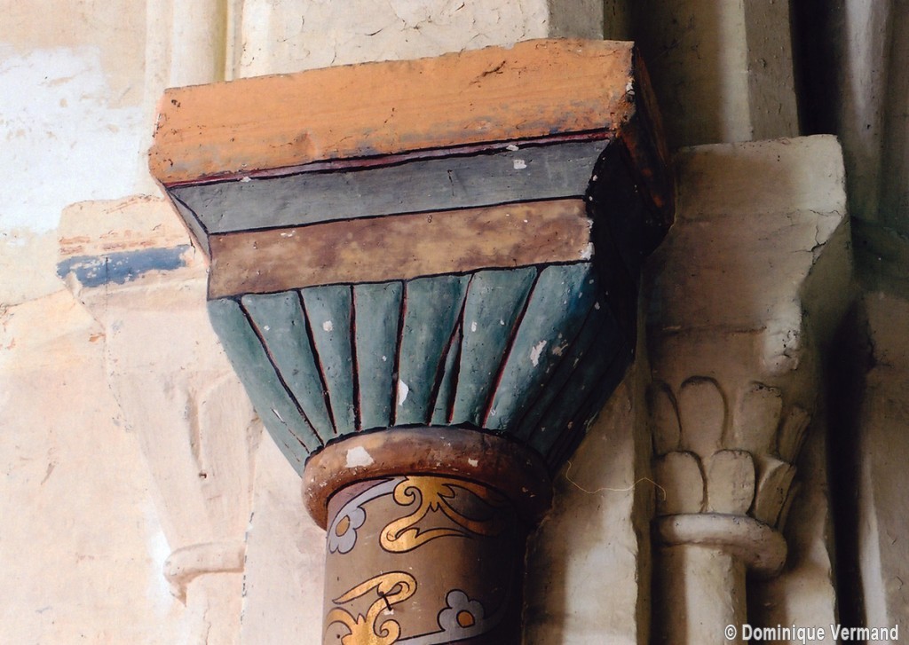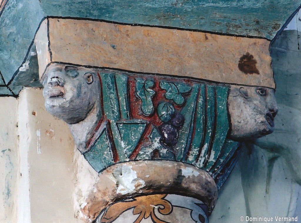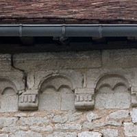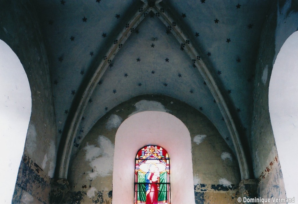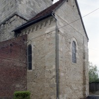 Profilées d’une arête entre deux tores, les ogives retombent, comme les deux arcs doubleaux, sur des chapiteaux au décor assez fruste. L’un représente trois petits personnages sous une gueule monstrueuse, deux autres comportent des têtes assez grotesques aux angles, deux autres encore montrent un décor de godrons (cornets), très répandu en Normandie et en Angleterre à cette époque. A l’extérieur, les murs – bâtis dans un mélange de moellons et de silex – sont épaulés par des contreforts très plats. Les fenêtres sont en plein cintre et celle du chevet est soulignée par un cordon de billettes. Très bien conservée, la corniche est une bonne illustration de la corniche dite » beauvaisine « , très répandue dans l’Oise au 12ème siècle. Elle est constituée d’une suite d’arcatures en plein cintre recoupées par deux petites arcatures secondaires et reposant sur des petits modillons au décor souvent géométrique.