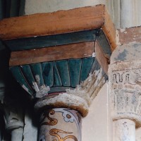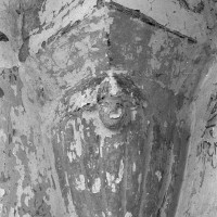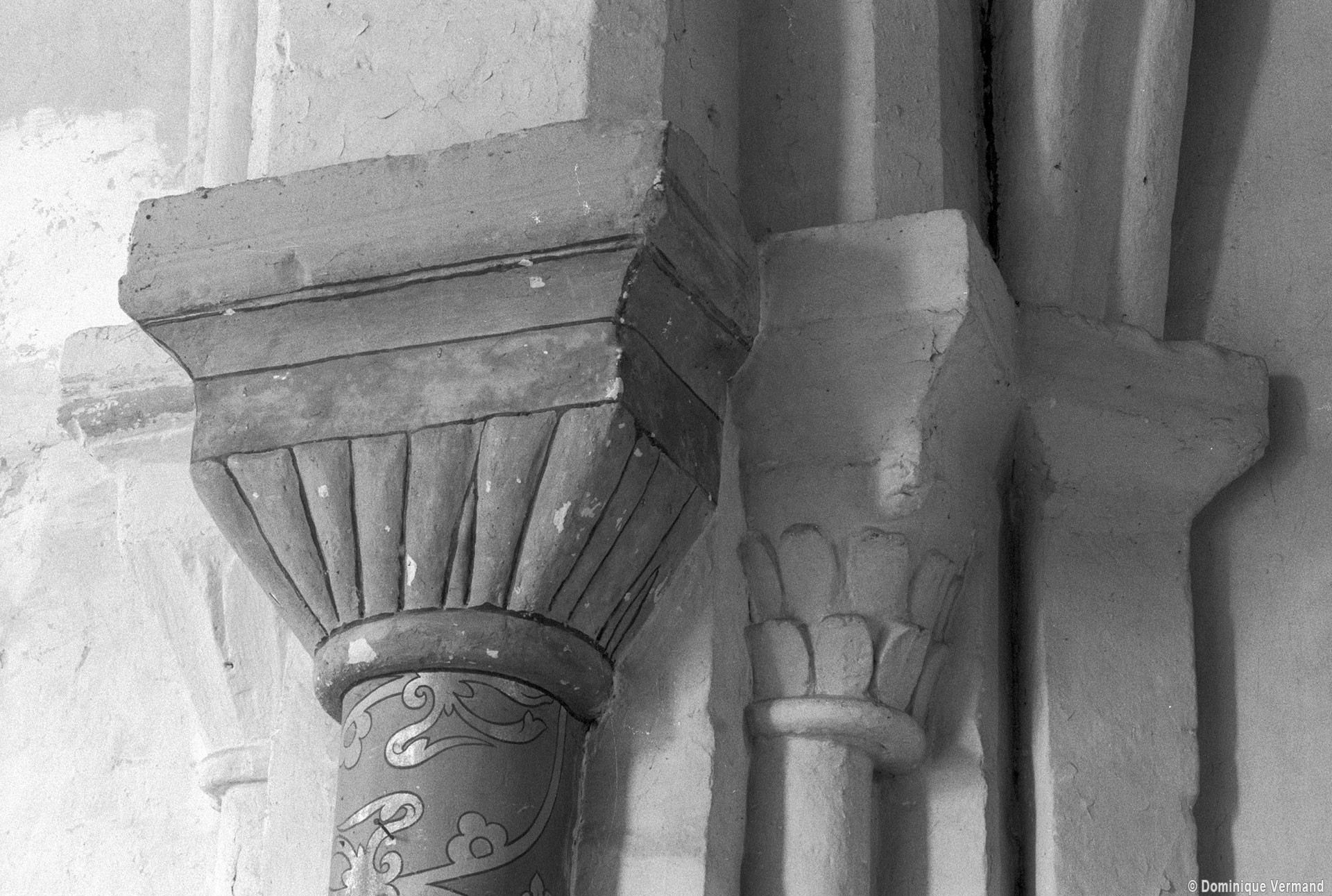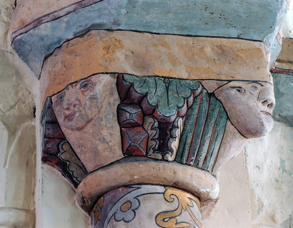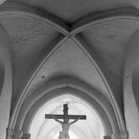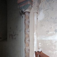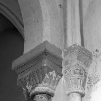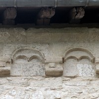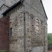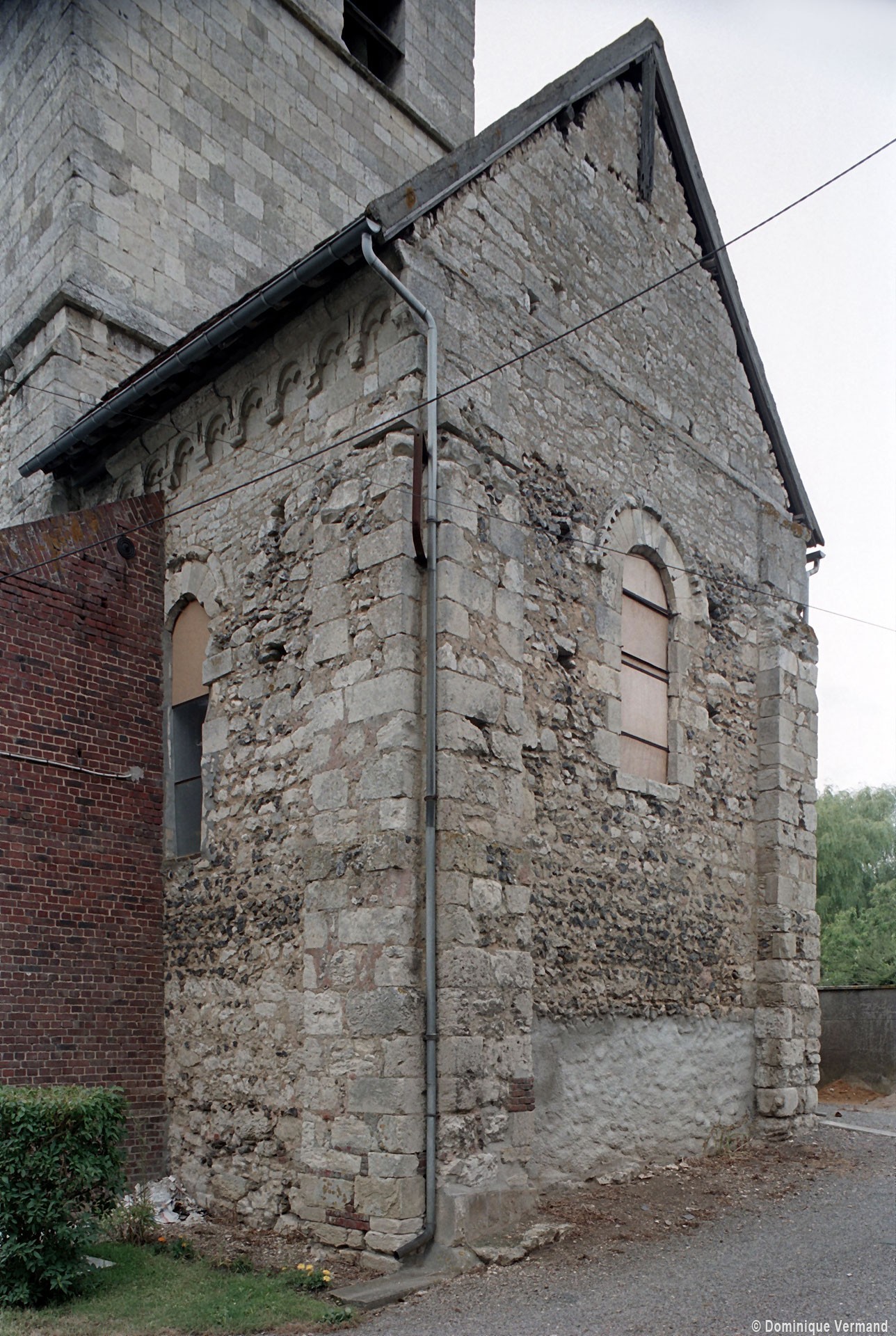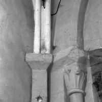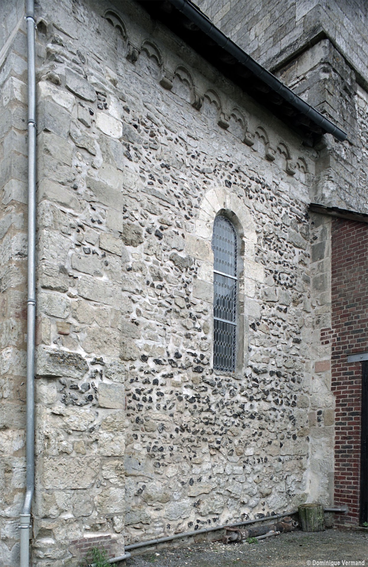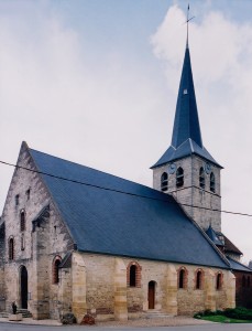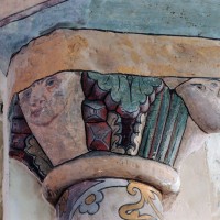 Profilées d’une arête entre deux tores, les ogives retombent, comme les deux arcs doubleaux, sur des chapiteaux au décor assez fruste. L’un représente trois petits personnages sous une gueule monstrueuse, deux autres comportent des têtes assez grotesques aux angles, deux autres encore montrent un décor de godrons (cornets), très répandu en Normandie et en Angleterre à cette époque. A l’extérieur, les murs – bâtis dans un mélange de moellons et de silex – sont épaulés par des contreforts très plats. Les fenêtres sont en plein cintre et celle du chevet est soulignée par un cordon de billettes. Très bien conservée, la corniche est une bonne illustration de la corniche dite » beauvaisine « , très répandue dans l’Oise au 12ème siècle. Elle est constituée d’une suite d’arcatures en plein cintre recoupées par deux petites arcatures secondaires et reposant sur des petits modillons au décor souvent géométrique.
