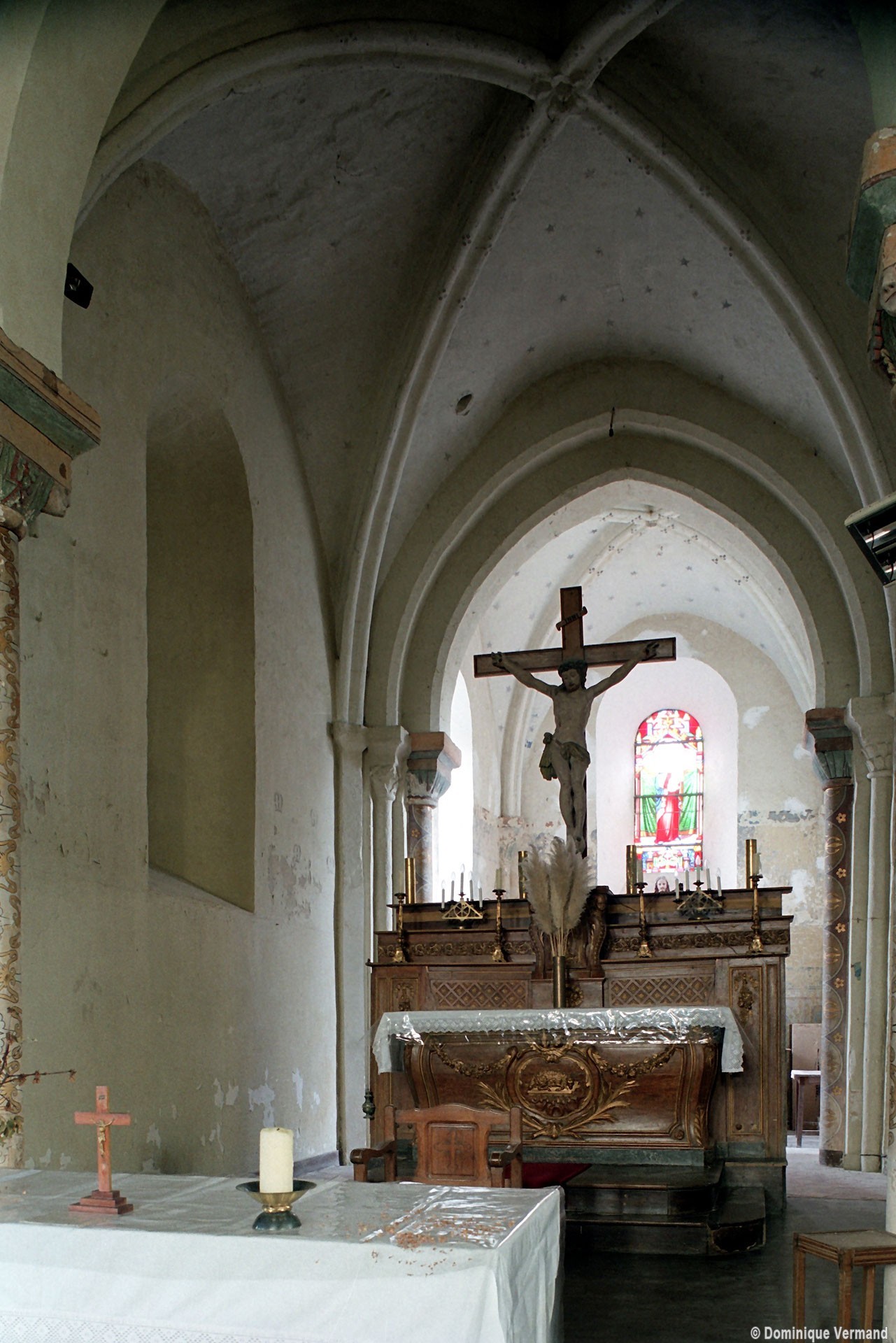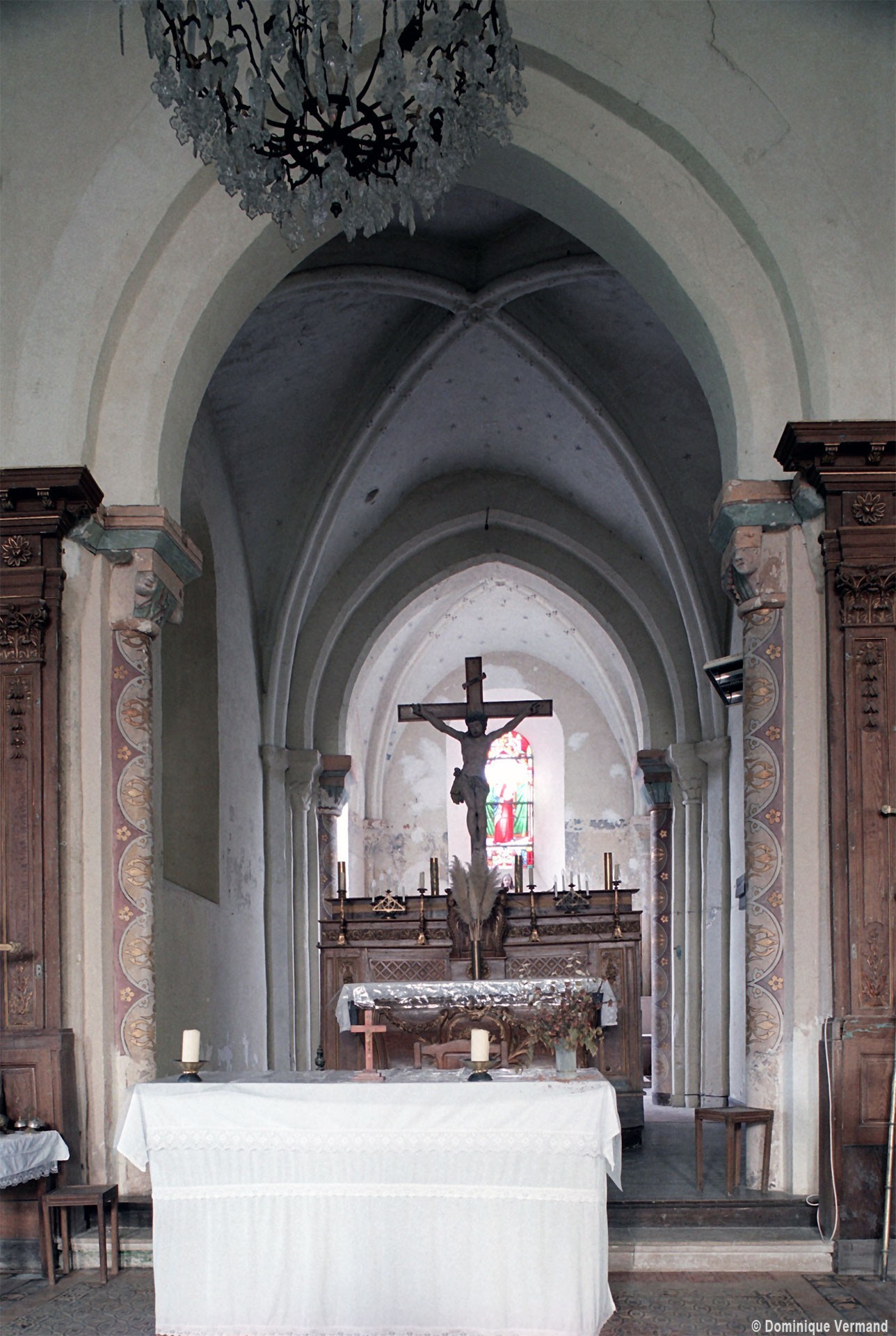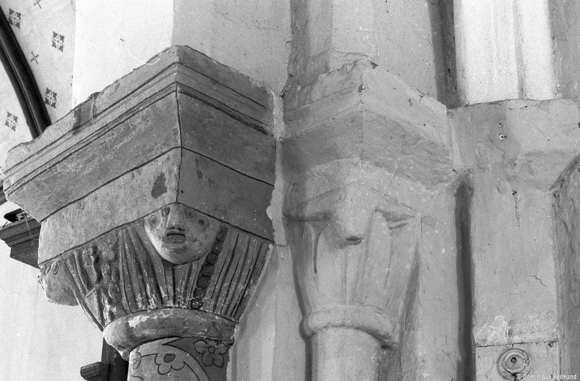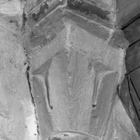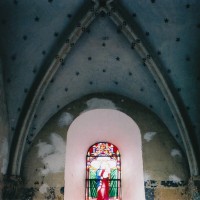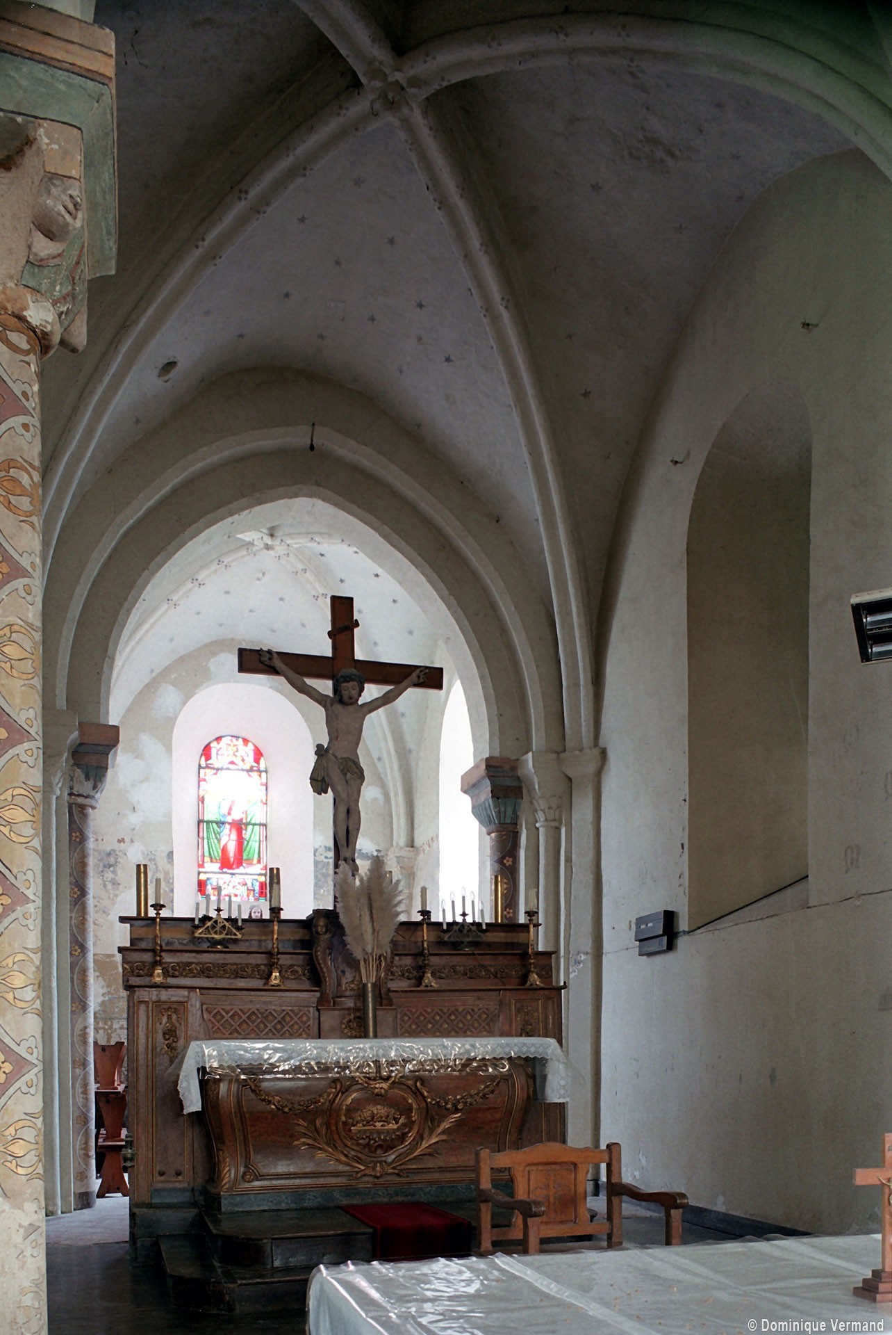 Profilées d’une arête entre deux tores, les ogives retombent, comme les deux arcs doubleaux, sur des chapiteaux au décor assez fruste. L’un représente trois petits personnages sous une gueule monstrueuse, deux autres comportent des têtes assez grotesques aux angles, deux autres encore montrent un décor de godrons (cornets), très répandu en Normandie et en Angleterre à cette époque. A l’extérieur, les murs – bâtis dans un mélange de moellons et de silex – sont épaulés par des contreforts très plats. Les fenêtres sont en plein cintre et celle du chevet est soulignée par un cordon de billettes. Très bien conservée, la corniche est une bonne illustration de la corniche dite » beauvaisine « , très répandue dans l’Oise au 12ème siècle. Elle est constituée d’une suite d’arcatures en plein cintre recoupées par deux petites arcatures secondaires et reposant sur des petits modillons au décor souvent géométrique.