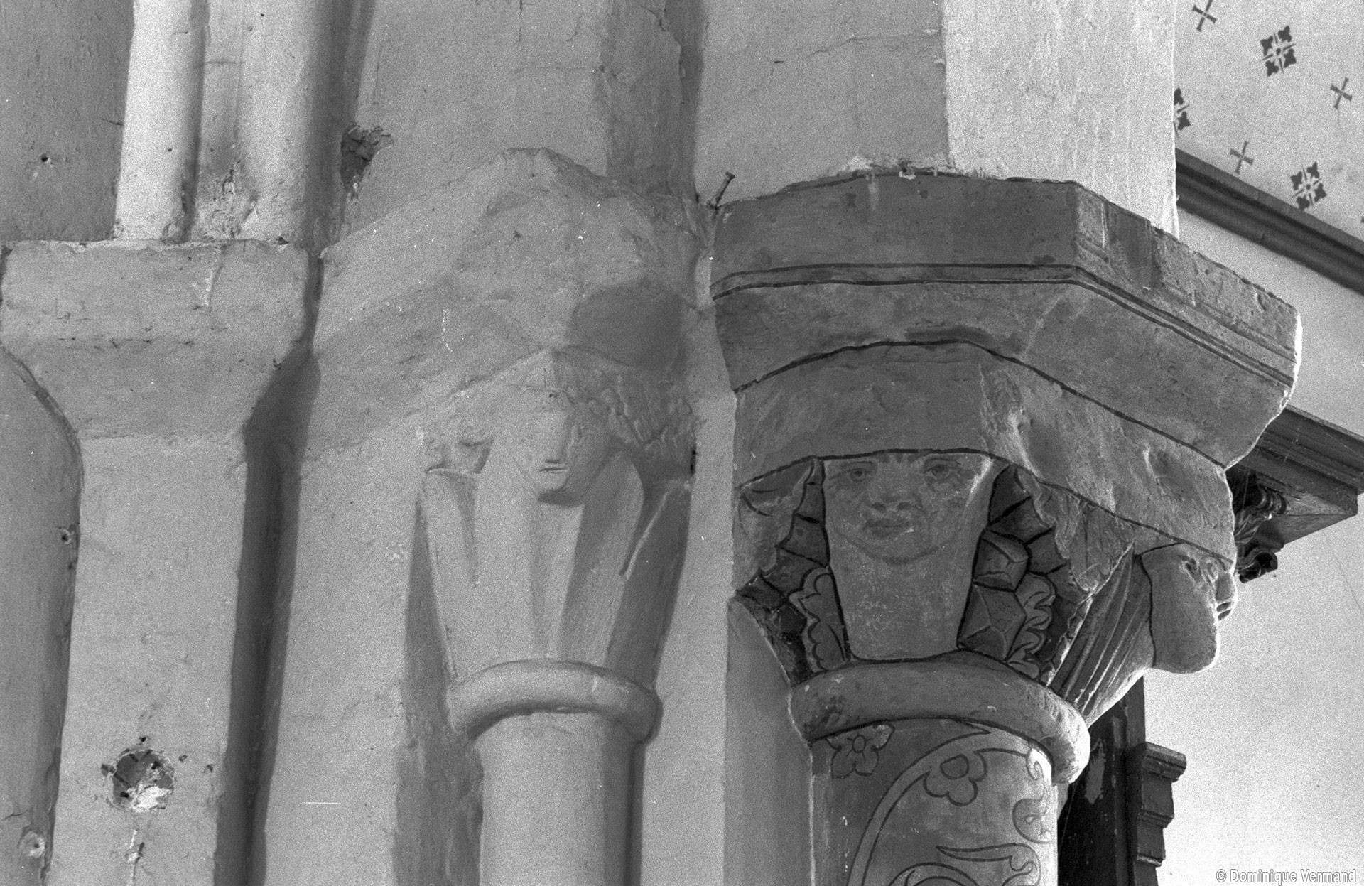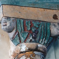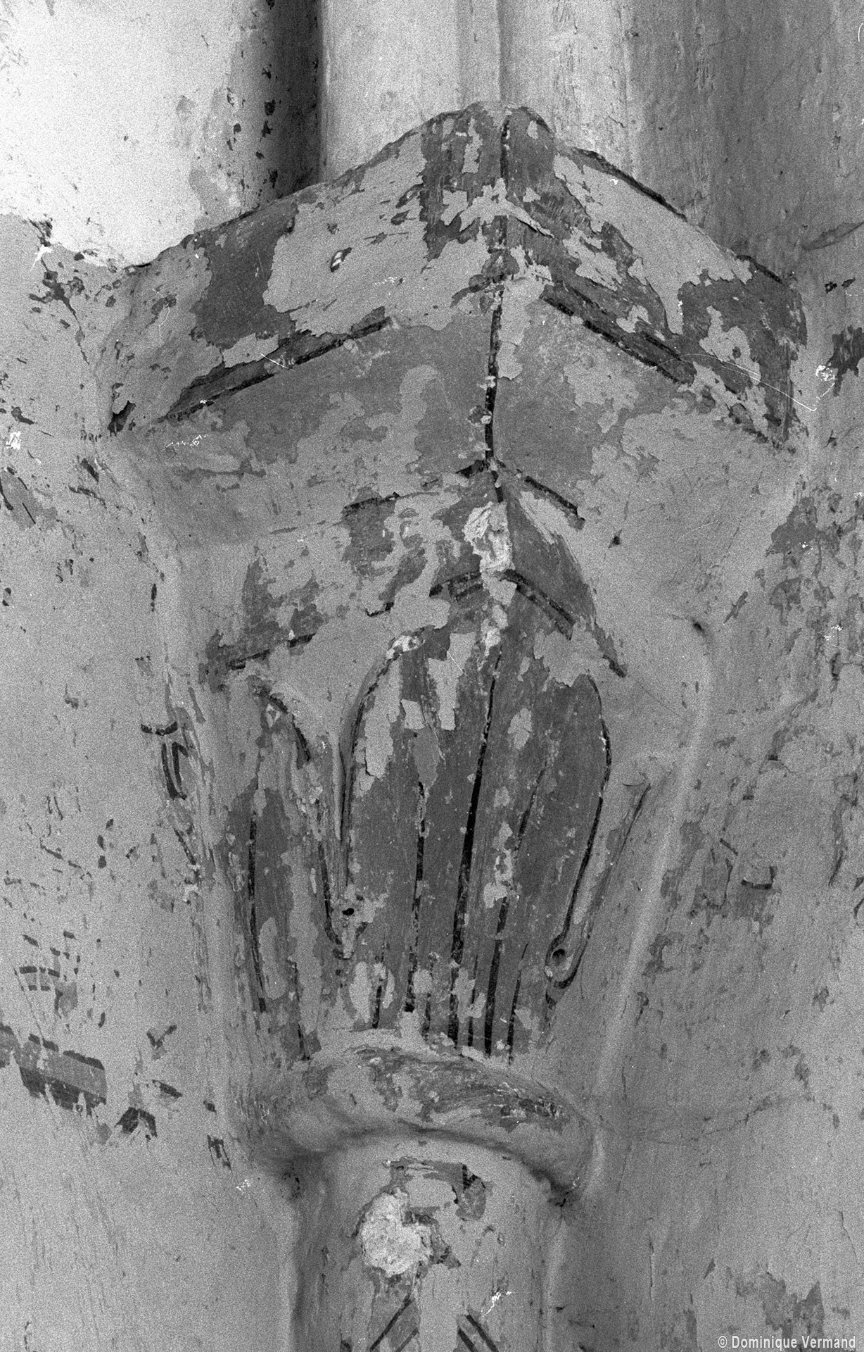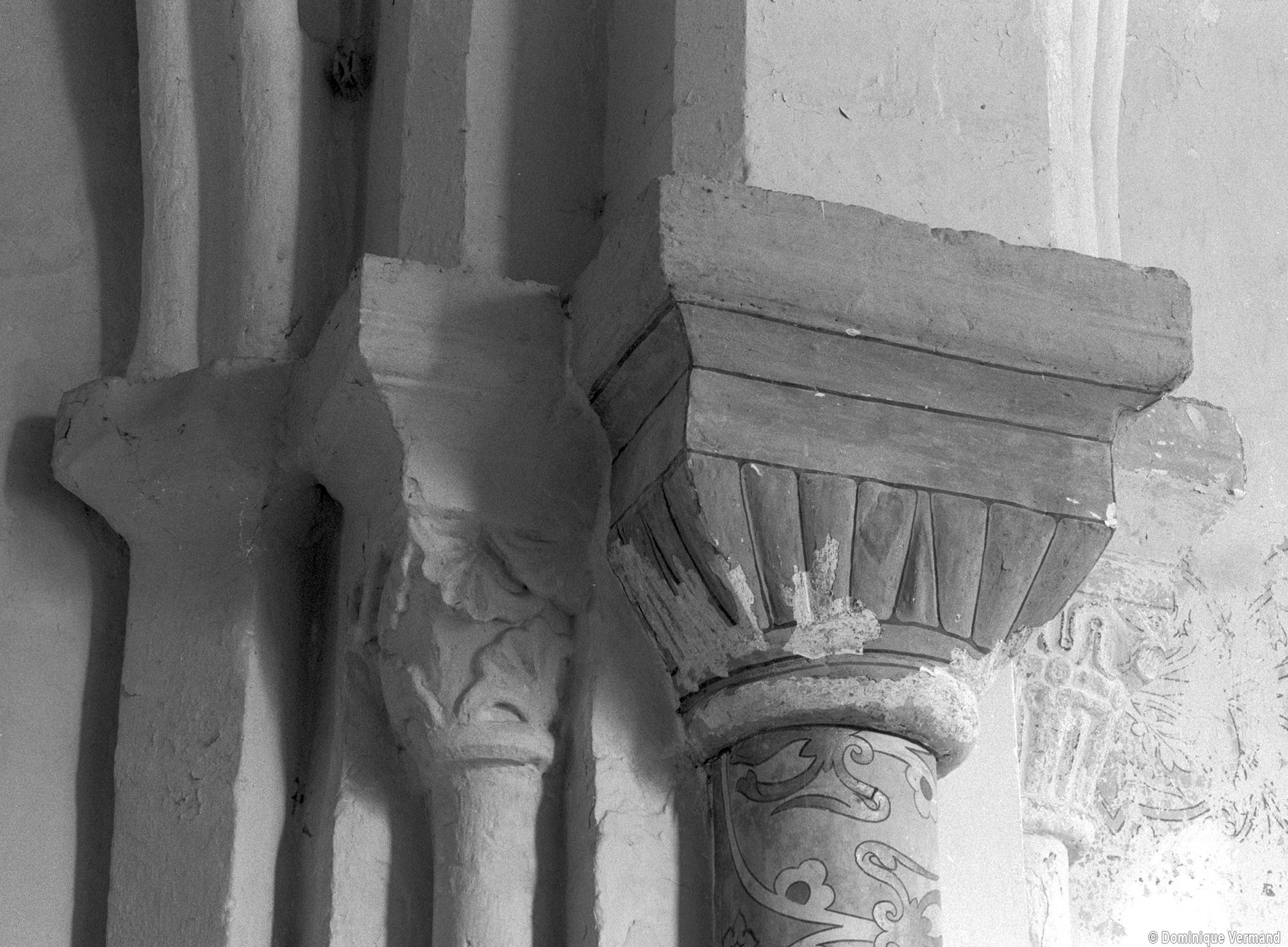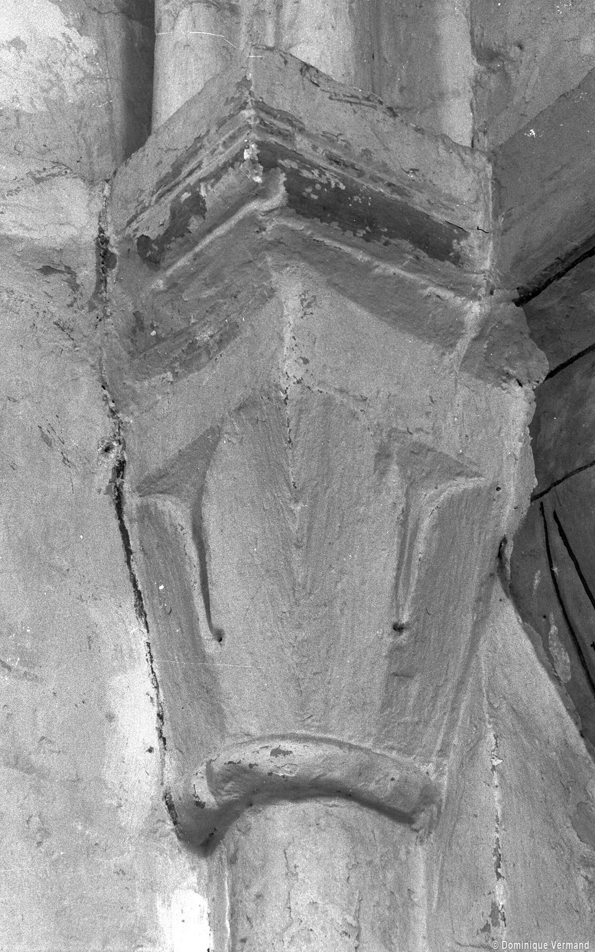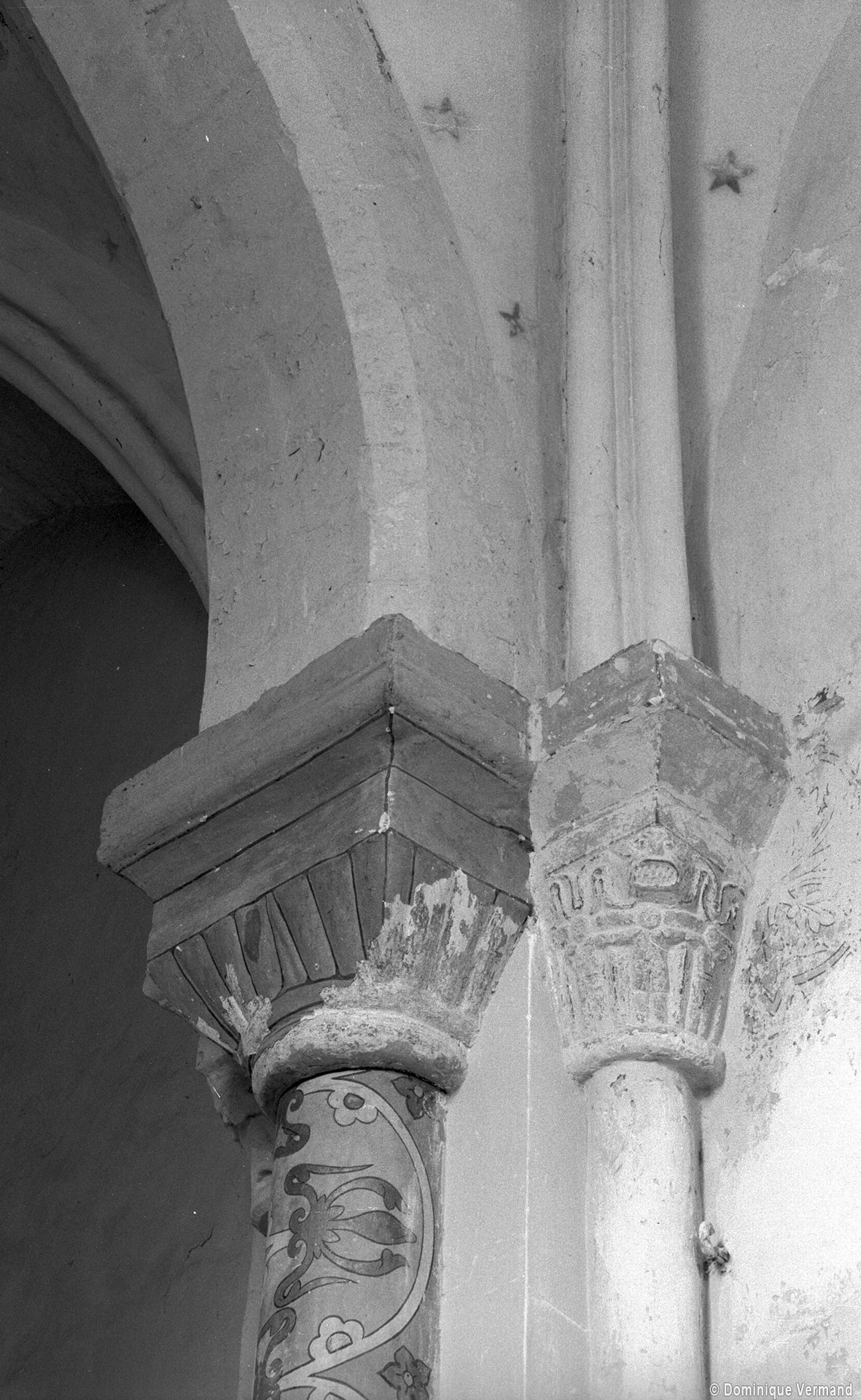 Profilées d’une arête entre deux tores, les ogives retombent, comme les deux arcs doubleaux, sur des chapiteaux au décor assez fruste. L’un représente trois petits personnages sous une gueule monstrueuse, deux autres comportent des têtes assez grotesques aux angles, deux autres encore montrent un décor de godrons (cornets), très répandu en Normandie et en Angleterre à cette époque. A l’extérieur, les murs – bâtis dans un mélange de moellons et de silex – sont épaulés par des contreforts très plats. Les fenêtres sont en plein cintre et celle du chevet est soulignée par un cordon de billettes. Très bien conservée, la corniche est une bonne illustration de la corniche dite » beauvaisine « , très répandue dans l’Oise au 12ème siècle. Elle est constituée d’une suite d’arcatures en plein cintre recoupées par deux petites arcatures secondaires et reposant sur des petits modillons au décor souvent géométrique.