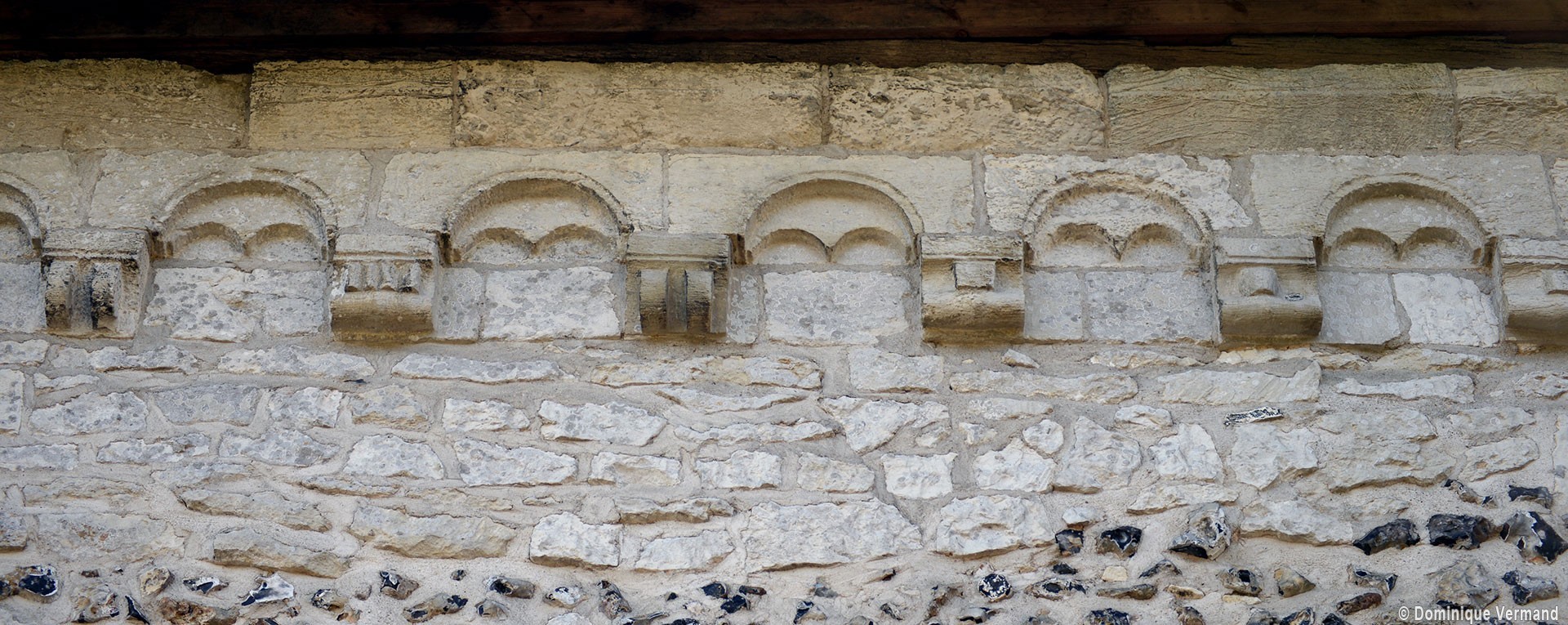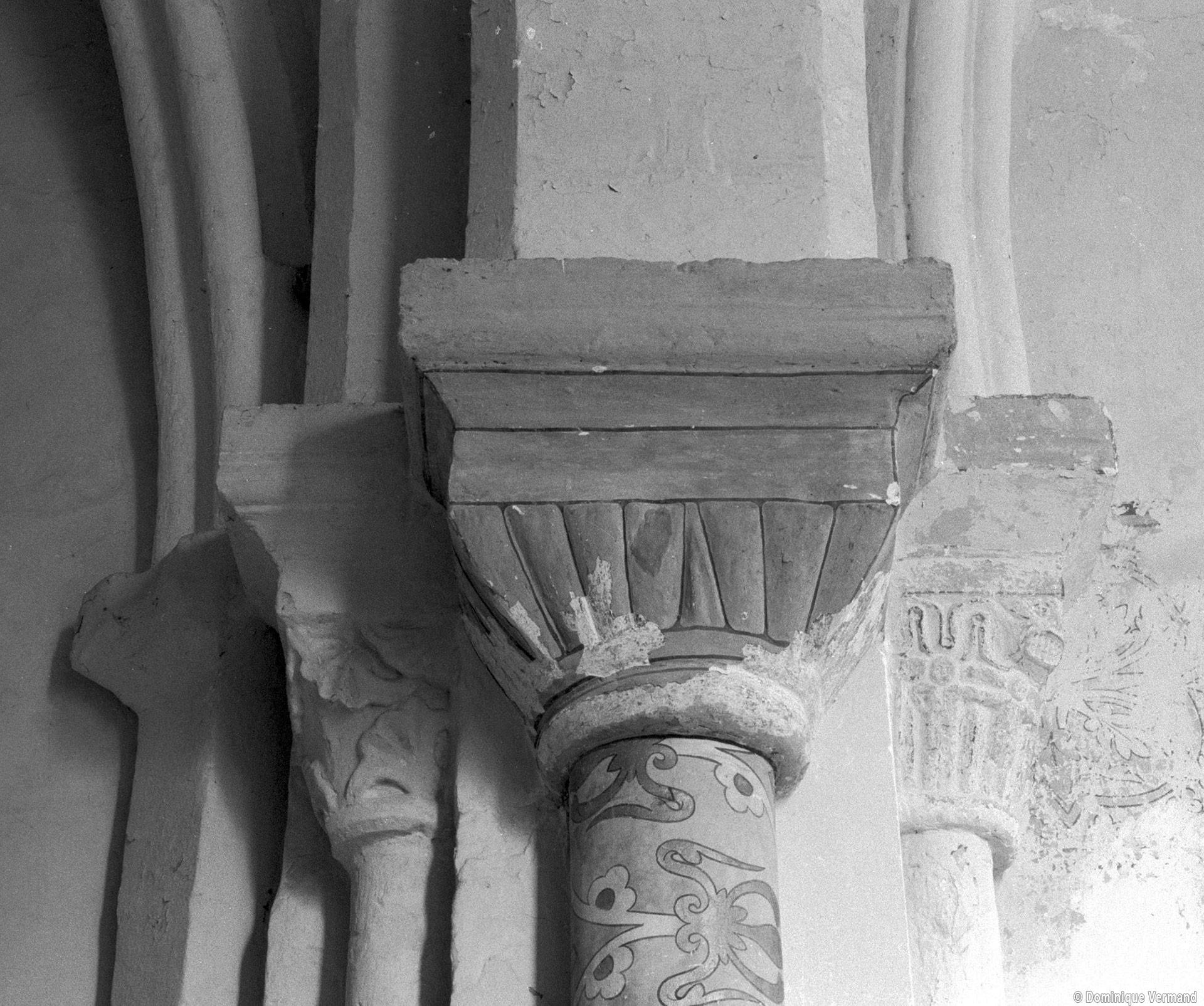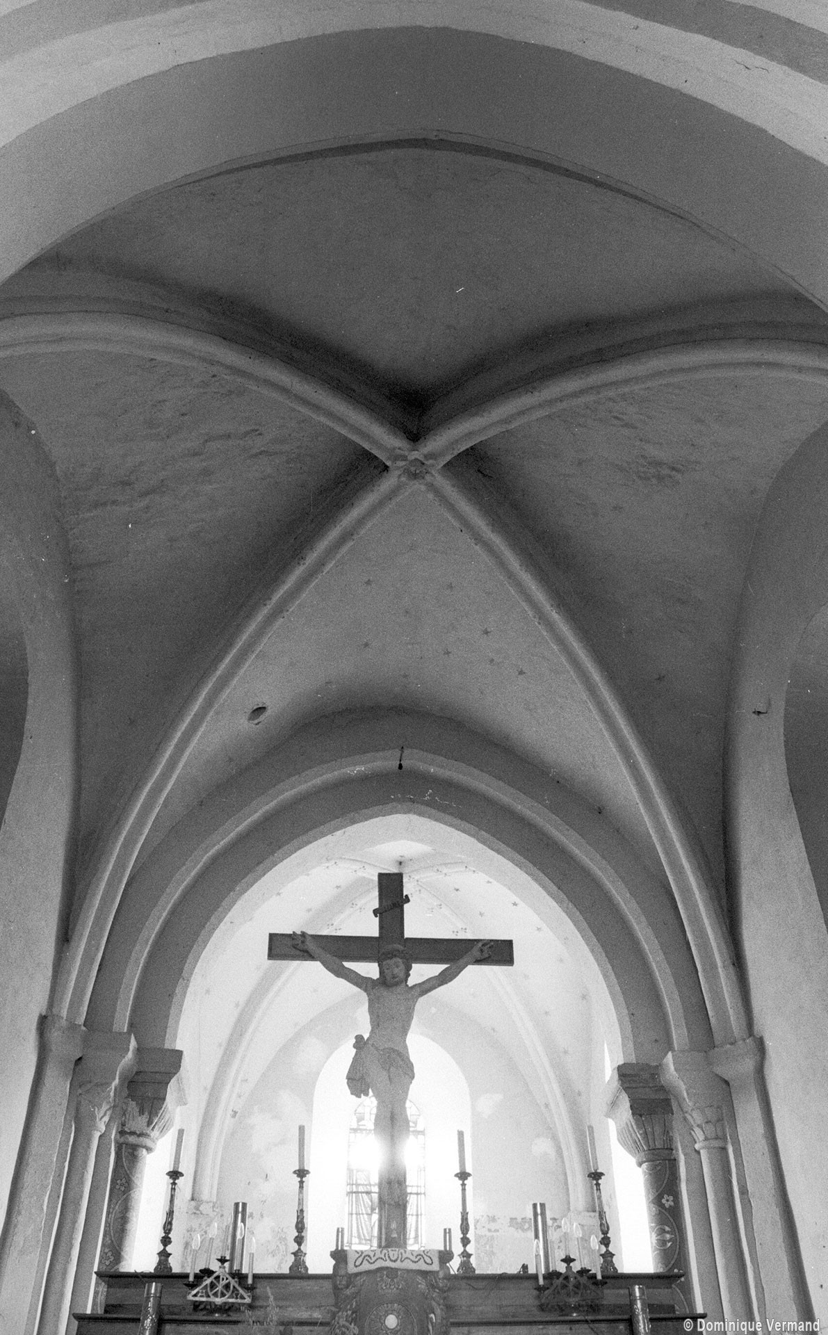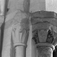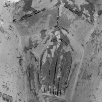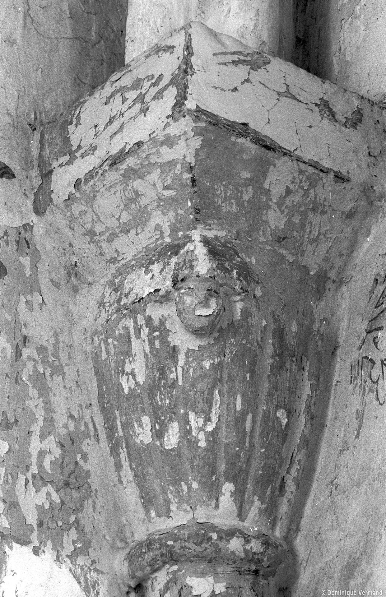 Profilées d’une arête entre deux tores, les ogives retombent, comme les deux arcs doubleaux, sur des chapiteaux au décor assez fruste. L’un représente trois petits personnages sous une gueule monstrueuse, deux autres comportent des têtes assez grotesques aux angles, deux autres encore montrent un décor de godrons (cornets), très répandu en Normandie et en Angleterre à cette époque. A l’extérieur, les murs – bâtis dans un mélange de moellons et de silex – sont épaulés par des contreforts très plats. Les fenêtres sont en plein cintre et celle du chevet est soulignée par un cordon de billettes. Très bien conservée, la corniche est une bonne illustration de la corniche dite » beauvaisine « , très répandue dans l’Oise au 12ème siècle. Elle est constituée d’une suite d’arcatures en plein cintre recoupées par deux petites arcatures secondaires et reposant sur des petits modillons au décor souvent géométrique.