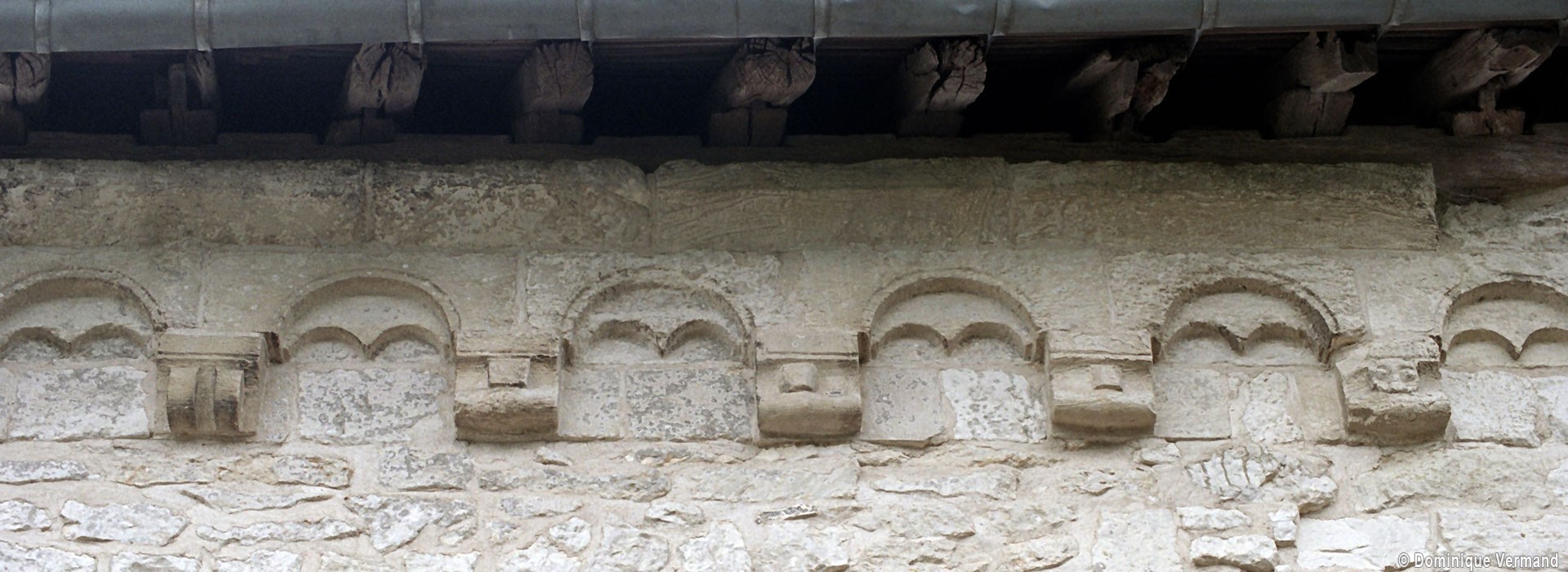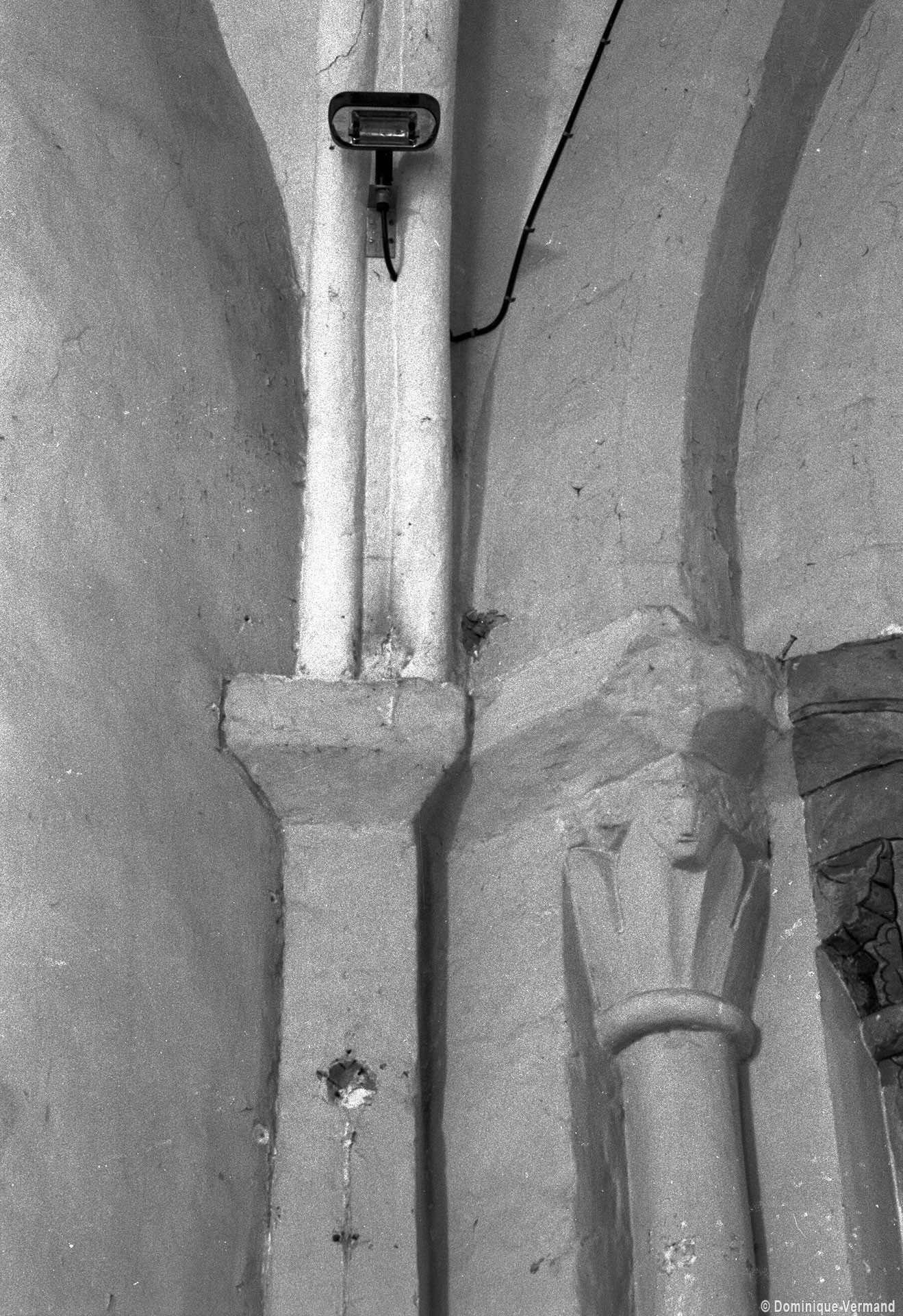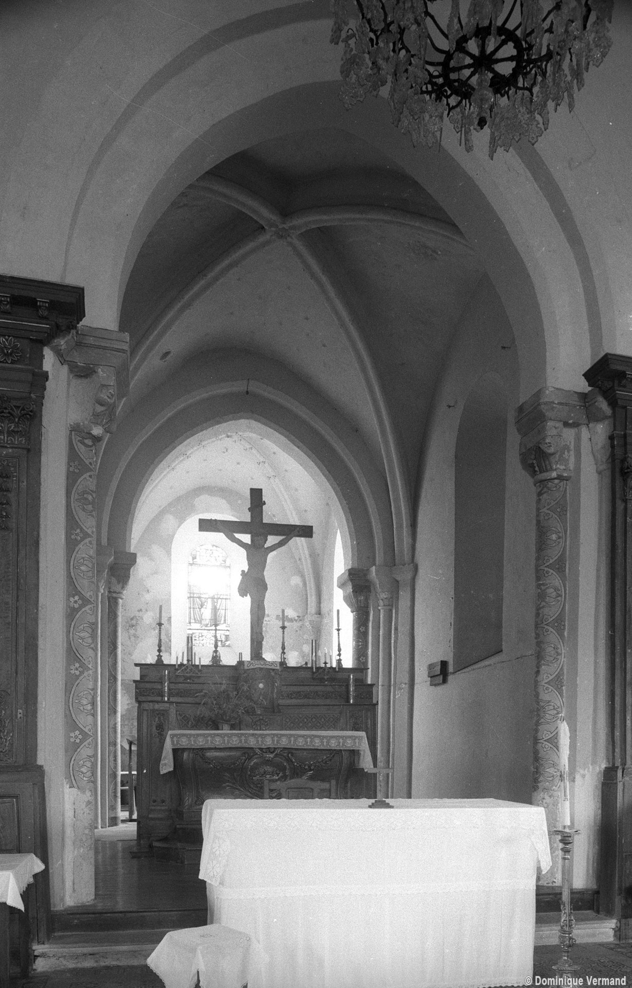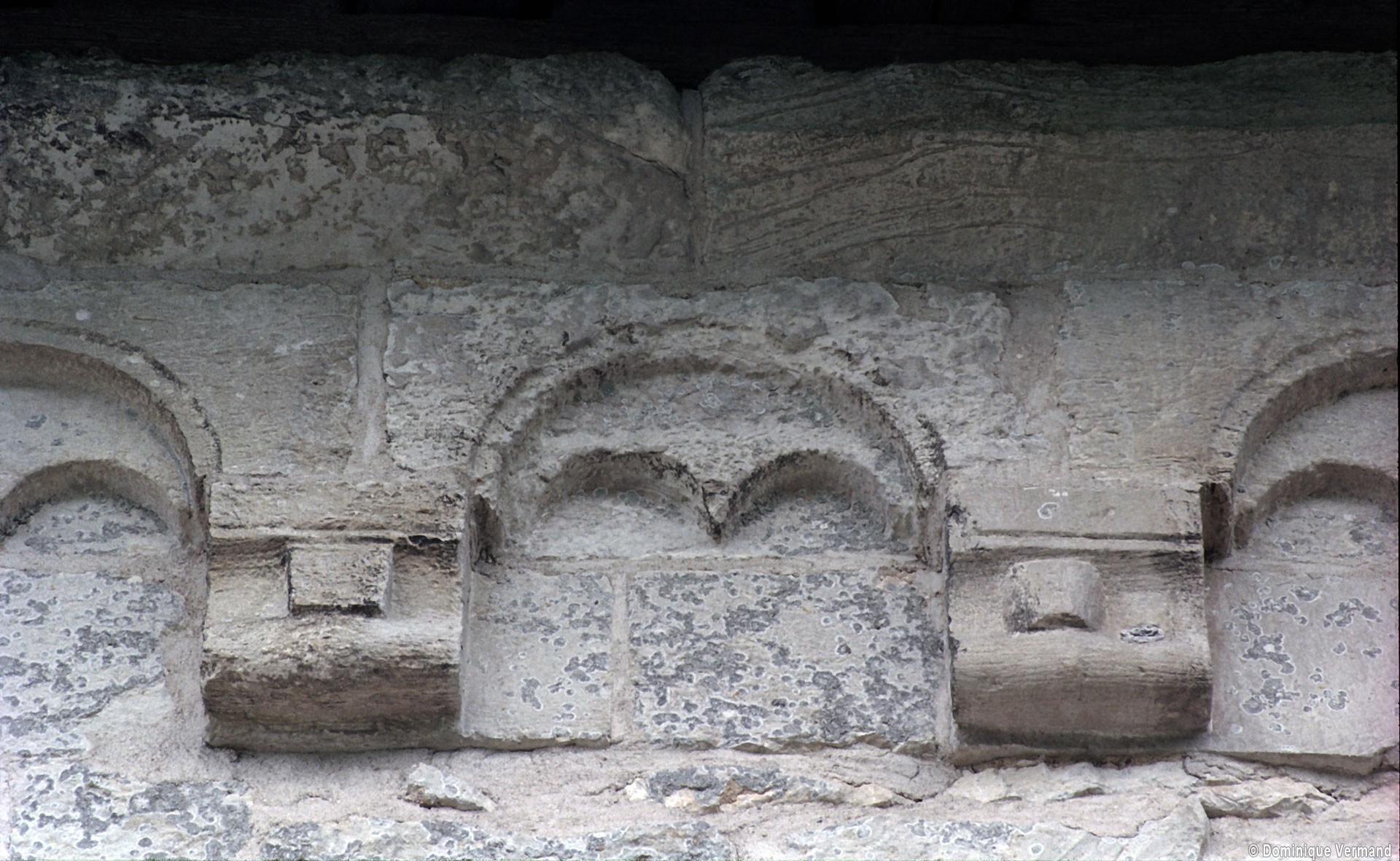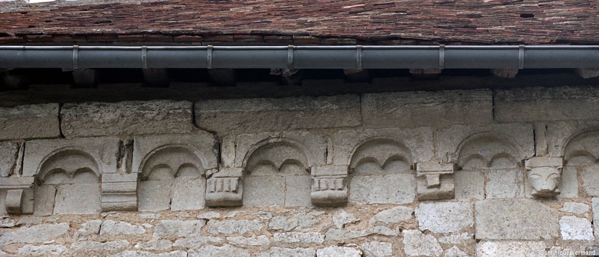 Profilées d’une arête entre deux tores, les ogives retombent, comme les deux arcs doubleaux, sur des chapiteaux au décor assez fruste. L’un représente trois petits personnages sous une gueule monstrueuse, deux autres comportent des têtes assez grotesques aux angles, deux autres encore montrent un décor de godrons (cornets), très répandu en Normandie et en Angleterre à cette époque. A l’extérieur, les murs – bâtis dans un mélange de moellons et de silex – sont épaulés par des contreforts très plats. Les fenêtres sont en plein cintre et celle du chevet est soulignée par un cordon de billettes. Très bien conservée, la corniche est une bonne illustration de la corniche dite » beauvaisine « , très répandue dans l’Oise au 12ème siècle. Elle est constituée d’une suite d’arcatures en plein cintre recoupées par deux petites arcatures secondaires et reposant sur des petits modillons au décor souvent géométrique.