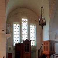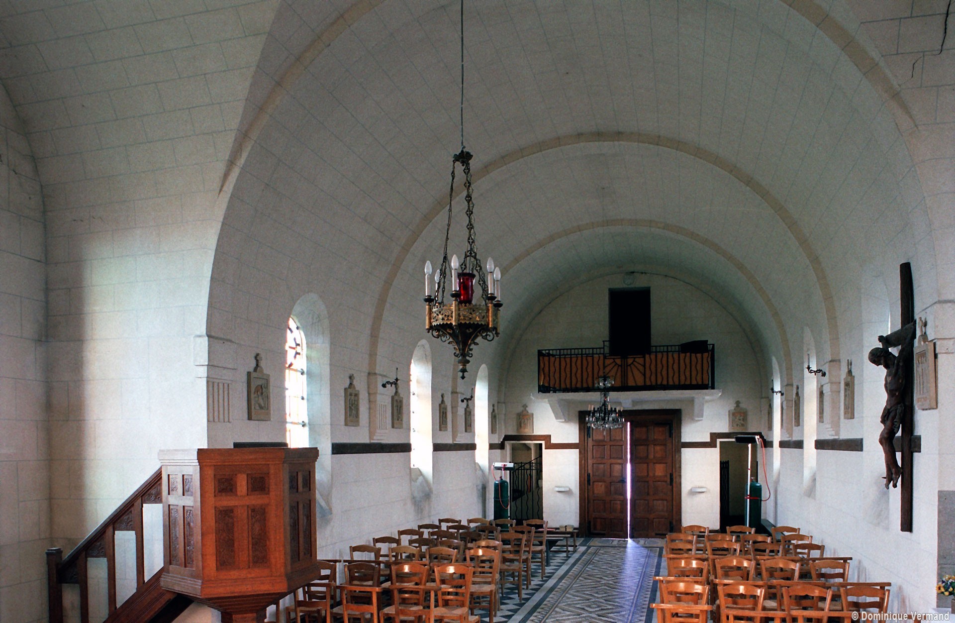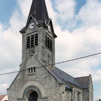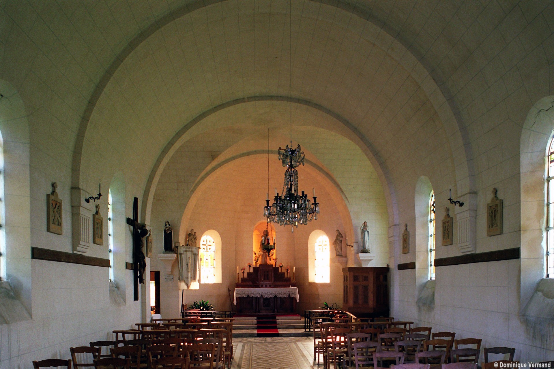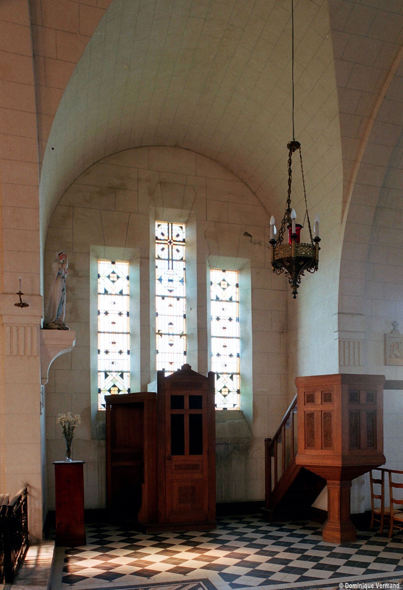 L’édifice est un mélange des styles néo-roman et art déco. Le premier se reconnaît dans les fenêtres en plein cintre avec moulure de la nef et du choeur. Le pan central de celui-ci comporte, à la place de la fenêtre, une petite niche abritant une Vierge et éclairée latéralement par deux ouvertures étroites. L’art déco est illustré par le portail à incrustation de mosaïques et par les baies rectangulaires du clocher et des triplets qui éclairent les croisillons. C’est aussi de ce style que se réclame le mobilier (2008).