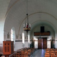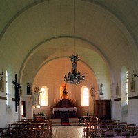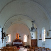 Bâti en pierres taillées avec bossage, son plan comprend le traditionnel massif de façade avec porche encadré par un baptistère et l’accès au clocher, une nef unique de trois travées, un transept débordant et une abside à cinq pans. La nef est voûtée en berceau tandis que le transept et le choeur reçoivent des voûtes d’arêtes.