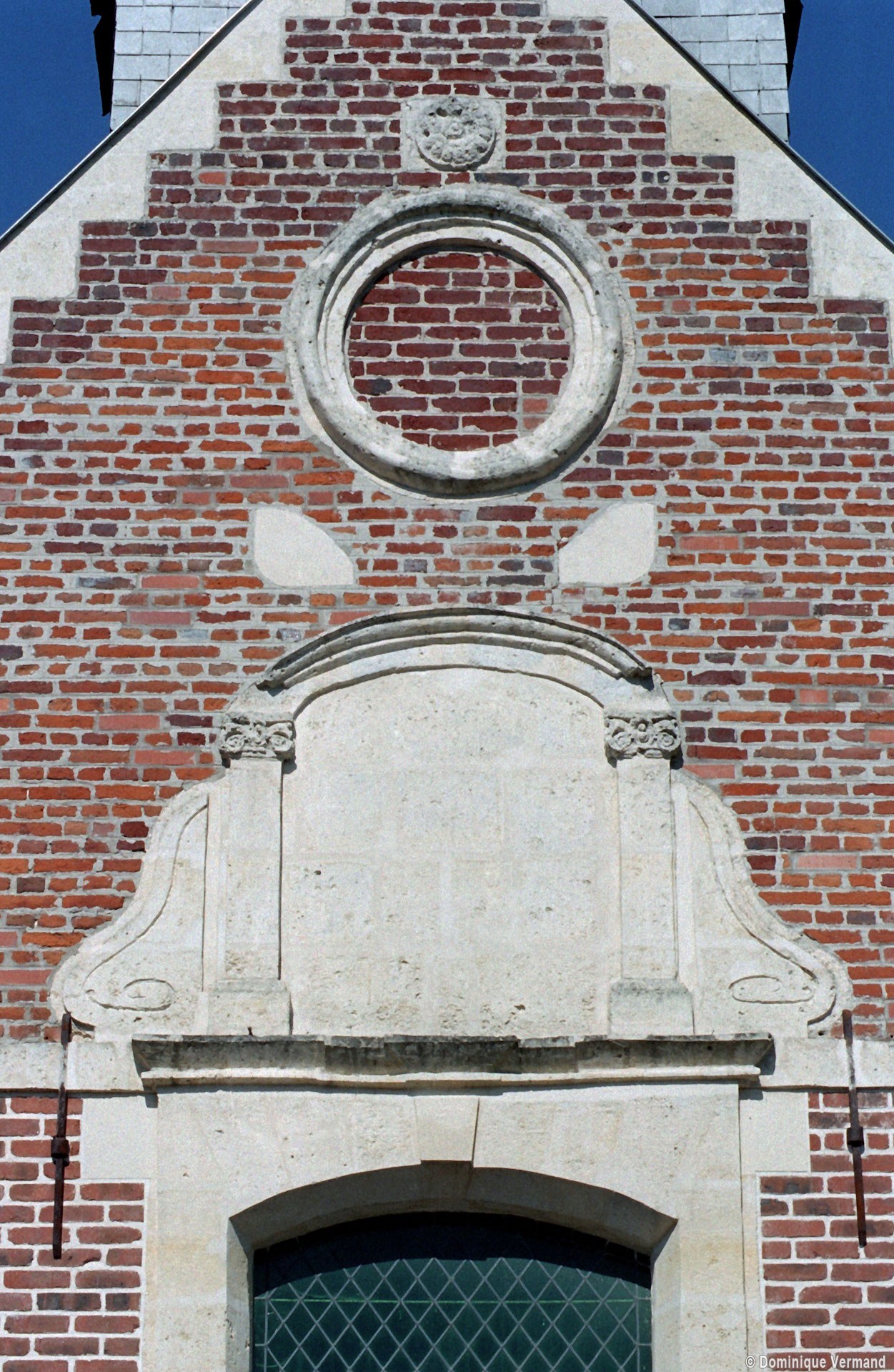 La façade est bien mieux caractérisée et montre une composition équilibrée associant la brique, pour les murs, et la pierre, pour les éléments de structure, les ouvertures et le décor. L’accent a été mis sur la partie centrale, qui superpose portail, fenêtre, fronton et oculus. Avec son arc surbaissé reçu sur deux petits pilastres surmontés chacun d’un chapiteau composite et encadrés de deux volutes renversées, le fronton est l’élément le plus riche d’un ensemble qui a pour principal mérite d’atteindre à un réel effet décoratif avec des moyens limités.
