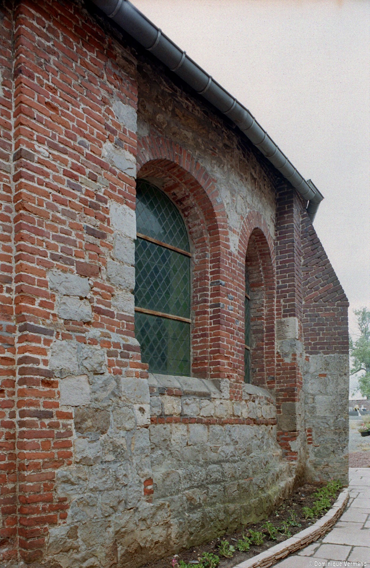 Le choeur, en grès et pierre, peut remonter à la fin du 16ème siècle, mais ses contreforts ainsi que toute la partie supérieure ont été refaits en briques. Mélangeant également le grès et la brique, le mur méridional est, lui aussi, très réparé. Ses larges fenêtres en plein cintre en briques ne sont pas antérieures au 17ème siècle.