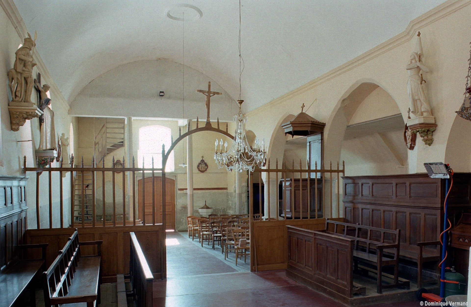 Complètement badigeonné, l’intérieur n’offre rien de particulier si ce n’est les trois arcades brisées mettant en communication la nef avec l’unique bas-côté, du 16ème siècle sans doute. Le maître-autel en bois au riche décor sculpté doit remonter au 17ème siècle (2008).