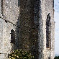 Perchée au sommet de la butte, Saint-Pierre présente des dimensions respectables qu’explique l’important collège de chanoines qui la desservait au Moyen Age. Son plan est composé d’une vaste nef unique couverte d’une charpente du 16ème siècle, d’un transept saillant et d’un choeur à chevet plat flanqué de deux petites chapelles, également à chevet plat. La souche du clocher (l’étage du beffroi a disparu) est intégrée à l’angle sud-est et des annexes sont venues se loger des deux côtés de la nef, au 17ème ou au 18ème siècle, sans doute. Excepté ces annexes, ce plan reste largement celui de l’église du 11ème siècle. Les importantes sections de murs appareillés en arêtes de poisson conservées à la nef (au nord, surtout) et, partiellement, au transept pourraient être regardées comme les vestiges de la collégiale fondée en 1015 par Francon.