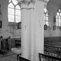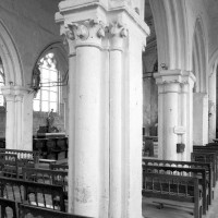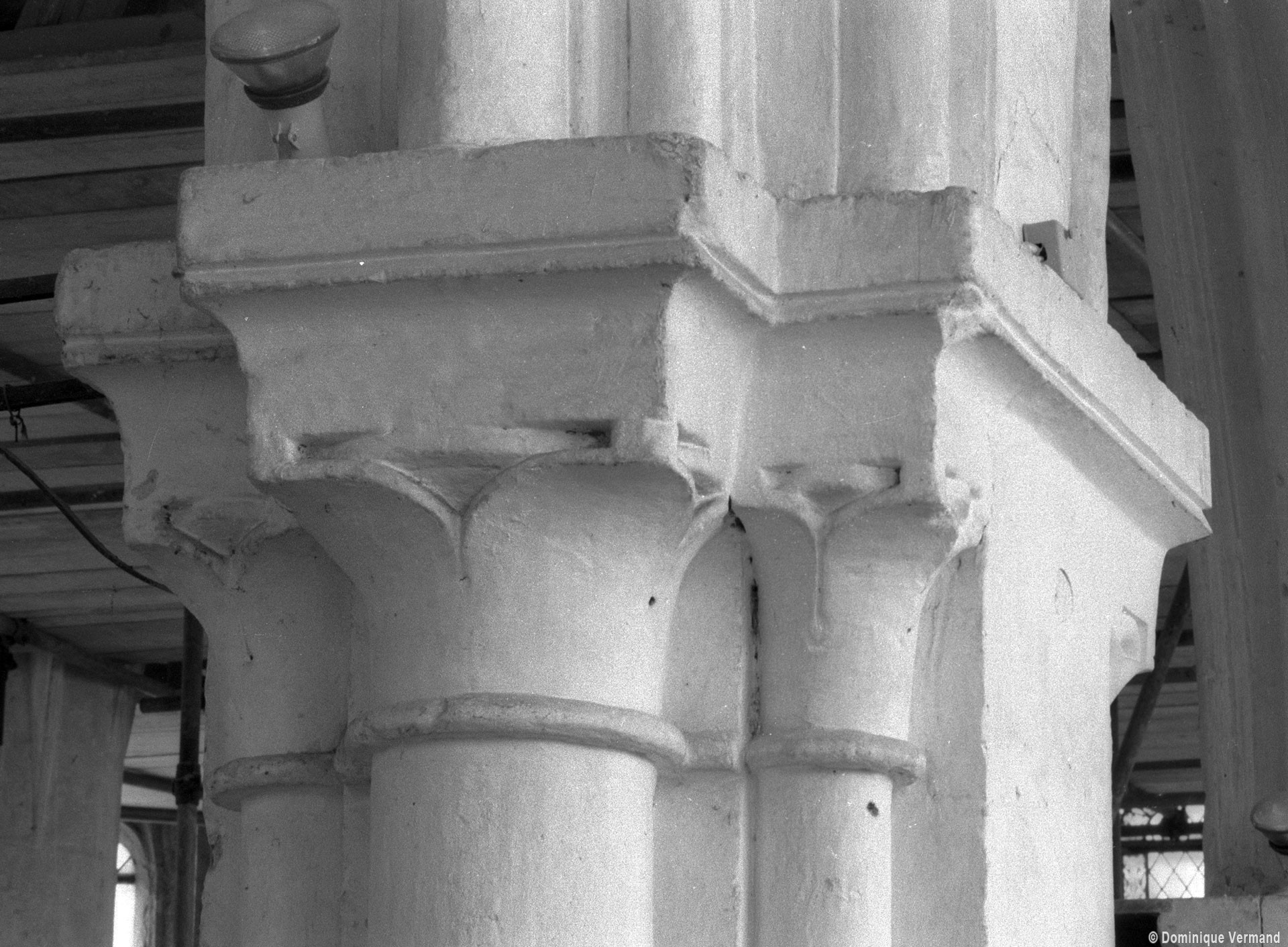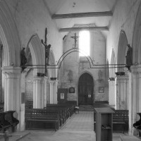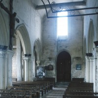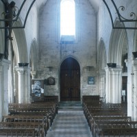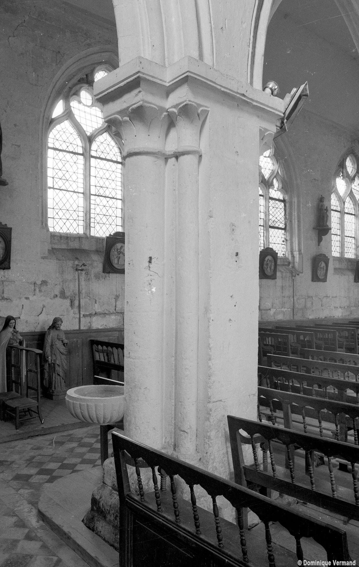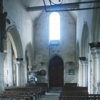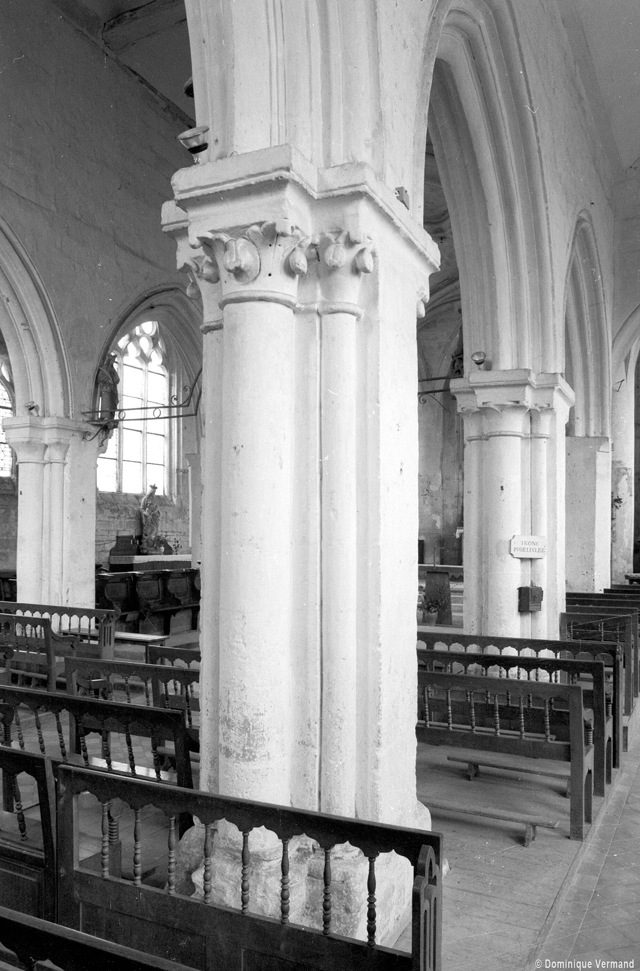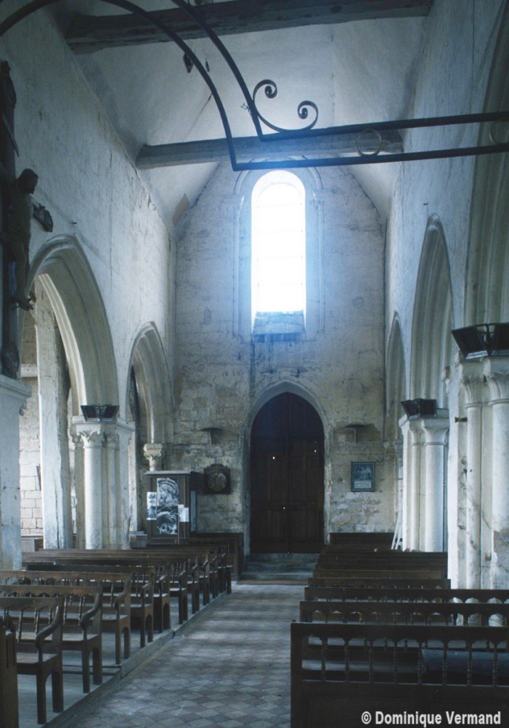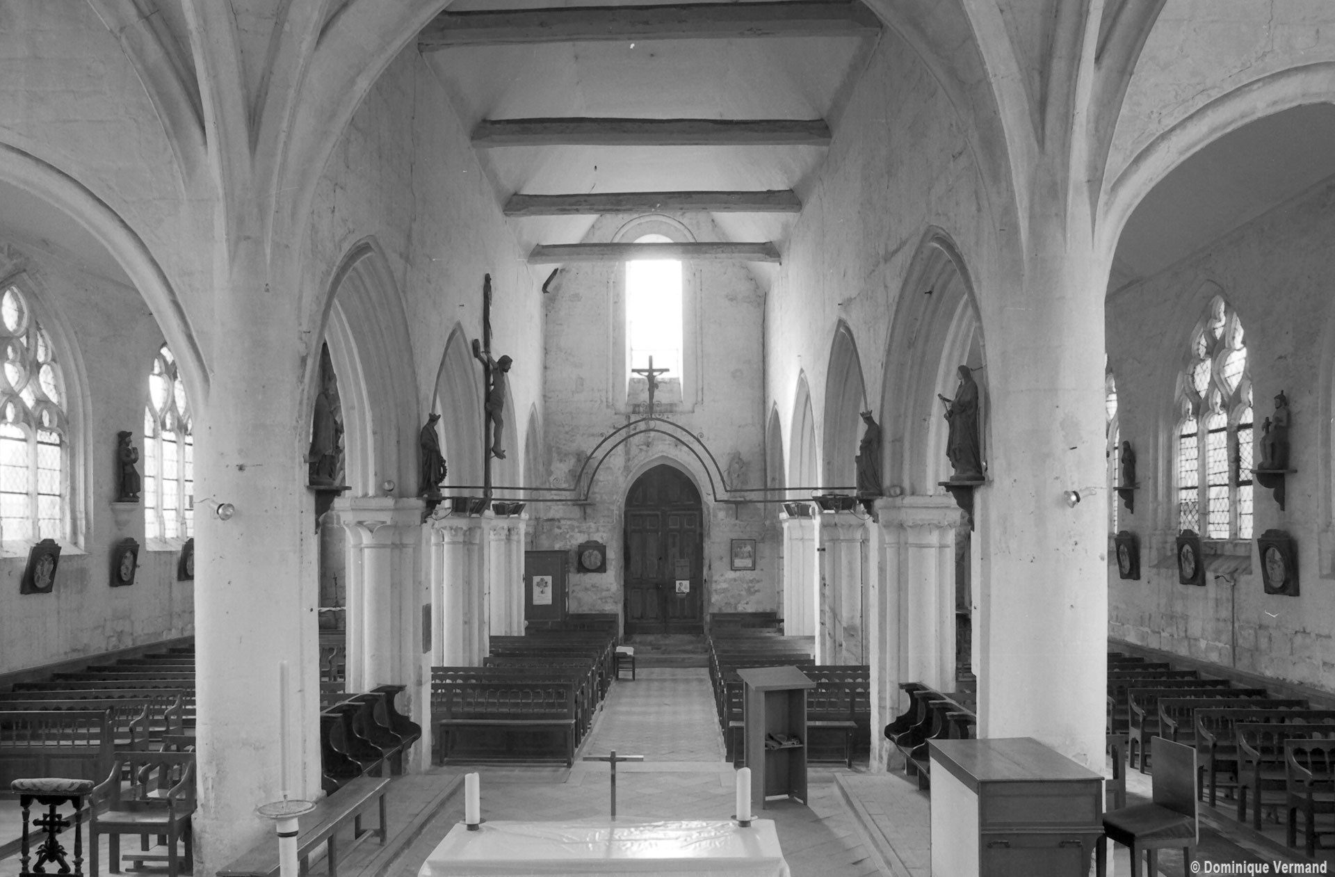 La nef, qui n’a jamais reçu de voûte en pierre, s’est en revanche bien conservée. C’est un élégant vaisseau de quatre travées comprenant des arcades brisées richement moulurées retombant sur des piles à ressauts garnies d’une demi-colonne et de deux colonnettes pour chaque retombée d’arcade. Les chapiteaux sont tous décorés de feuilles plates qui se retournent parfois en petites boules, ancêtres du chapiteau à crochets gothique. Le répertoire décoratif, ainsi que les bases, se retrouvent dans les parties occidentales et les tribunes de la cathédrale de Senlis et permettent une datation vers les années 1160/70. Les murs gouttereaux qui surmontent les arcades ont été raccourcis à la fin du 15ème siècle mais les fenêtres primitives se devinent encore. Comme dans la plupart des églises du 12ème siècle de la vallée de l’Automne, elles s’ouvraient dans l’axe des piles et non des arcades.