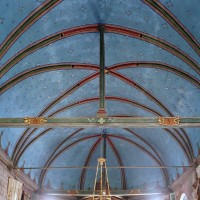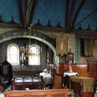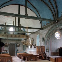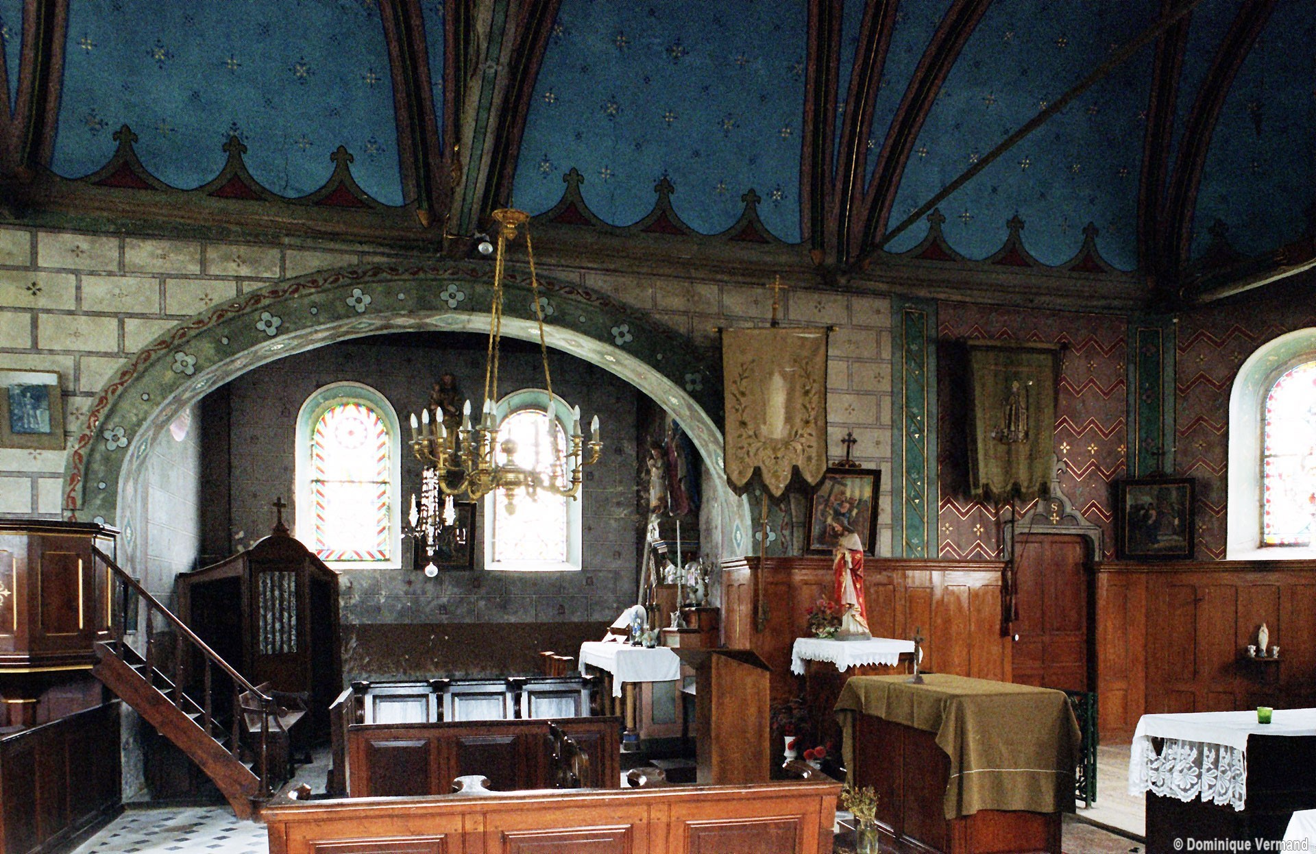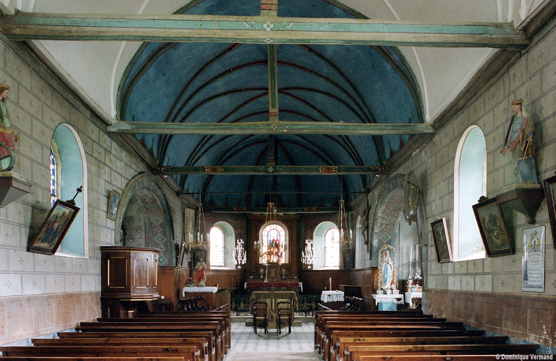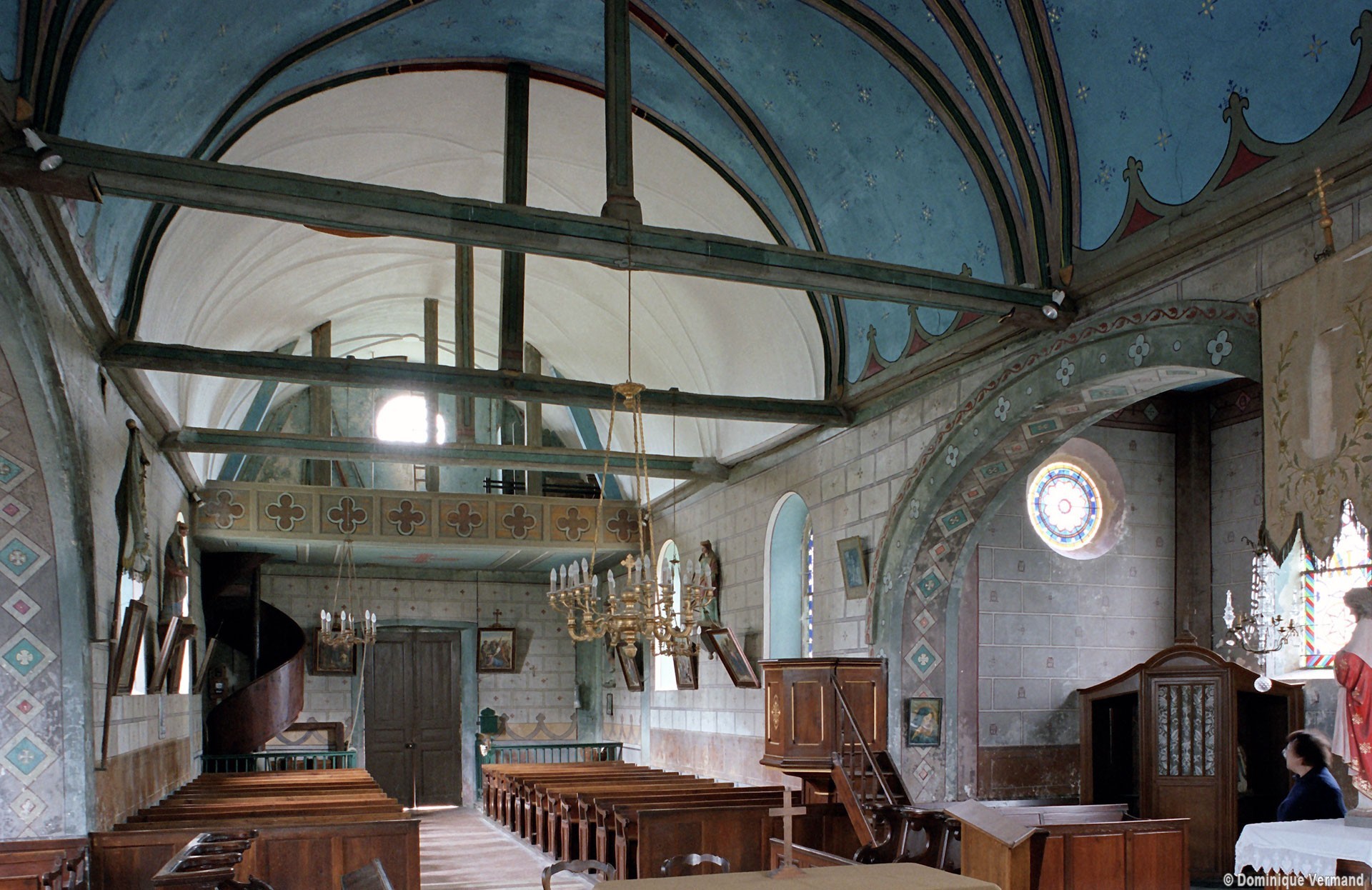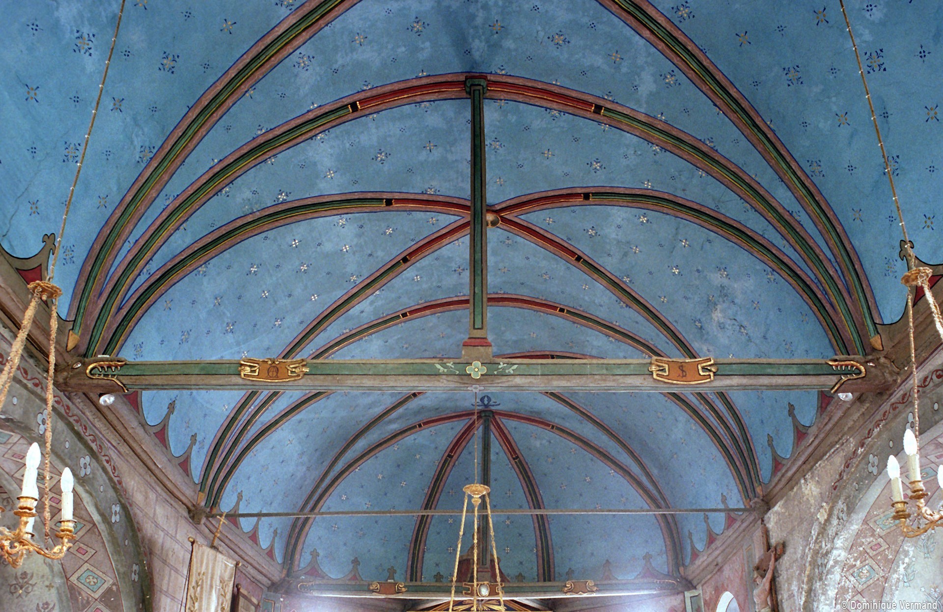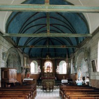 L’intérieur est couvert d’un berceau simulant des voûtes d’arêtes, également du 19ème siècle. En revanche, les entraits (éléments horizontaux) et poinçons (éléments verticaux) de la charpente sont plus anciens, notamment les deux ensembles associés au choeur, plus élaborés et comportant des engoulants (monstres avalant la poutre). Tout l’édifice est revêtu d’un décor peint constituant un intéressant exemple du goût qui prévalait dans ce domaine au 19ème siècle (2007).