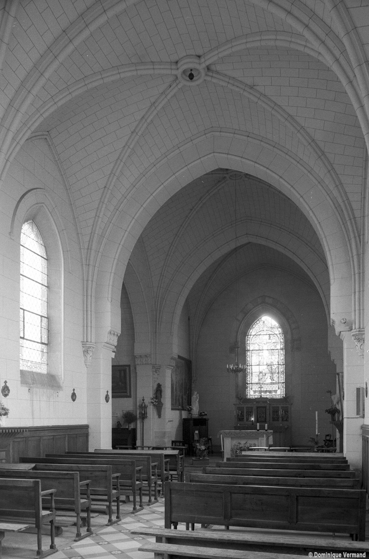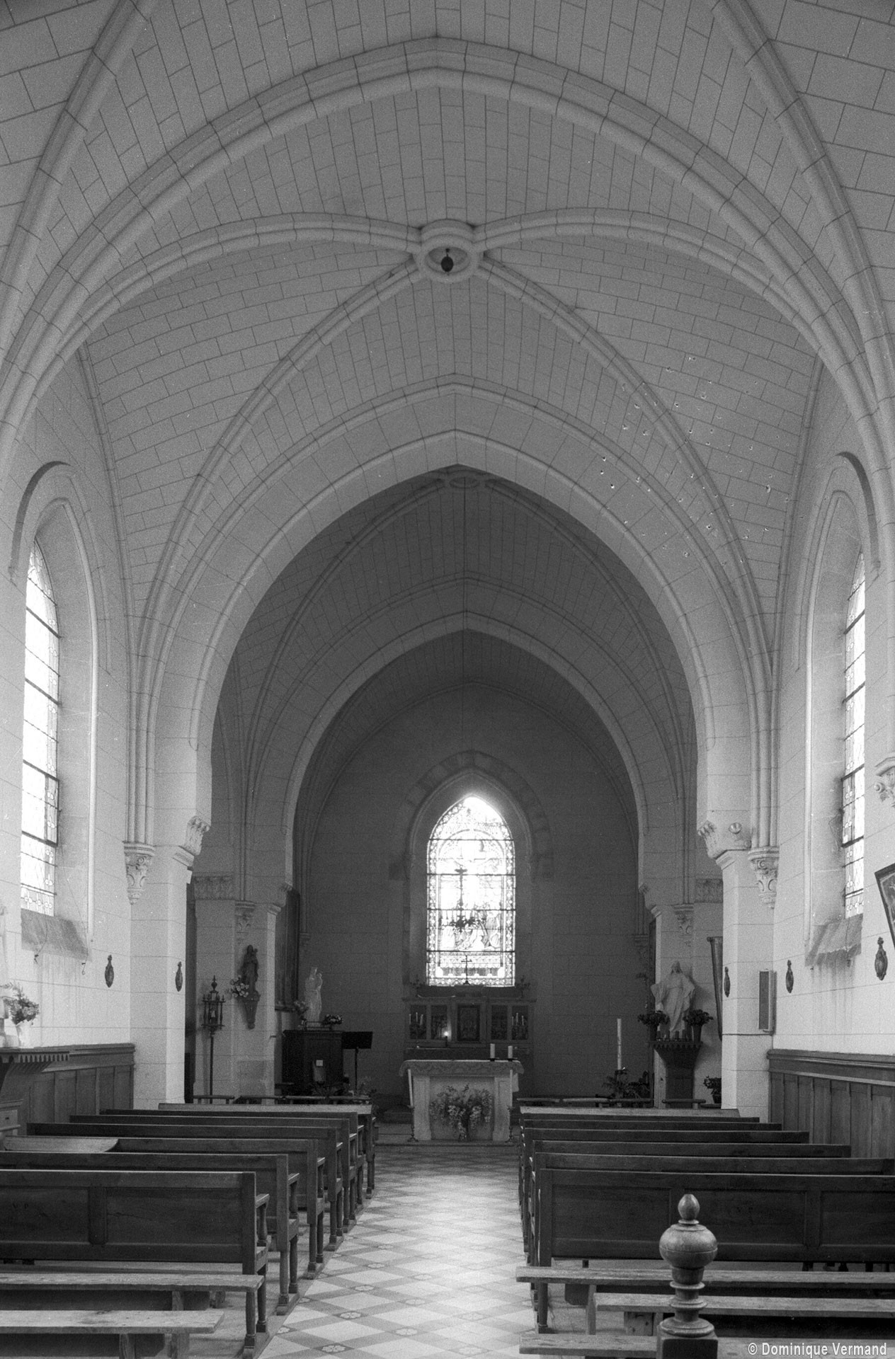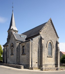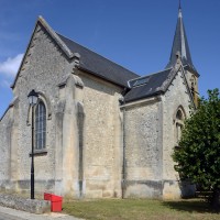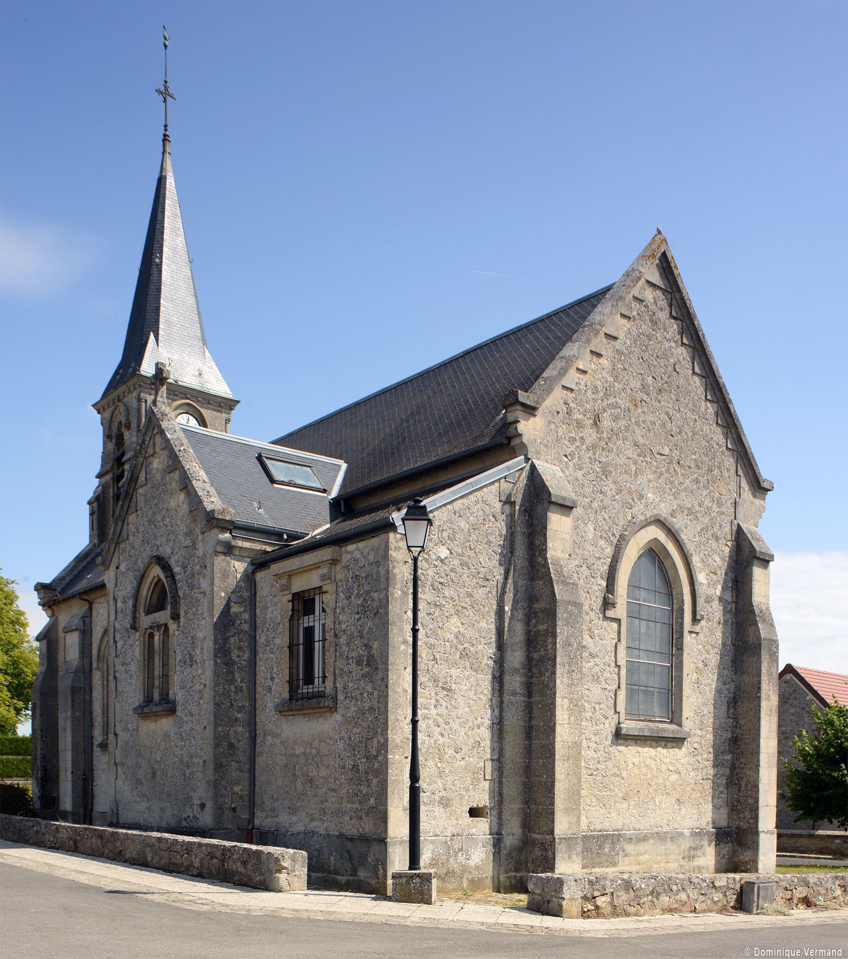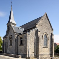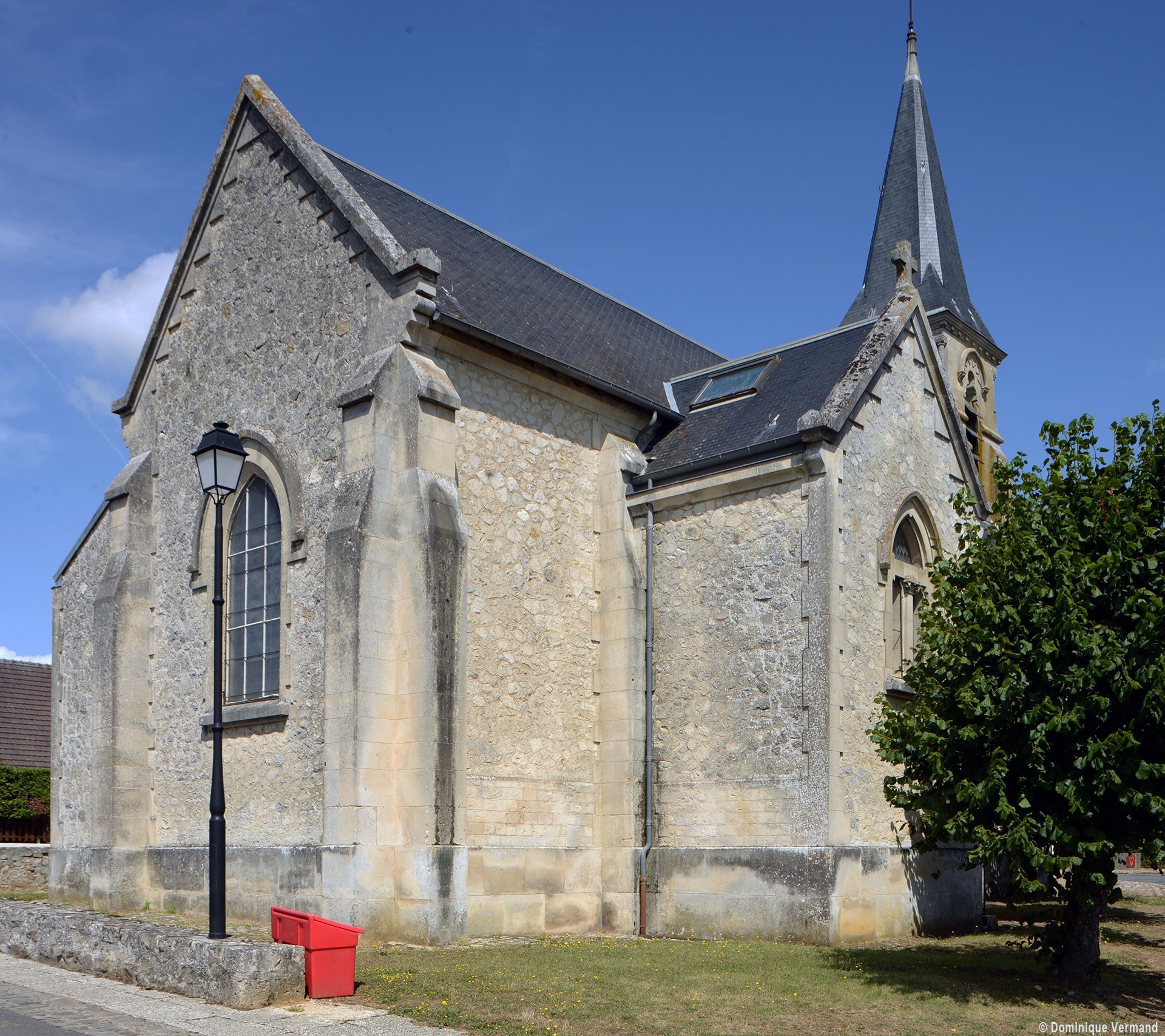 L’église actuelle, orientée nord/sud, doit sa construction, achevée en 1901, à la famille de Richefeux alors propriétaire du château voisin. C’est un petit édifice sans grand génie qui s’inspire librement de l’architecture médiévale. Sa nef unique de trois travées est précédée d’un petit porche avec tribune, que surmonte le clocher.
