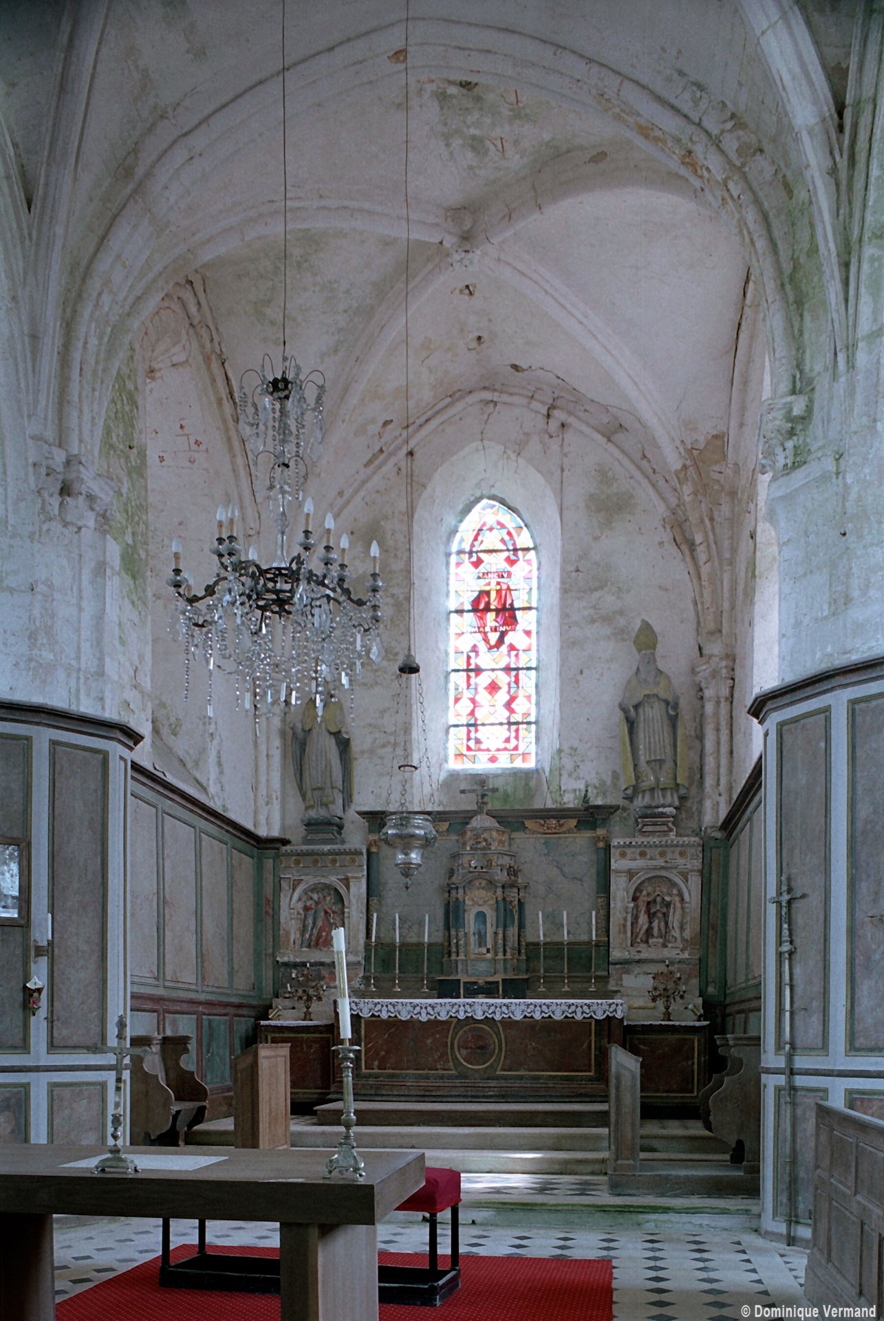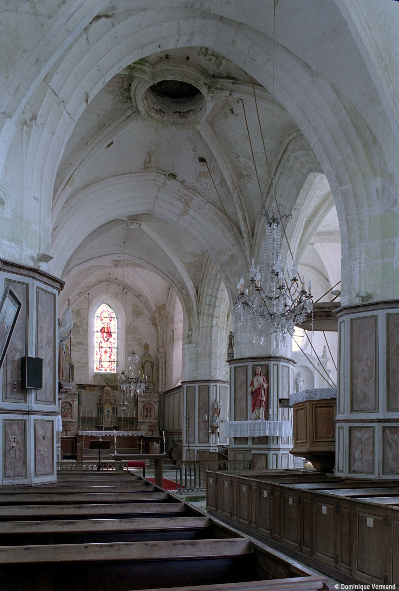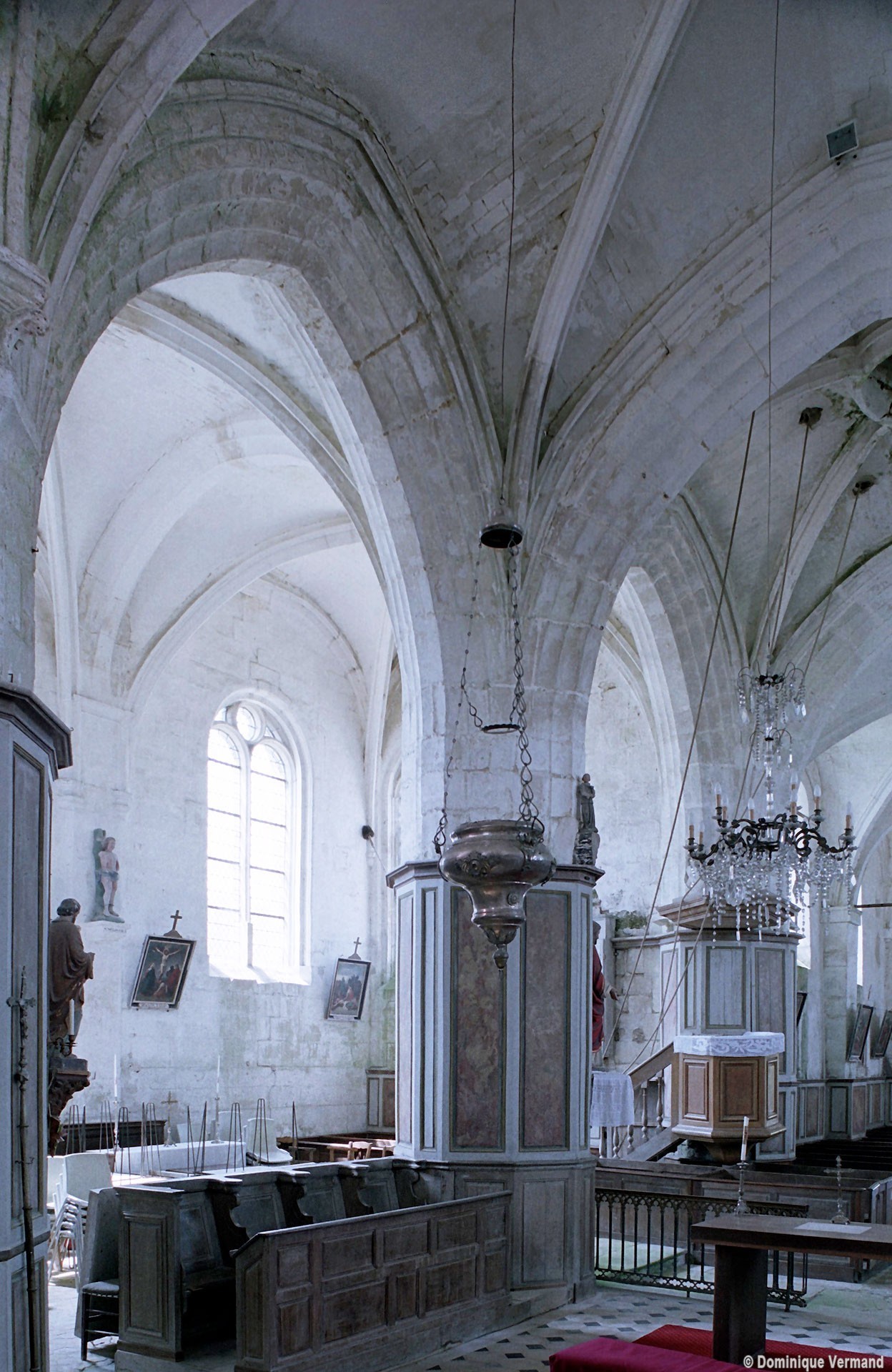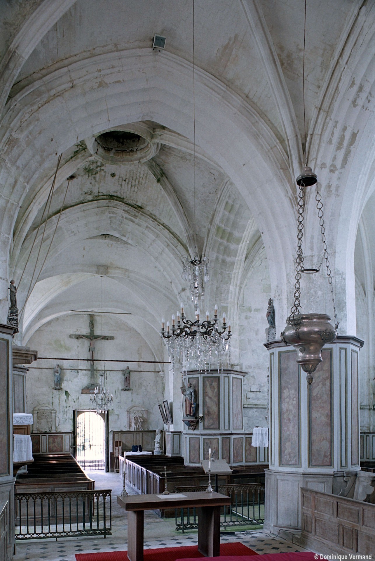 Saint-Martin se signale de loin par la puissante silhouette de son clocher, véritable môle à partir duquel se distribuent les différentes parties de l’église. Jusqu’au 16ème siècle, celle-ci associait une nef unique charpentée à un chœur de deux travées à chevet plat. Réduite aujourd’hui au deux tiers de sa longueur, la nef est d’origine romane. Quand à l’unique travée restante du chœur, c’est une construction très simple de la fin du 12ème siècle, voûtée d’ogives et éclairée par d’étroites lancettes. La disposition des chapiteaux à la retombée nord de l’arc doubleau qui introduit à cette travée de chœur prouve qu’une autre travée la précédait à l’origine. De très importants travaux vont en effet venir bouleverser l’église médiévale au 16ème siècle.