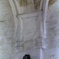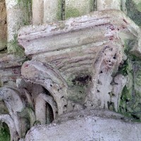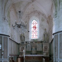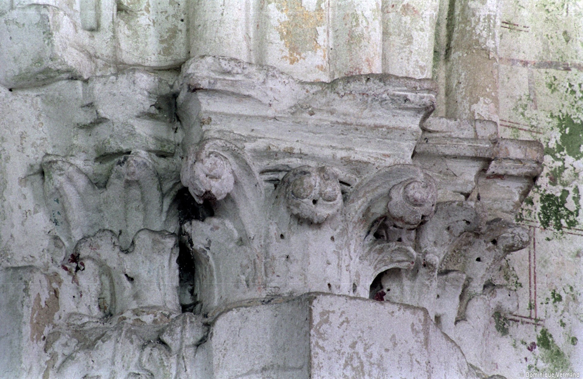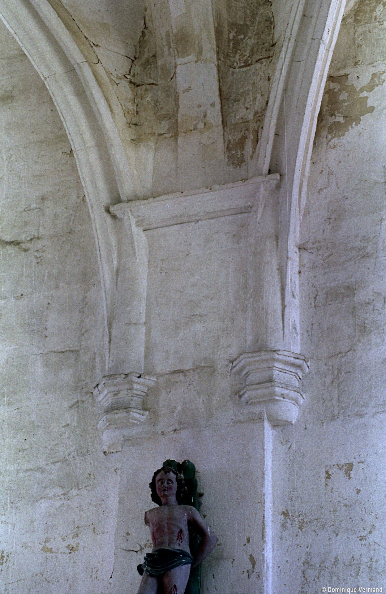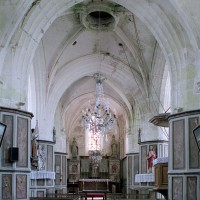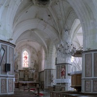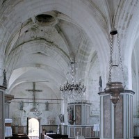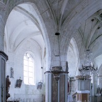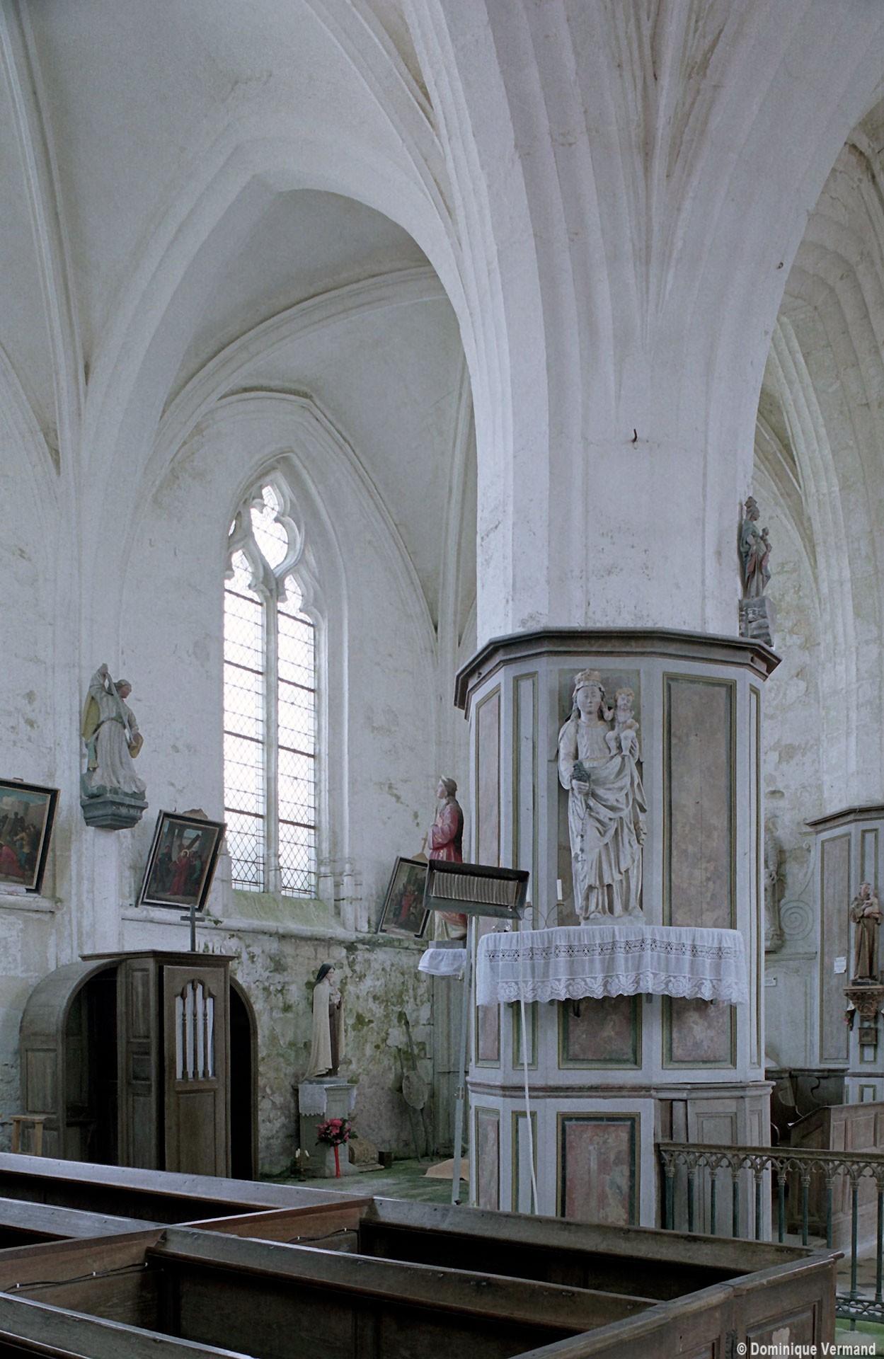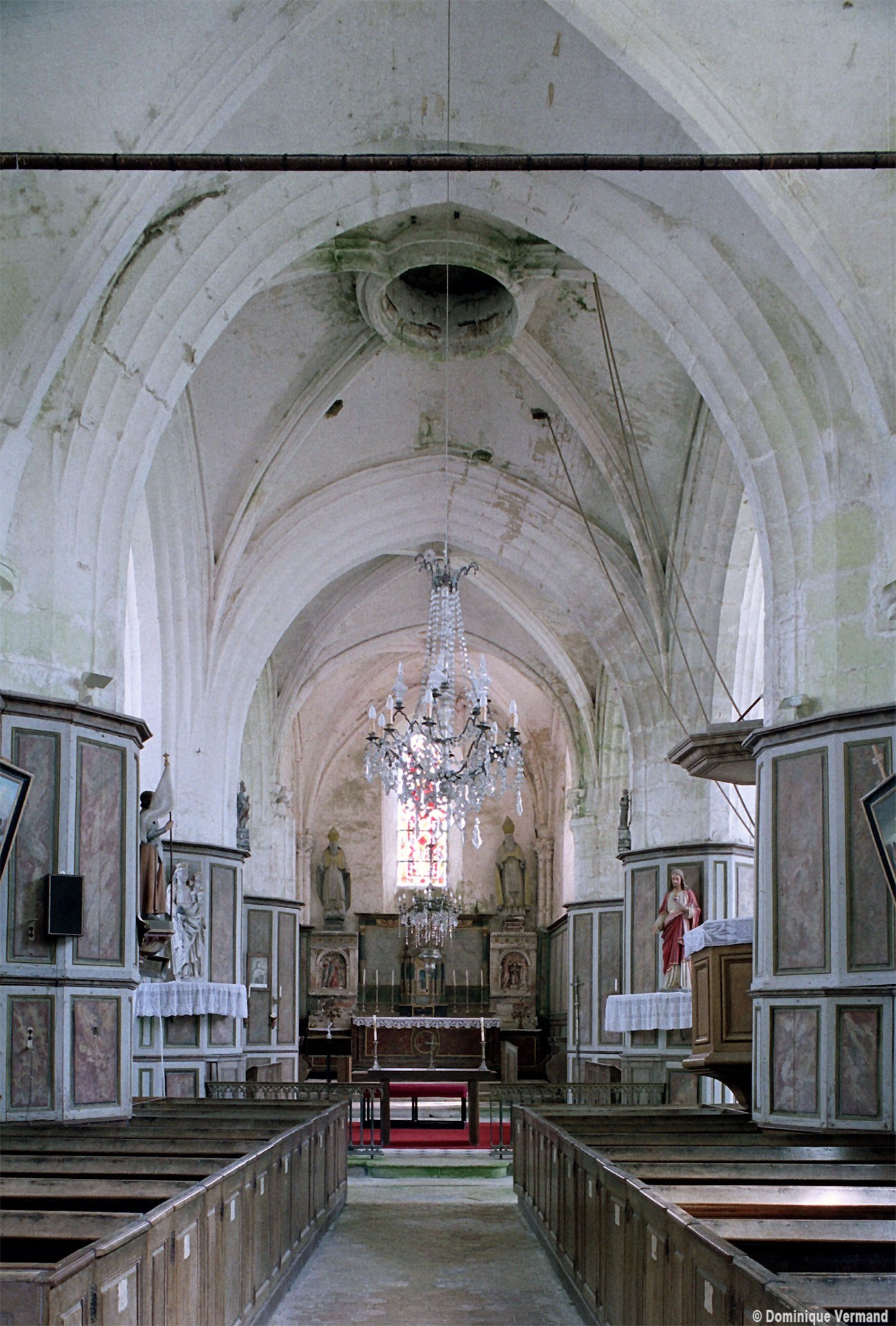 Saint-Martin se signale de loin par la puissante silhouette de son clocher, véritable môle à partir duquel se distribuent les différentes parties de l’église. Jusqu’au 16ème siècle, celle-ci associait une nef unique charpentée à un chœur de deux travées à chevet plat. Réduite aujourd’hui au deux tiers de sa longueur, la nef est d’origine romane. Quand à l’unique travée restante du chœur, c’est une construction très simple de la fin du 12ème siècle, voûtée d’ogives et éclairée par d’étroites lancettes. La disposition des chapiteaux à la retombée nord de l’arc doubleau qui introduit à cette travée de chœur prouve qu’une autre travée la précédait à l’origine. De très importants travaux vont en effet venir bouleverser l’église médiévale au 16ème siècle.