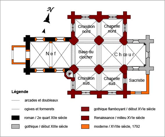 Se substituant au dernier tiers de la nef romane, quatre fortes piles sont alors construites pour servir d’assise au clocher, la première travée du chœur étant également reconstruite pour la circonstance. Ces deux travées introduisent, au nord et au sud, à deux chapelles de même longueur, l’ensemble formant en plan une sorte de double transept où toutes les voûtes sont portées à la même hauteur, disposition assez fréquente à une époque où l’on a très souvent le souci d’unifier les volumes.